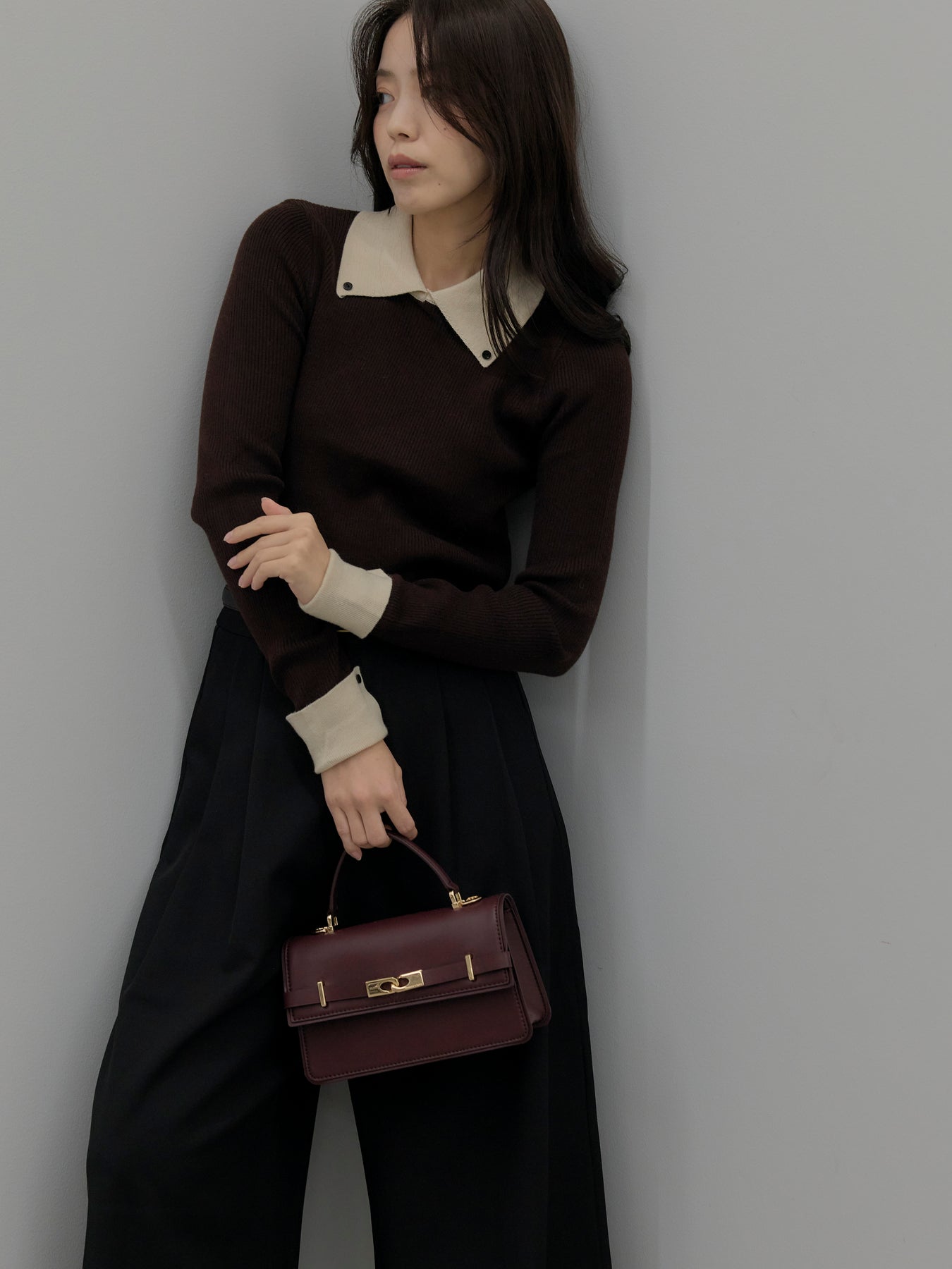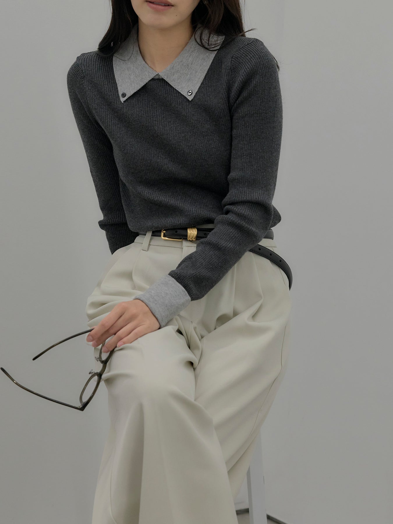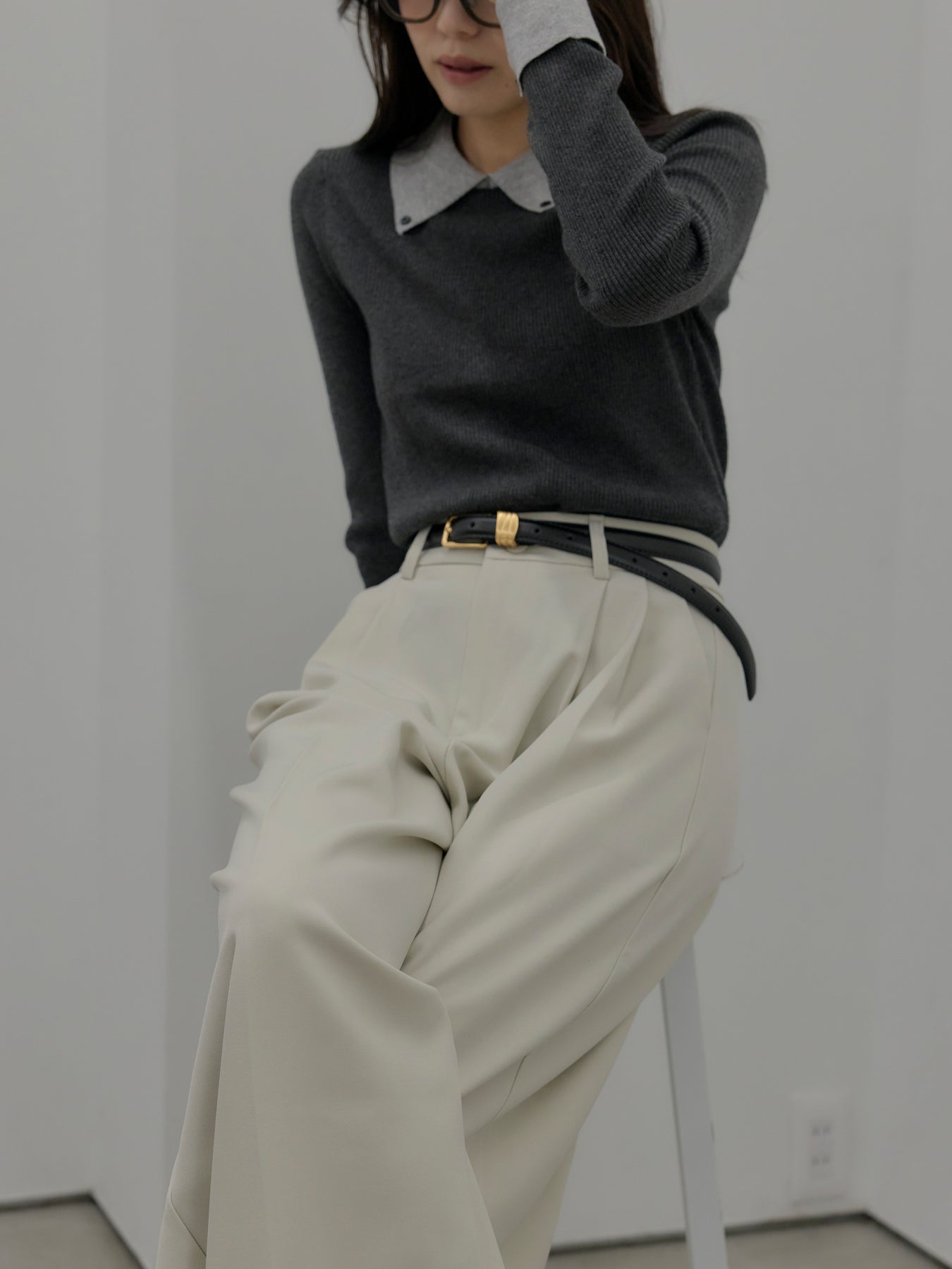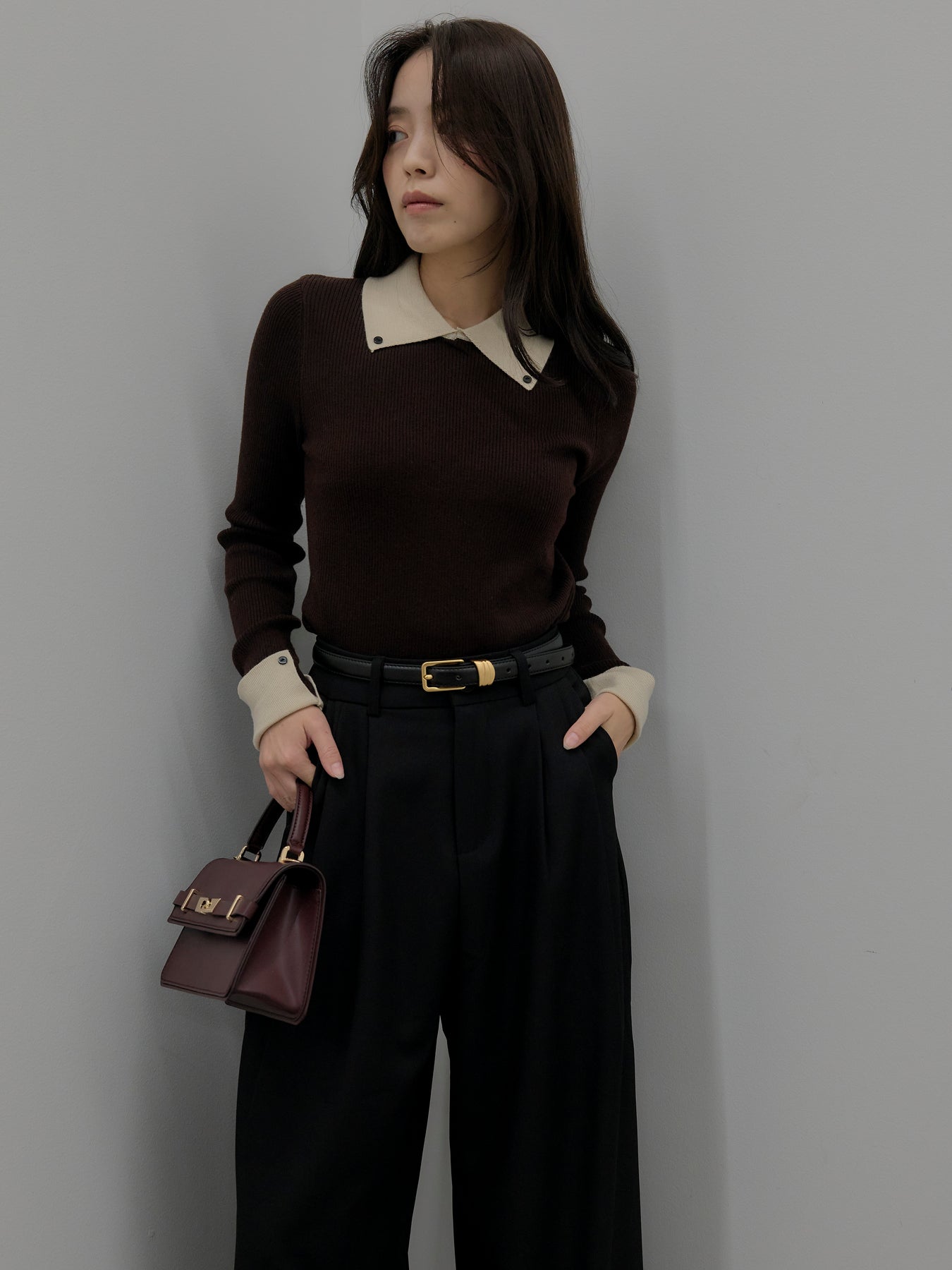 【SET】配色カフスニットポロ+デザインタックワイドパンツ(2set)