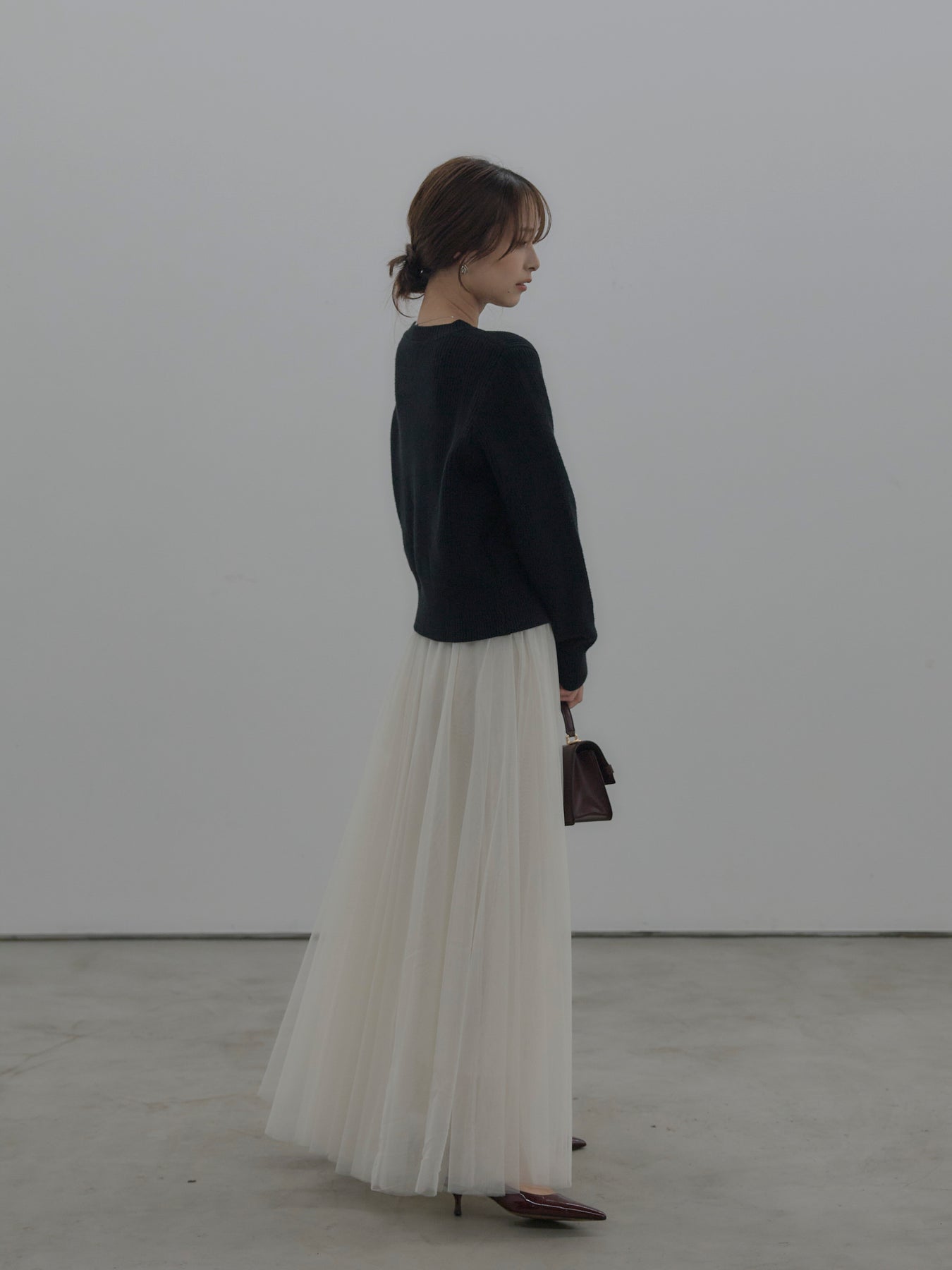 【モデル着用サイズ:M】重ねたチュールでボリュームたっぷりのスカートに仕上げました。振り向く瞬間、ドラマチックな裾の広がりに心躍ること間違いなし。オールシーズン使えてどんなアイテムとも好相性です。