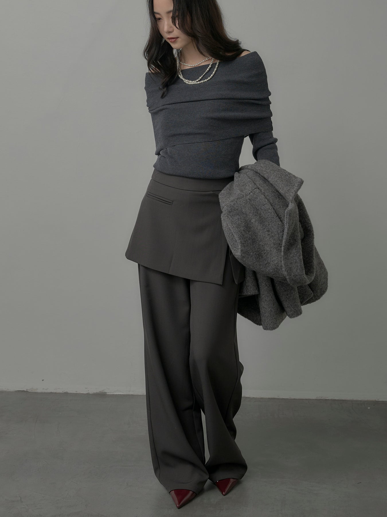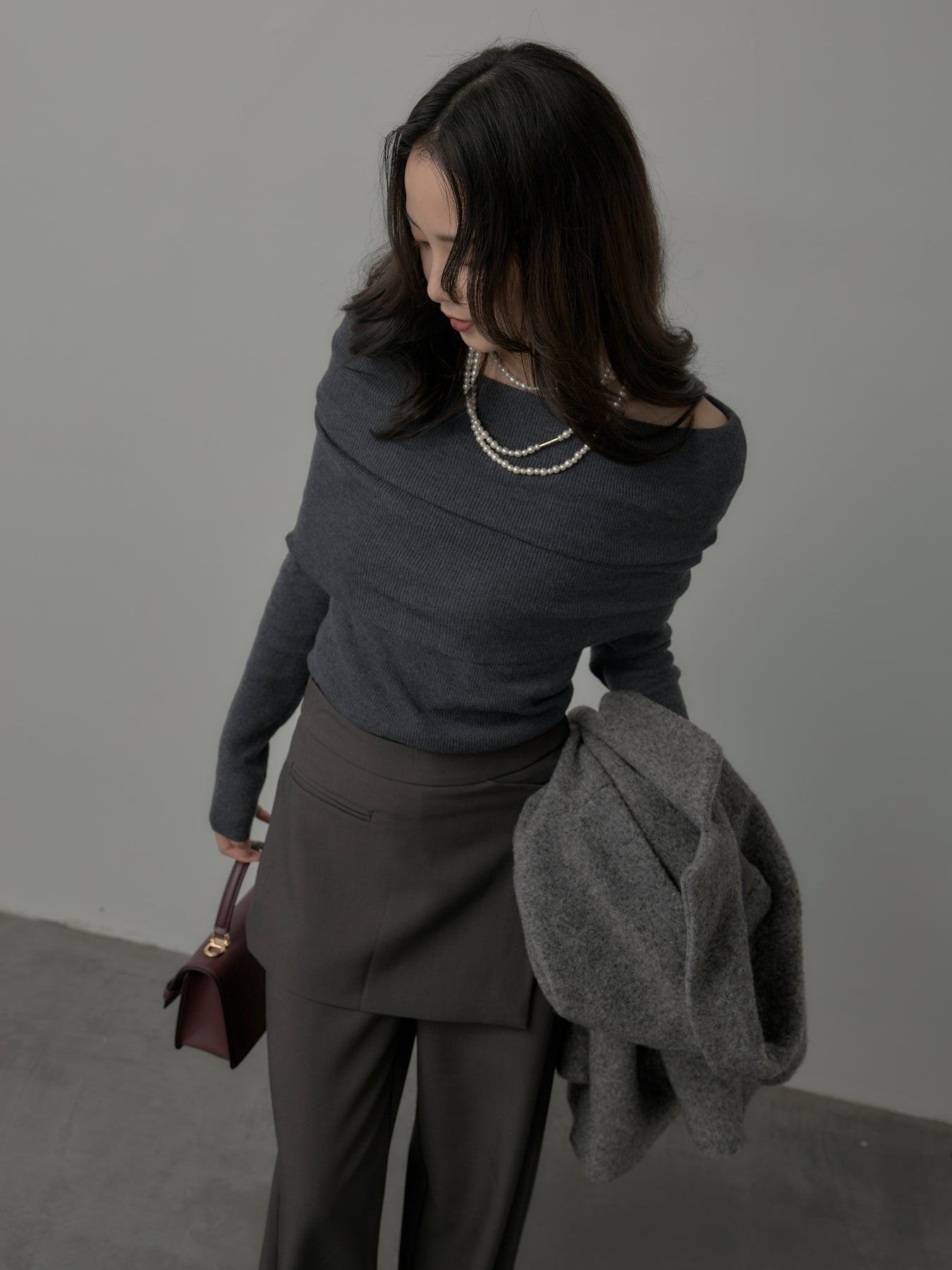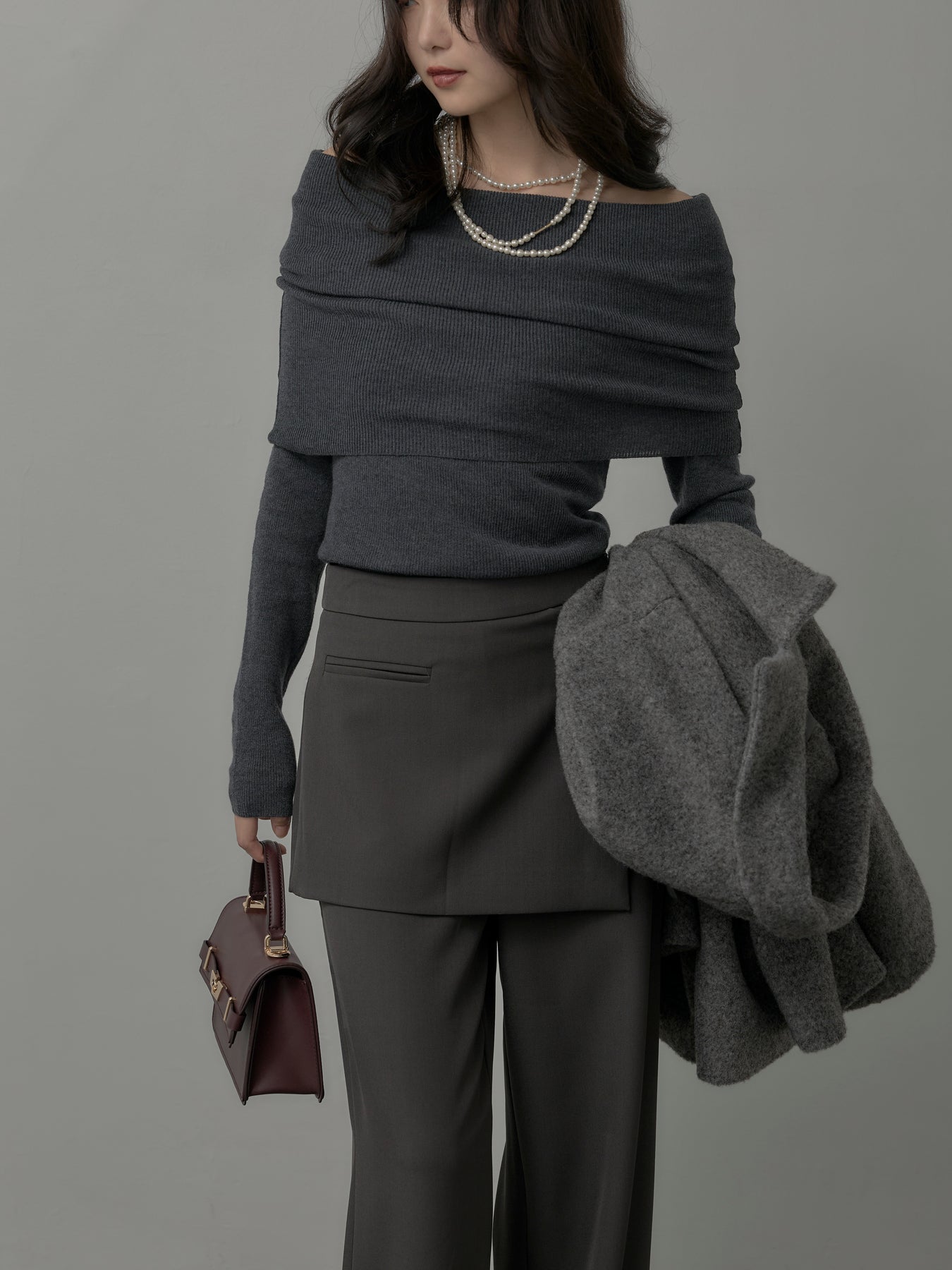 【SET】【Essential】オーバーサイズジャケットコート+オフショルリブニットトップス+ラップワイドパンツ(3set)