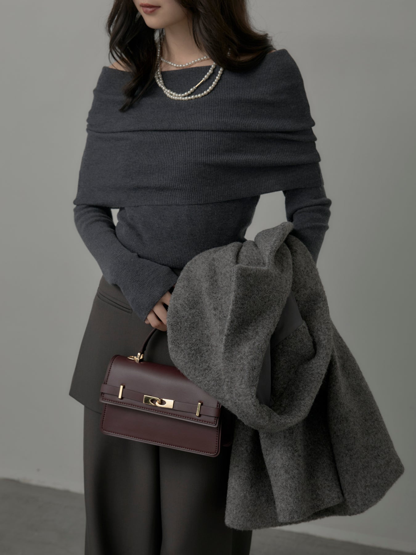 リブ編みが美しいシルエットを引き立てるオフショルトップス。肩を見せるデザインが女性らしさを演出し、スタイリングに抜け感をプラスします。