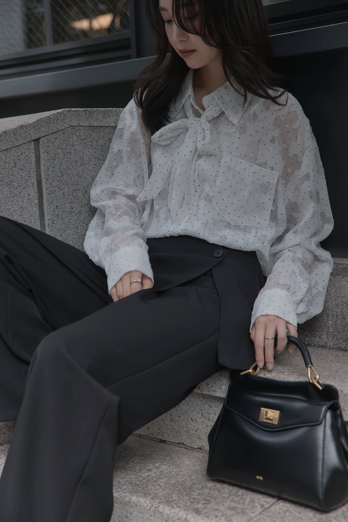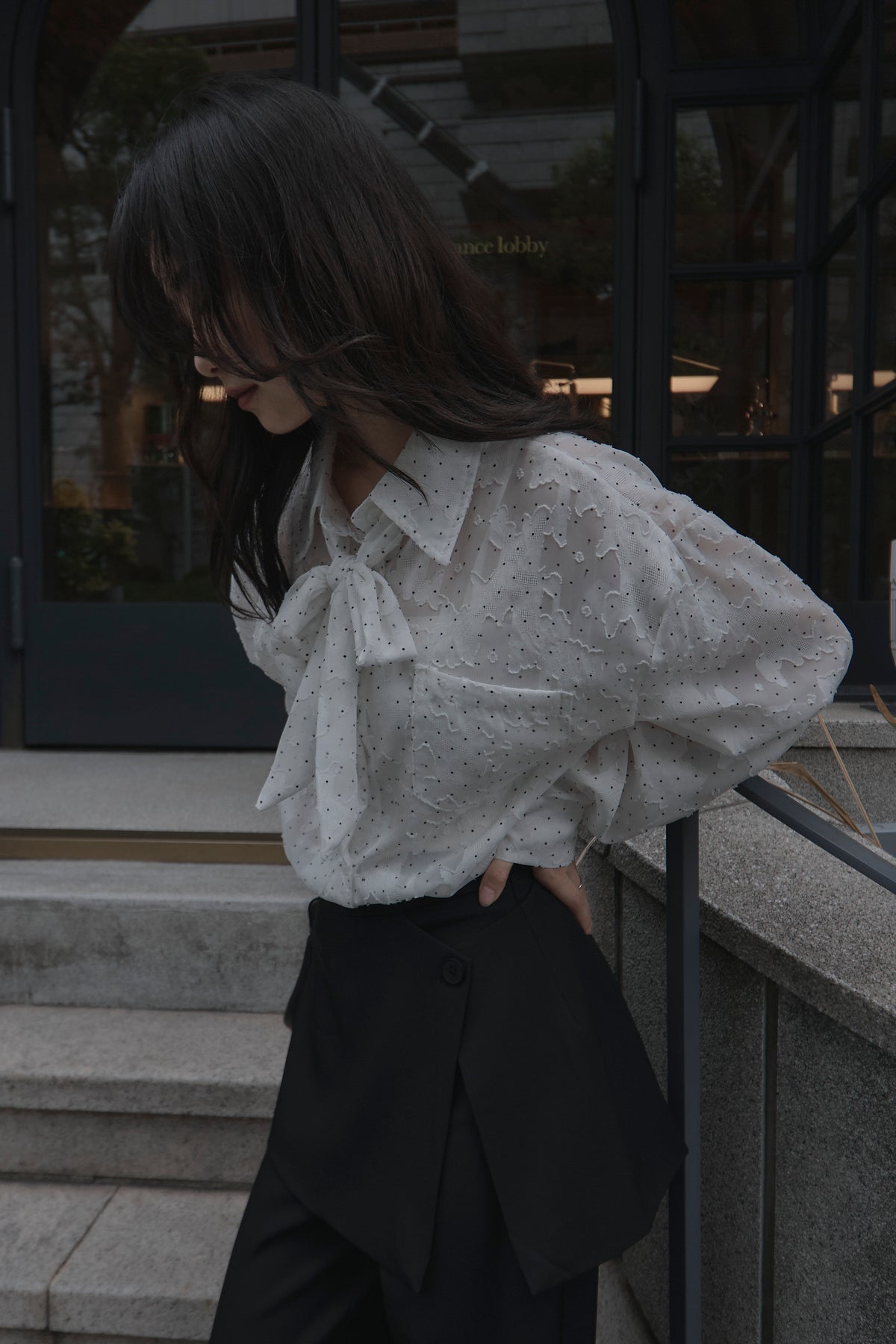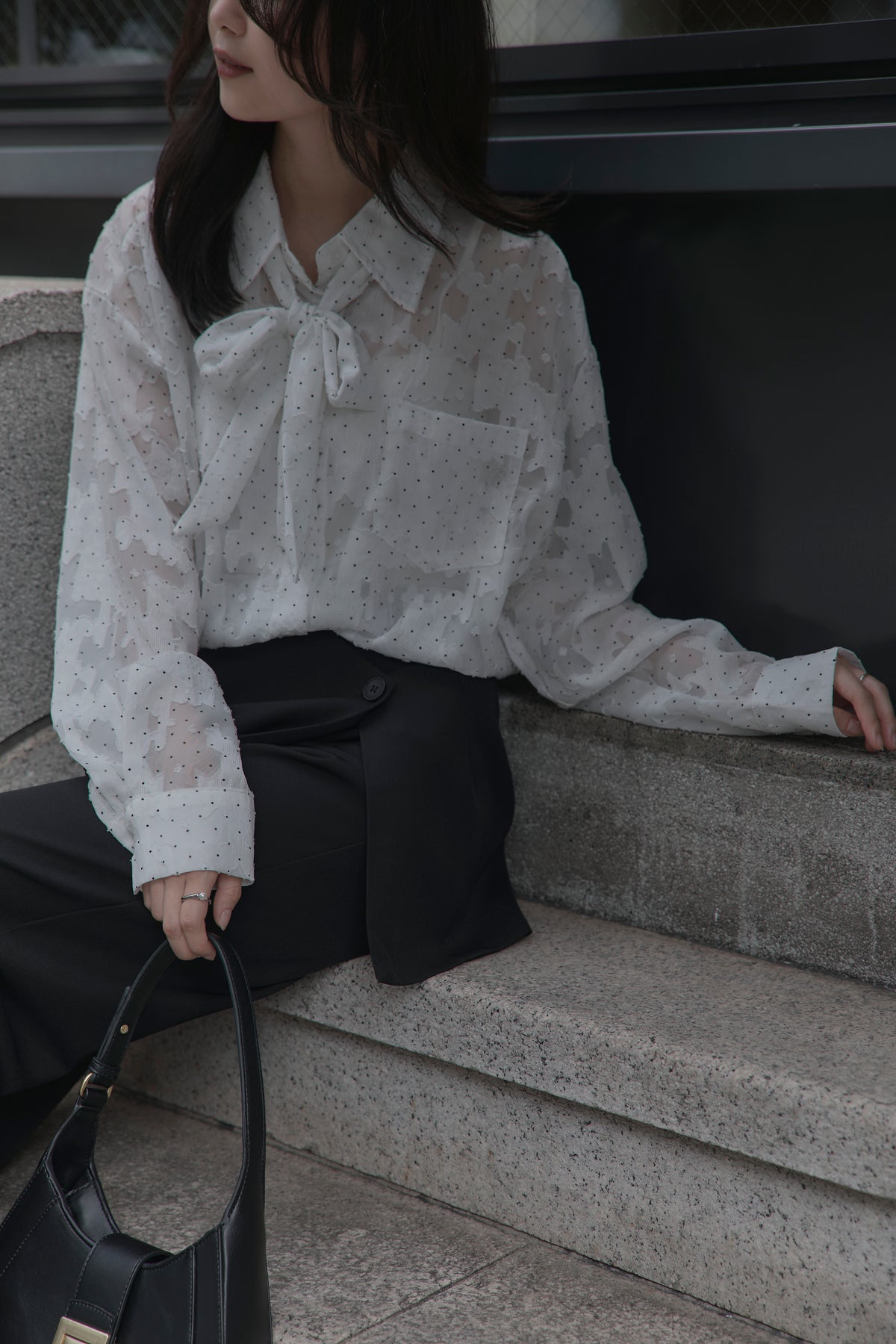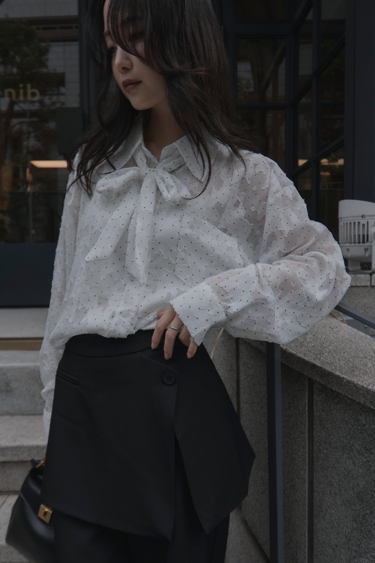美しいシアージャガード素材にドット柄を合わせたボウタイシャツデザイン。リボンなしで着ていただくのもシンプルでおすすめです。透け感のあるアイテムなので同色のインナーを合わせていただくと綺麗に纏まります。秋だけでなく春先にも活躍するアイテムです。