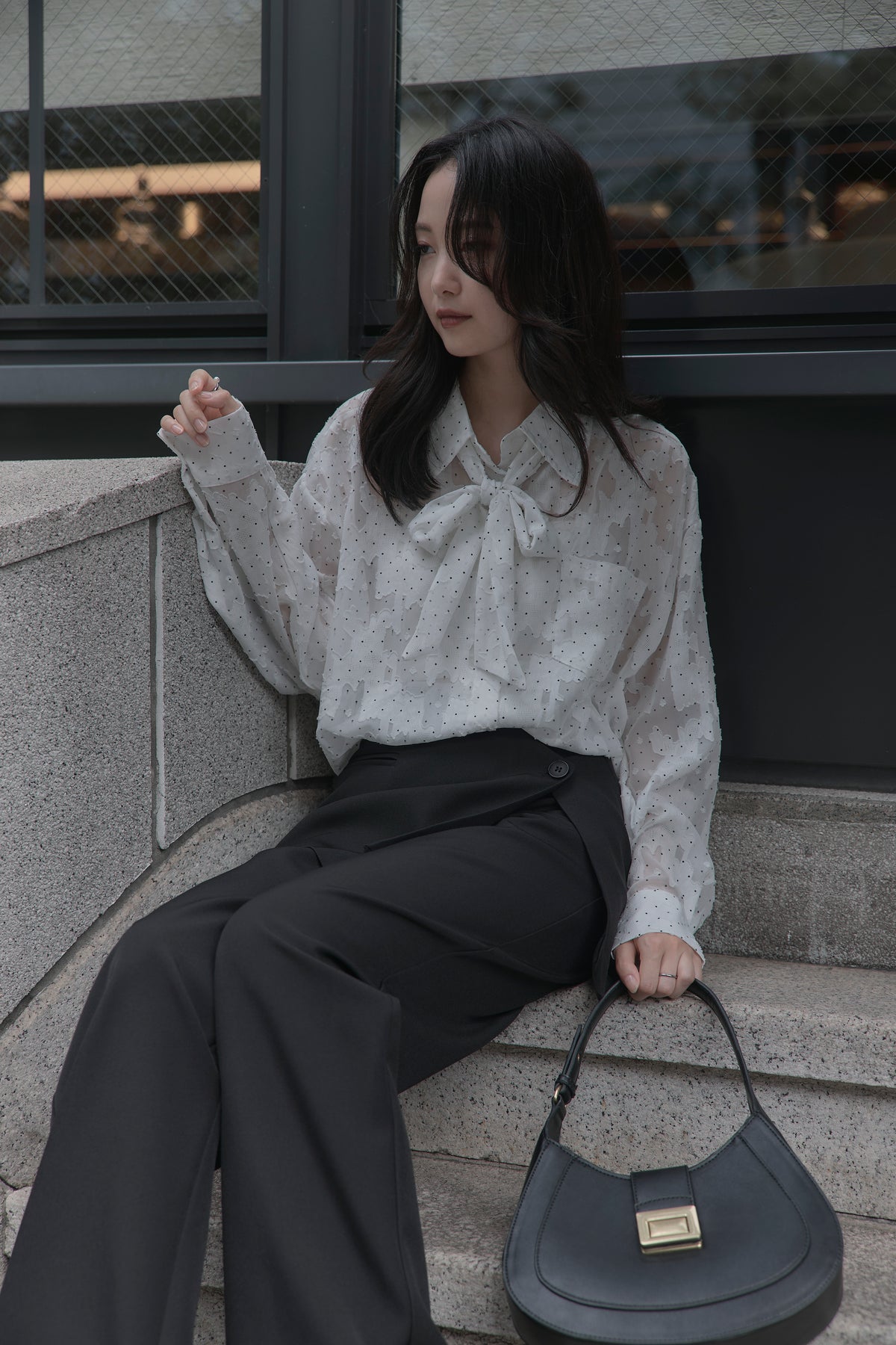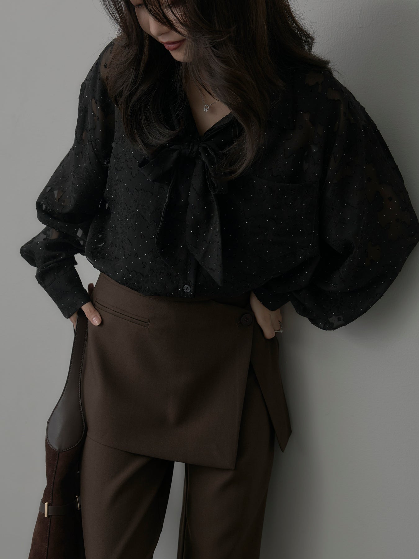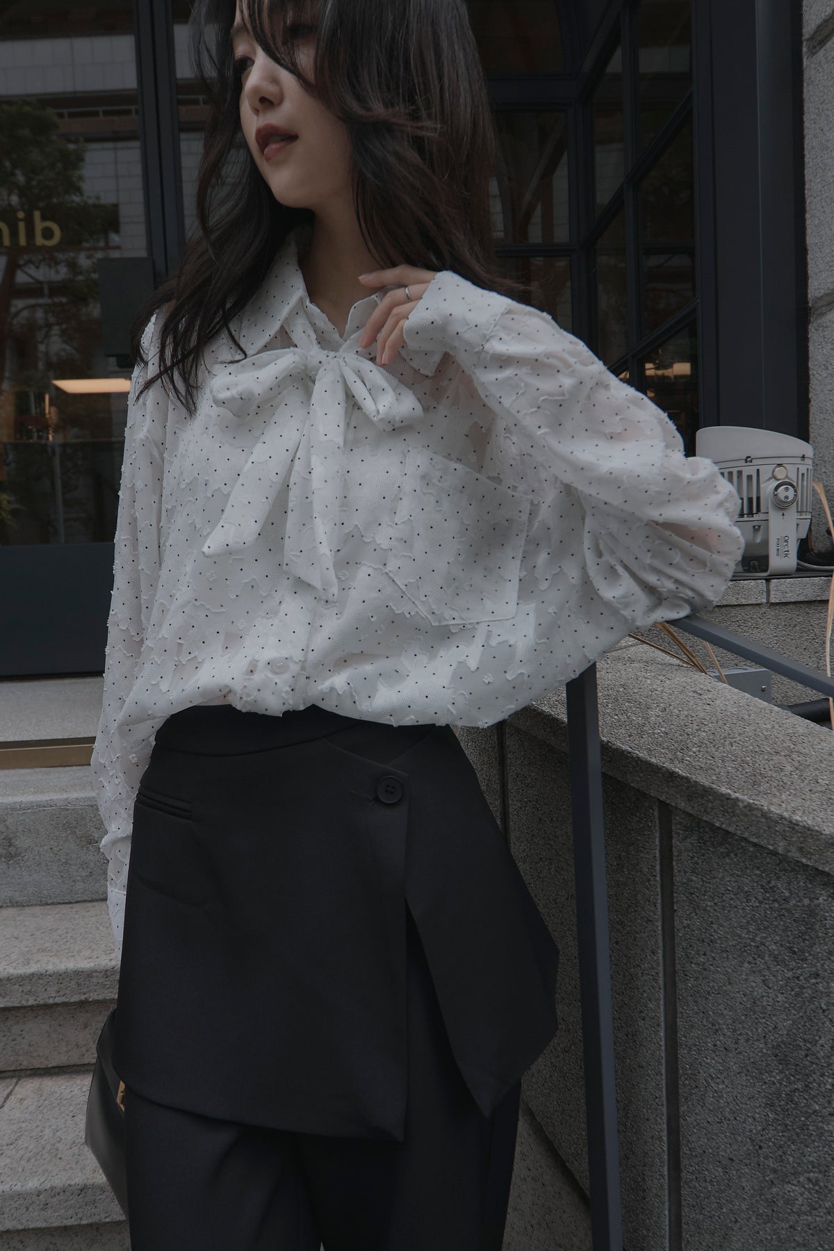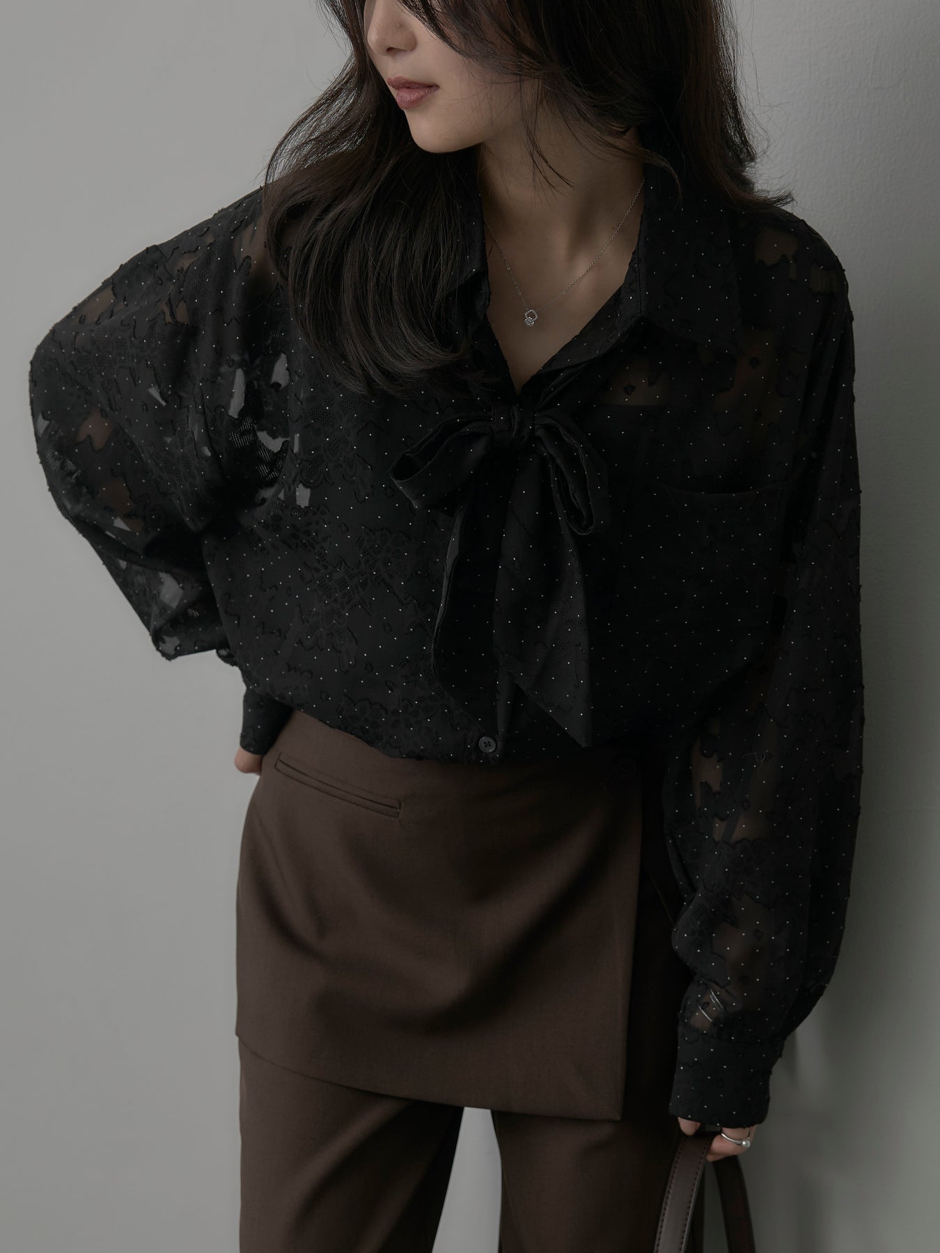 美しいシアージャガード素材にドット柄を合わせたボウタイシャツデザイン。リボンなしで着ていただくのもシンプルでおすすめです。透け感のあるアイテムなので同色のインナーを合わせていただくと綺麗に纏まります。秋だけでなく春先にも活躍するアイテムです。