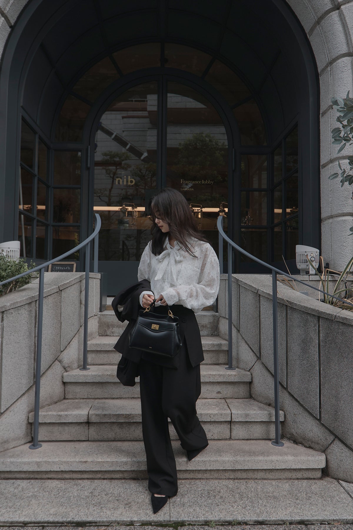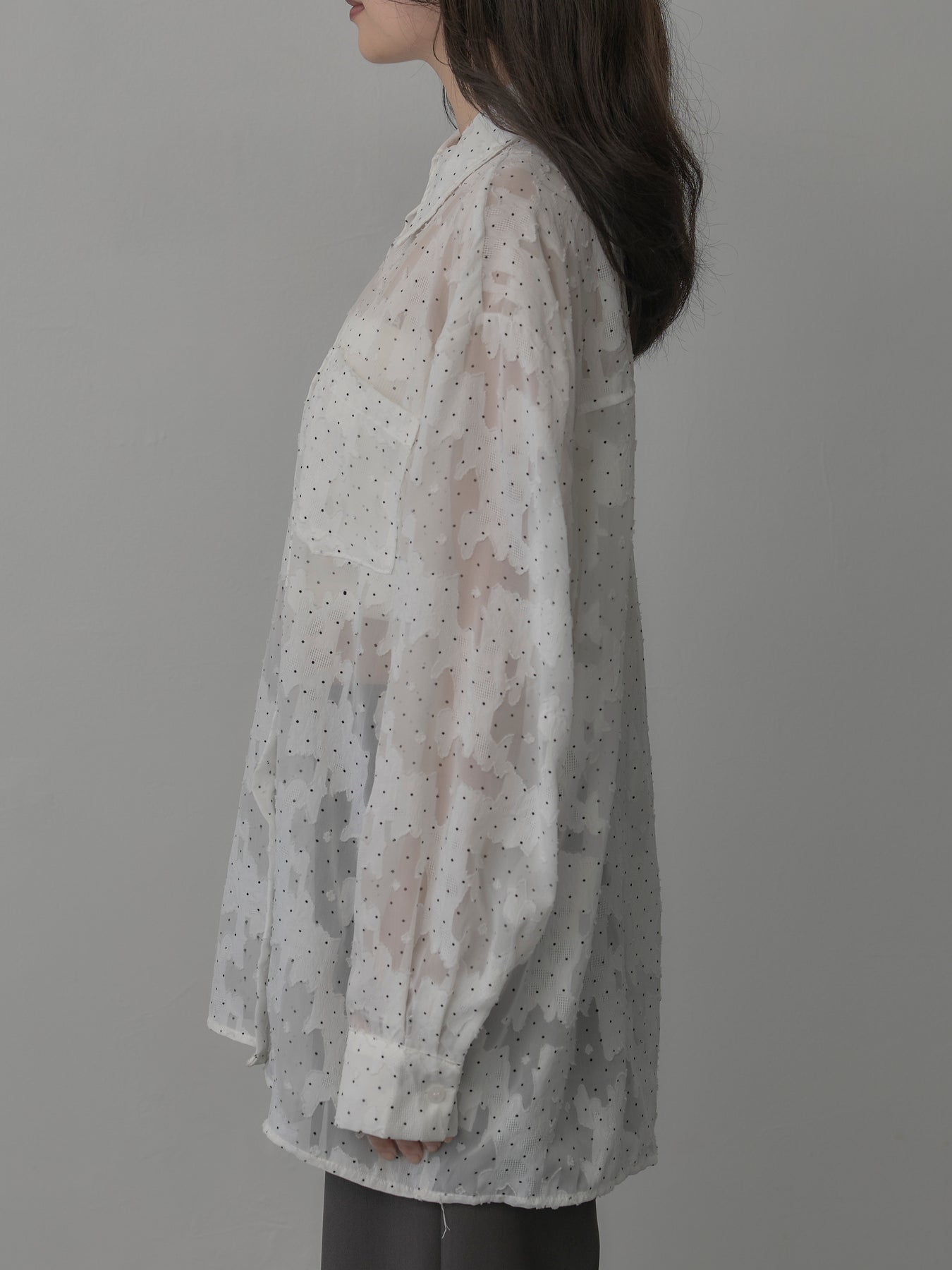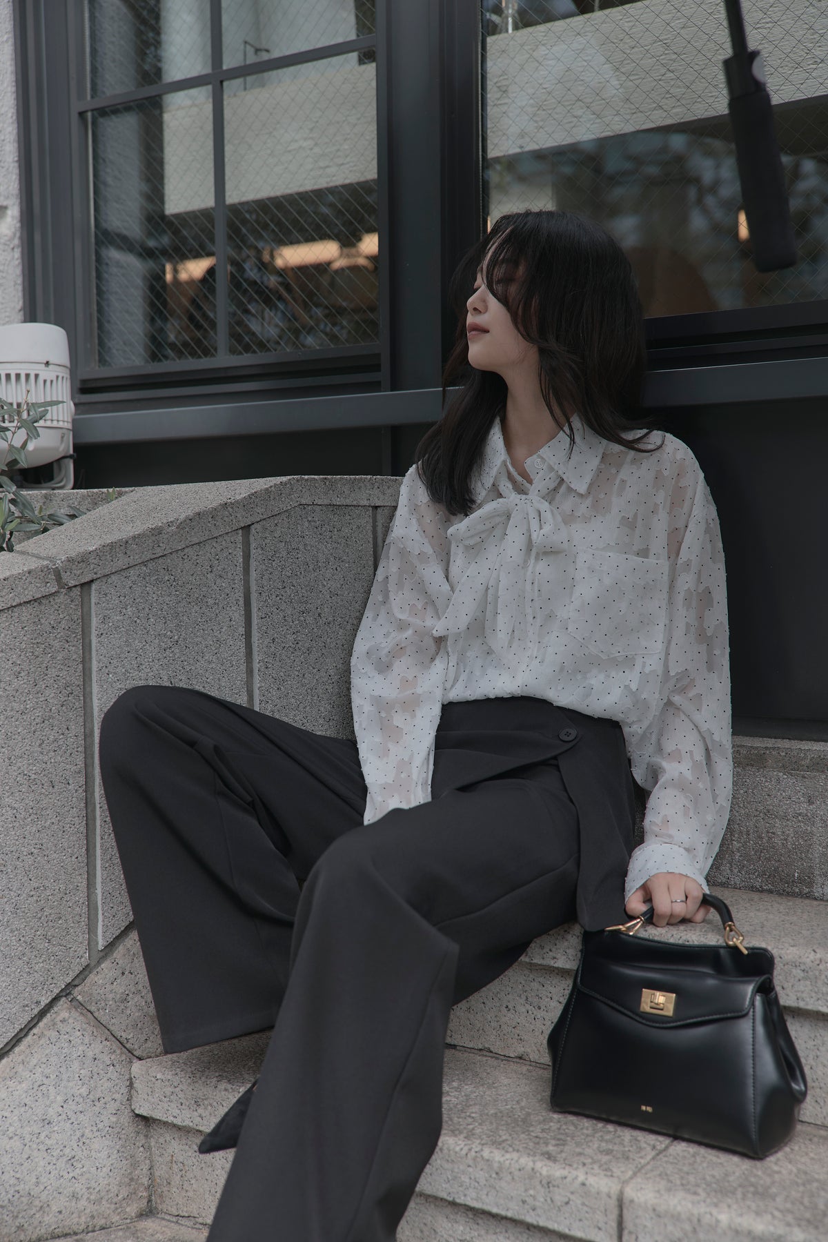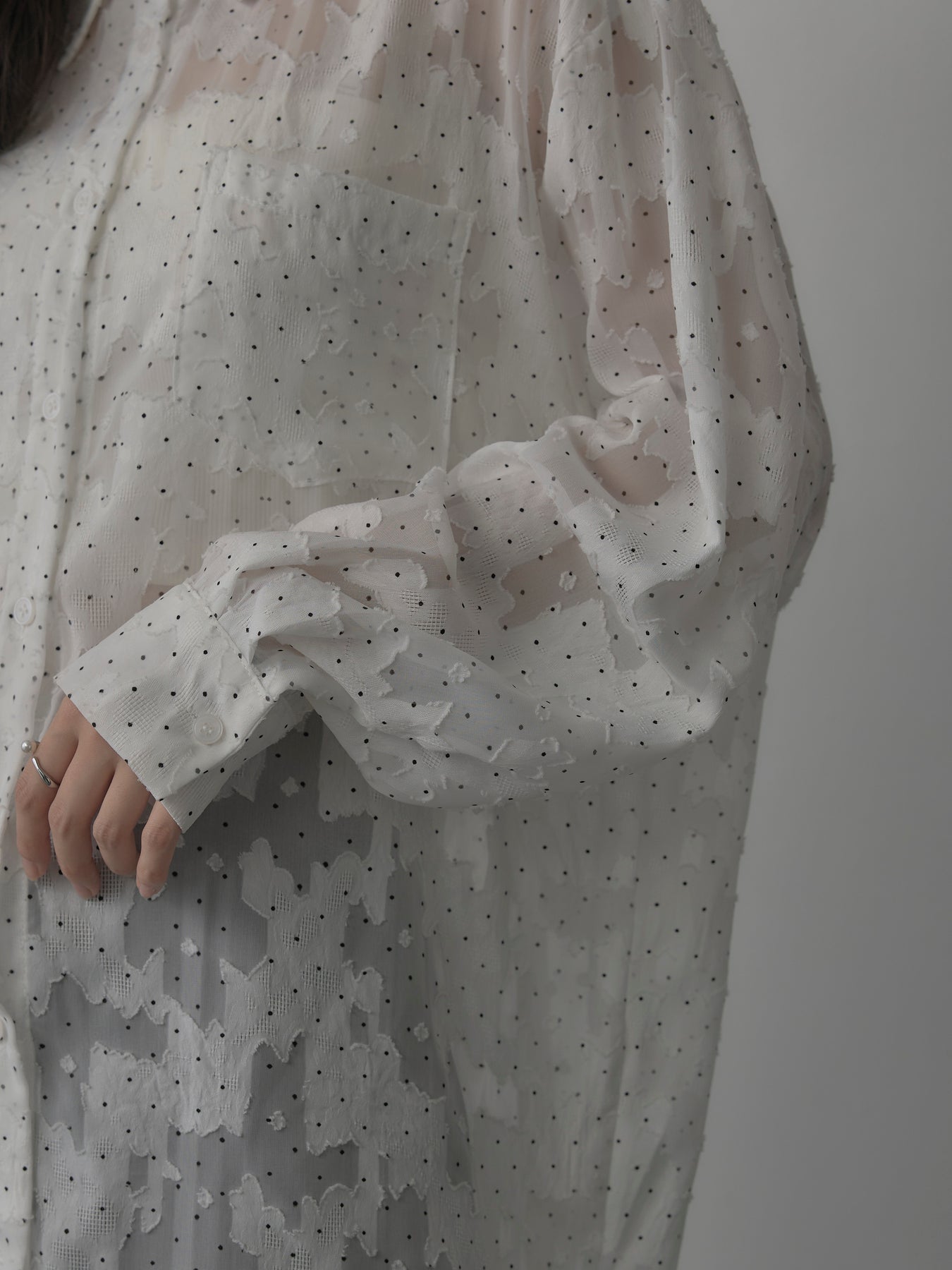 美しいシアージャガード素材にドット柄を合わせたボウタイシャツデザイン。リボンなしで着ていただくのもシンプルでおすすめです。透け感のあるアイテムなので同色のインナーを合わせていただくと綺麗に纏まります。秋だけでなく春先にも活躍するアイテムです。