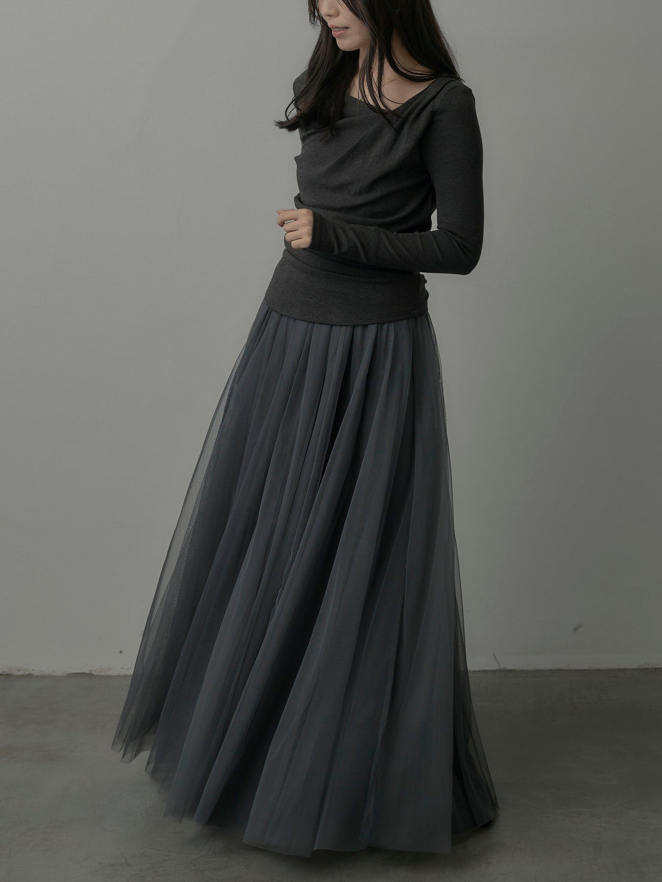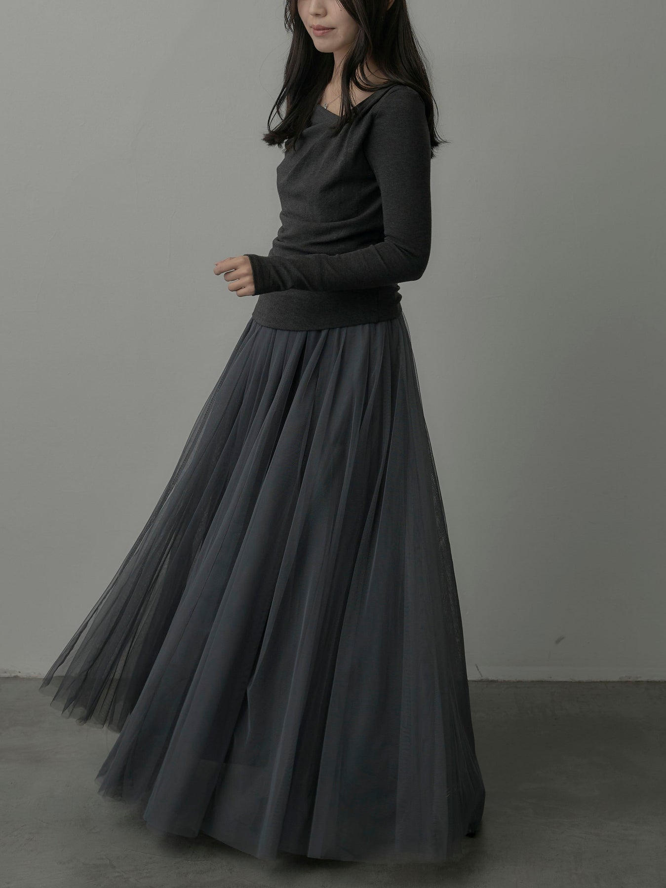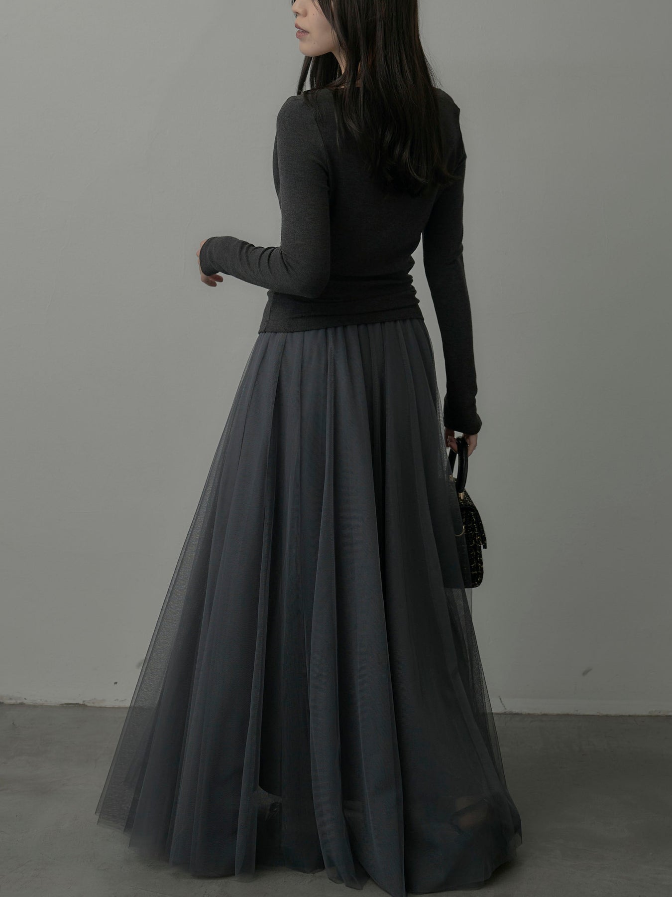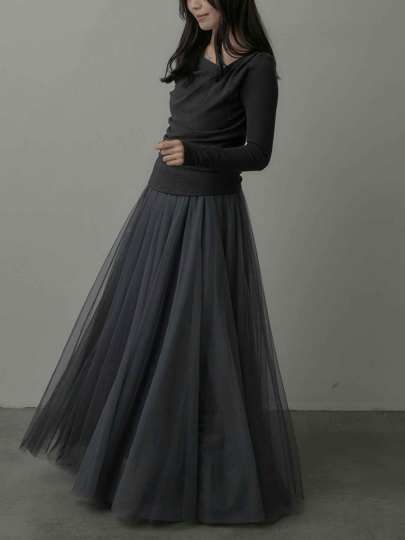 【モデル着用サイズ:M】重ねたチュールでボリュームたっぷりのスカートに仕上げました。振り向く瞬間、ドラマチックな裾の広がりに心躍ること間違いなし。オールシーズン使えてどんなアイテムとも好相性です。