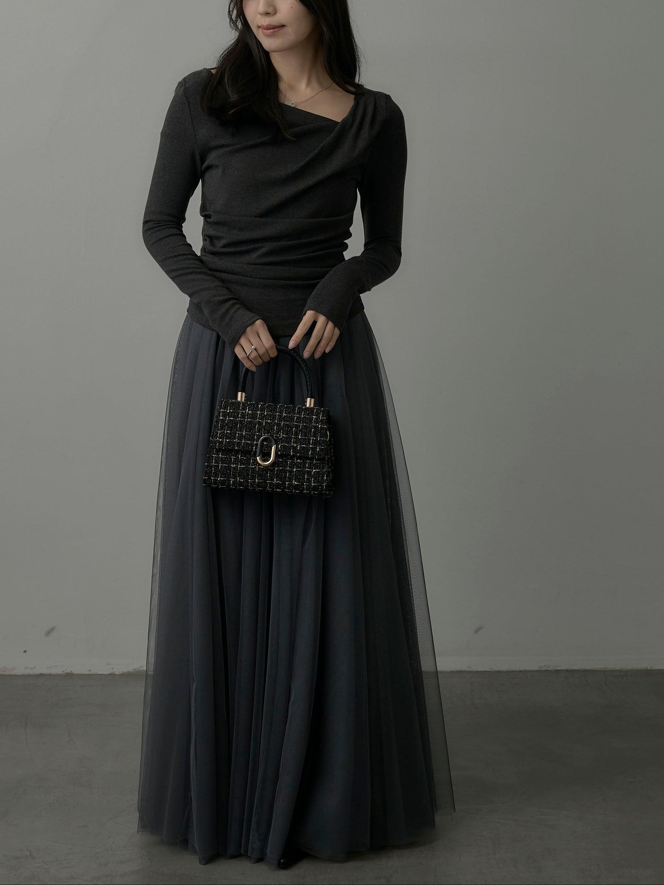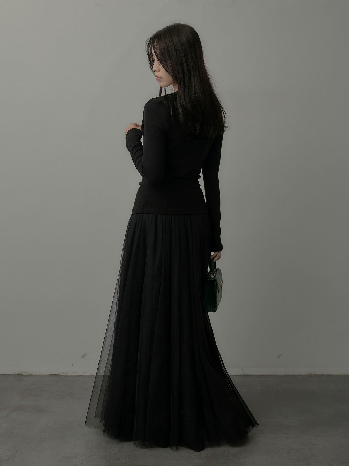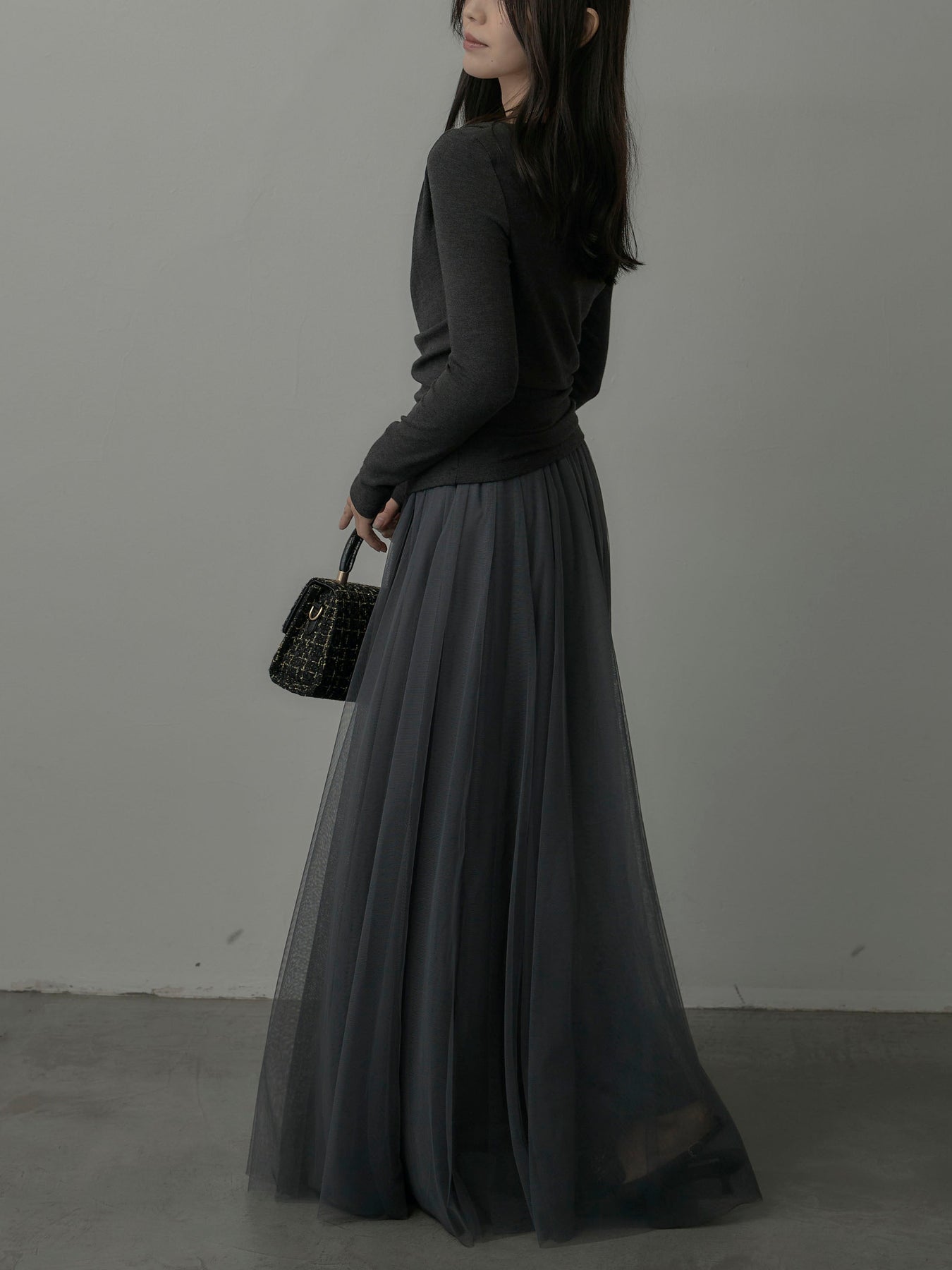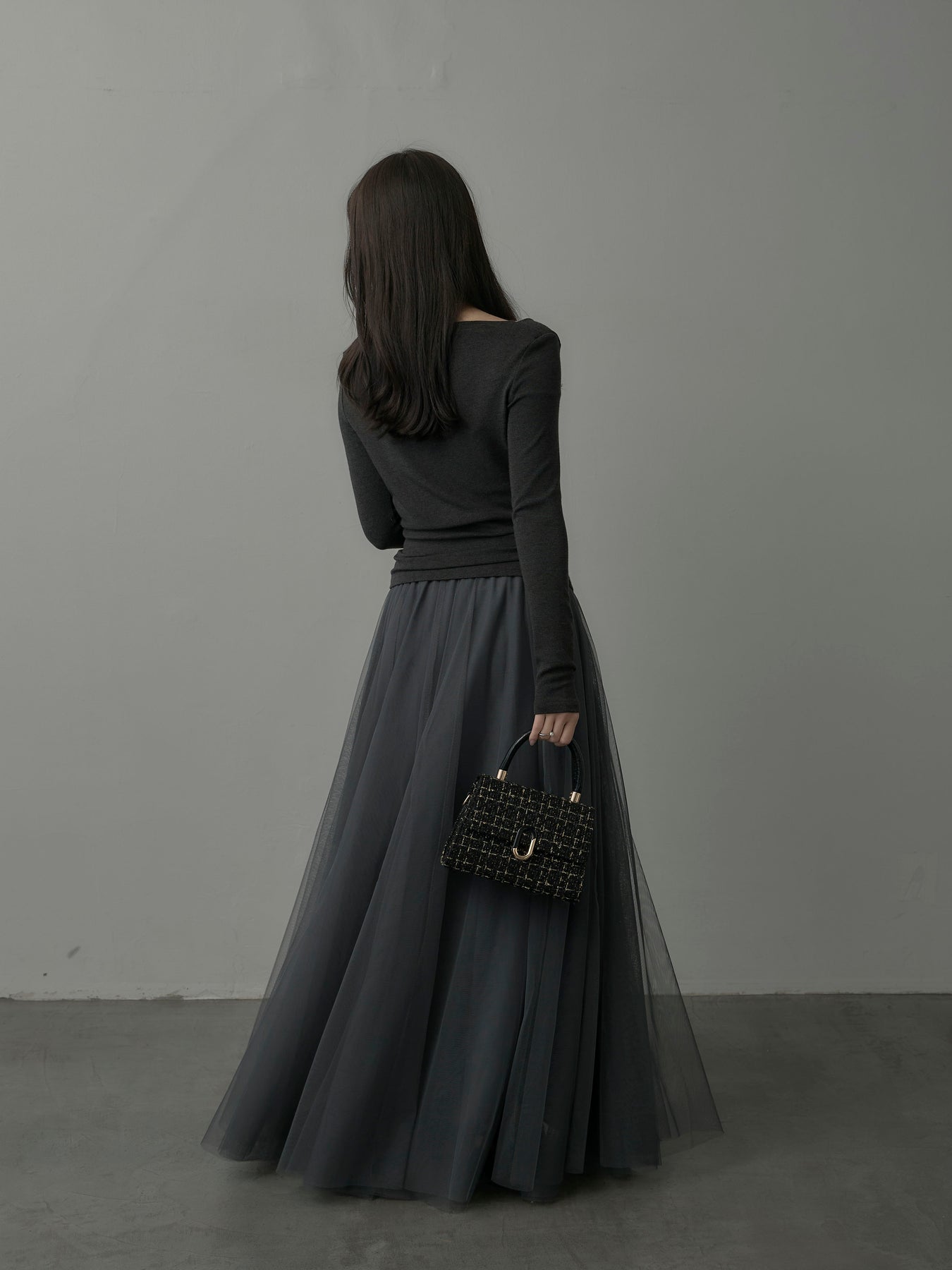 【モデル着用サイズ:M】重ねたチュールでボリュームたっぷりのスカートに仕上げました。振り向く瞬間、ドラマチックな裾の広がりに心躍ること間違いなし。オールシーズン使えてどんなアイテムとも好相性です。