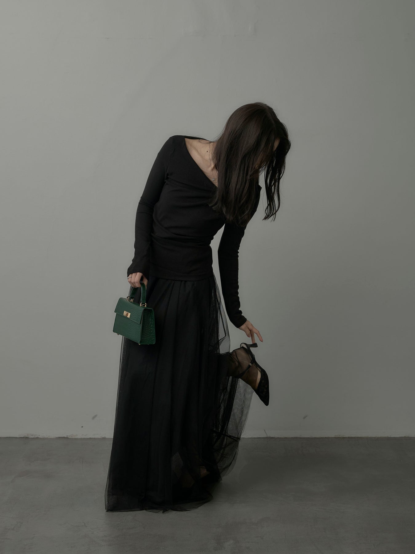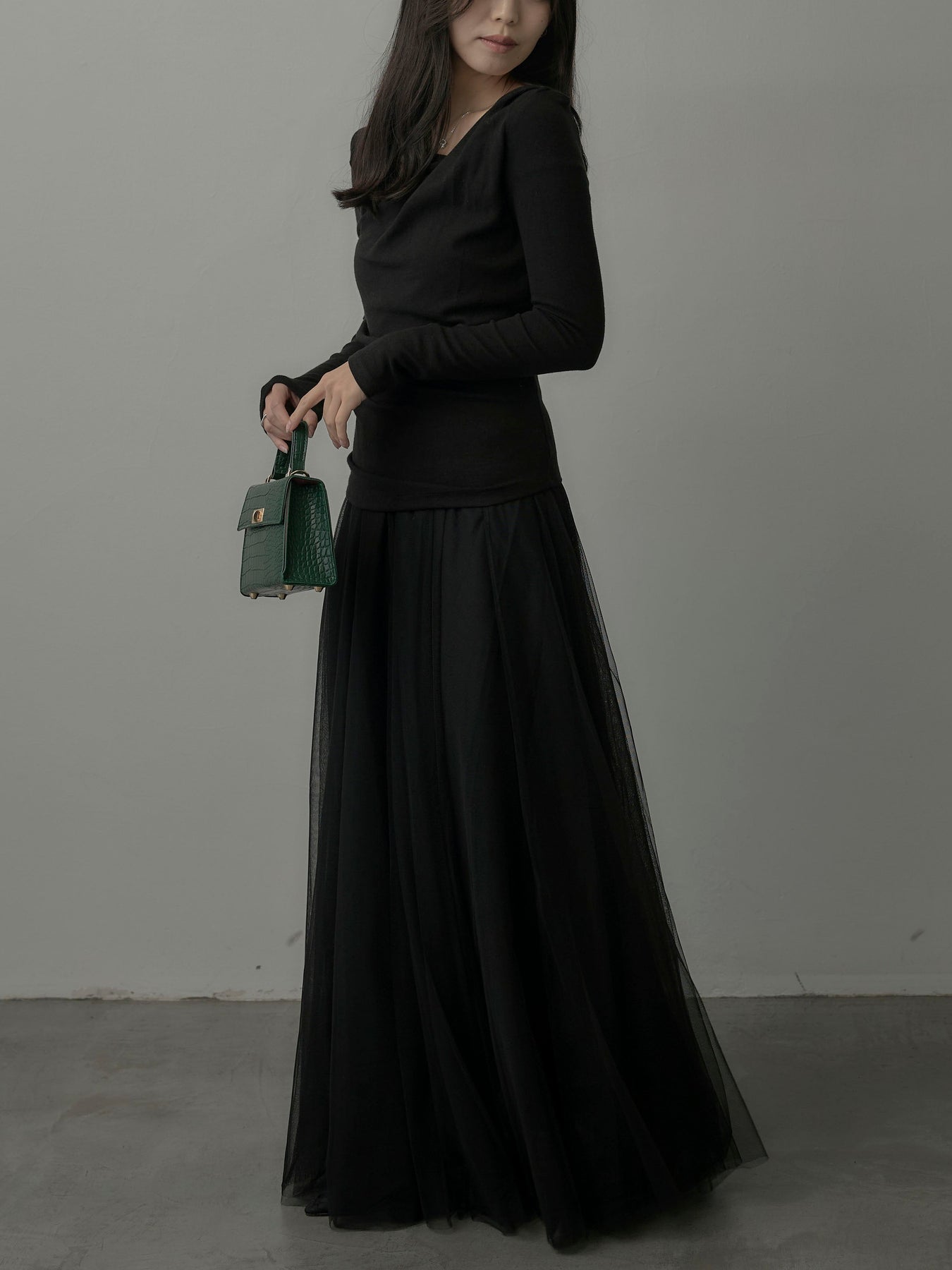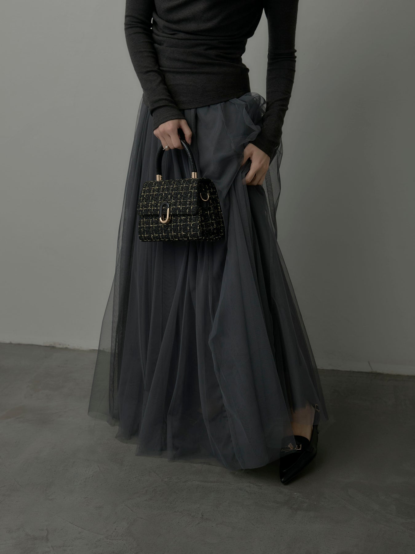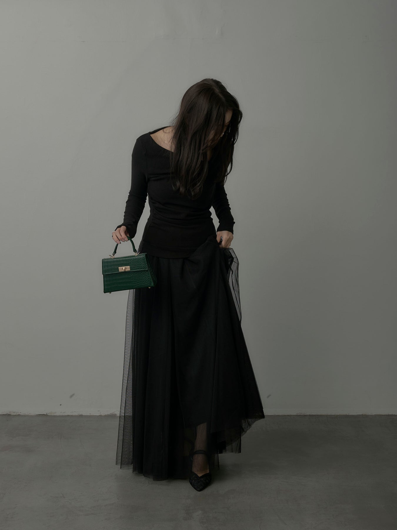 【モデル着用サイズ:M】重ねたチュールでボリュームたっぷりのスカートに仕上げました。振り向く瞬間、ドラマチックな裾の広がりに心躍ること間違いなし。オールシーズン使えてどんなアイテムとも好相性です。