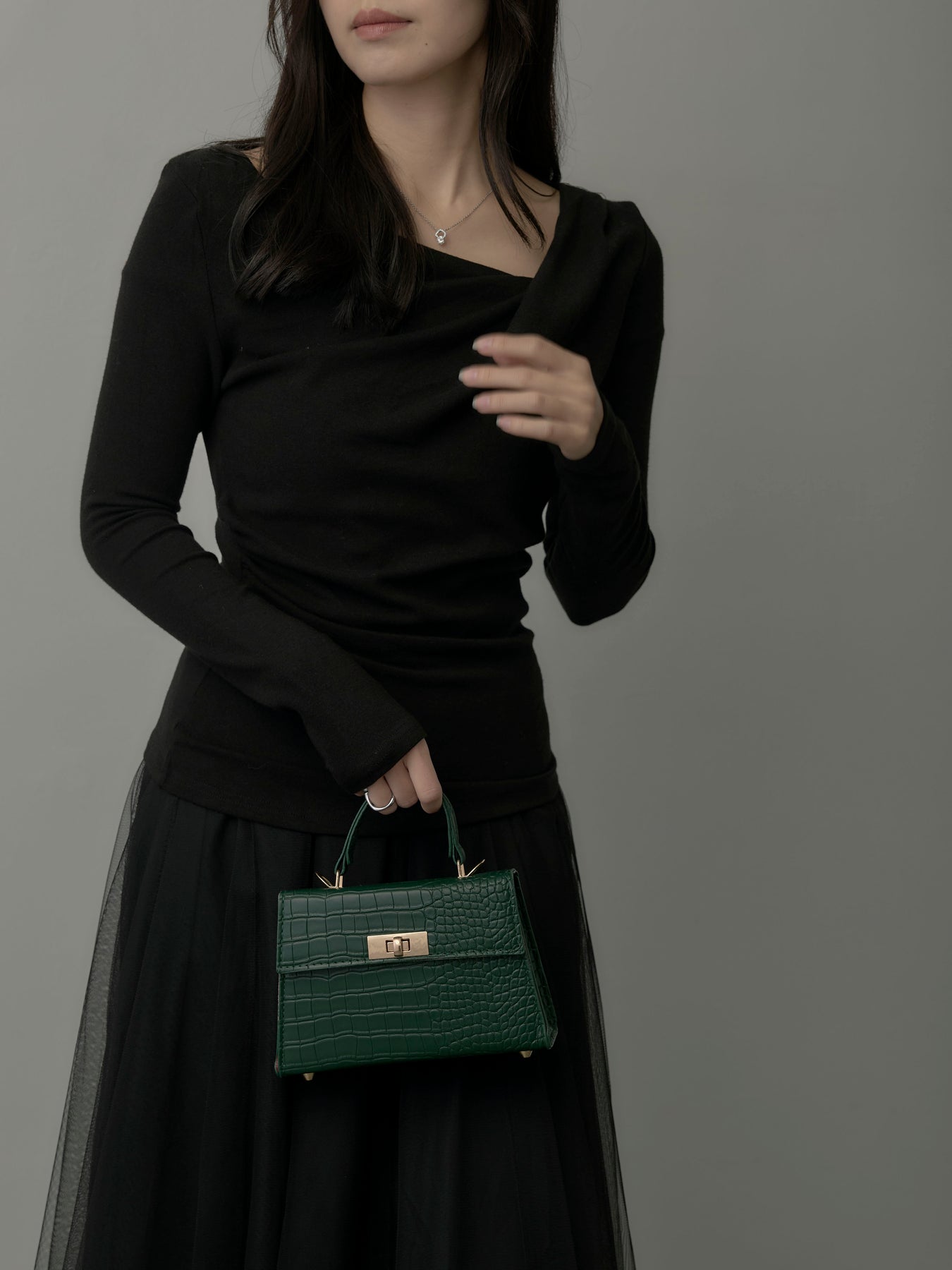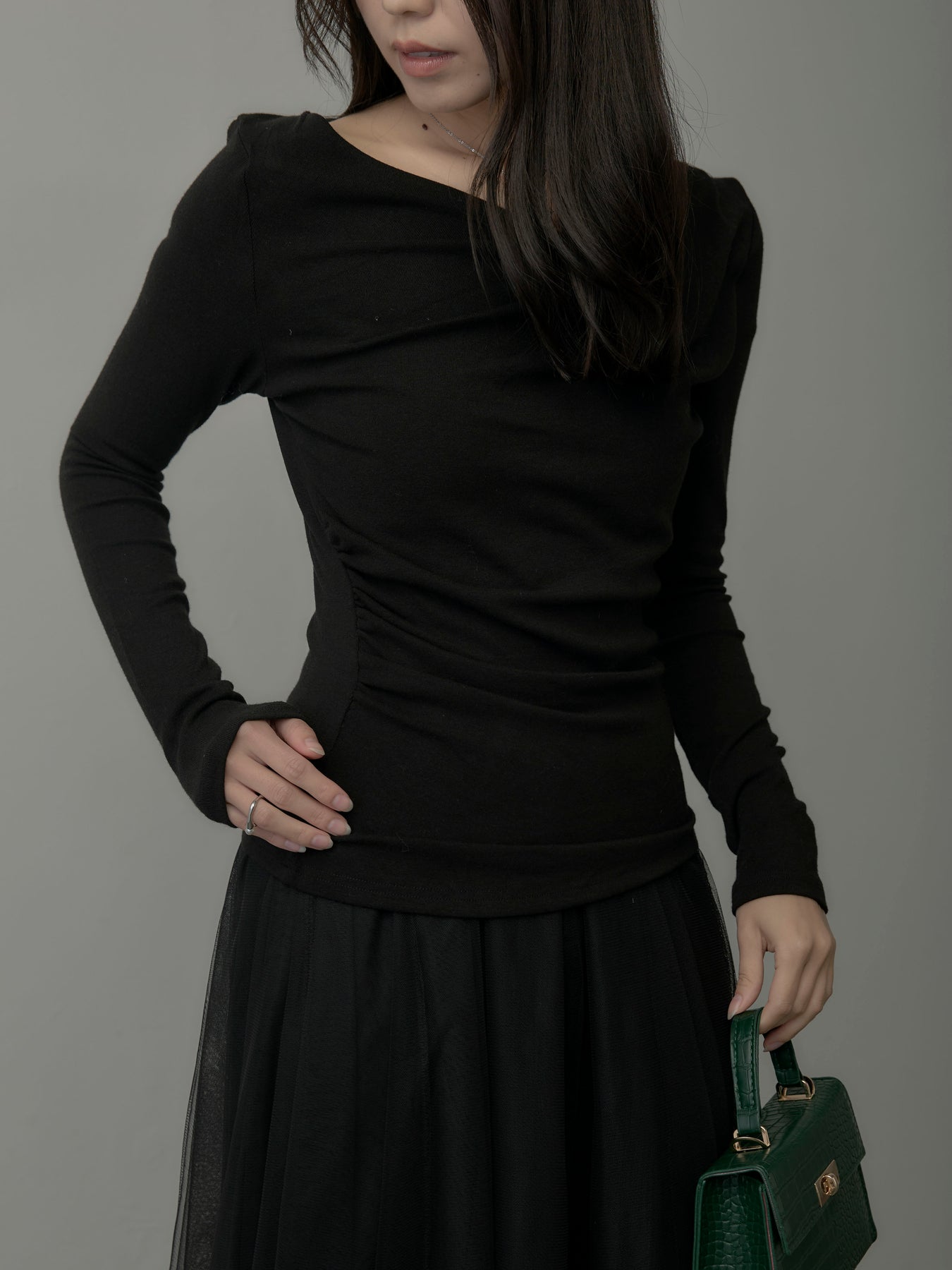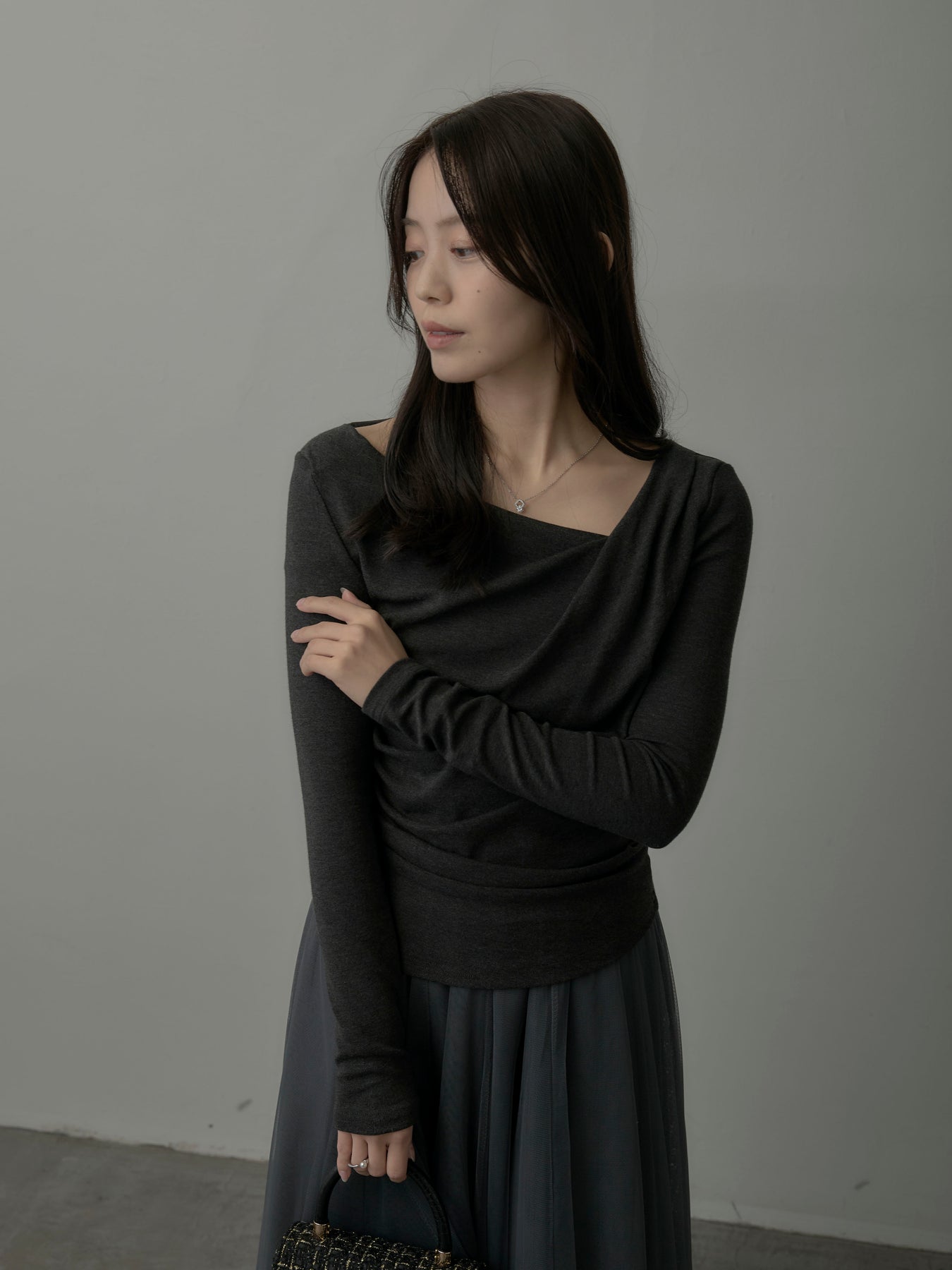 立体感のあるドレープが目を惹くデザイントップス。柔らかな生地が体に沿い、自然な陰影で上品な印象をプラス。シンプルながらも存在感があり、スカートにもパンツにも好相性な一枚。