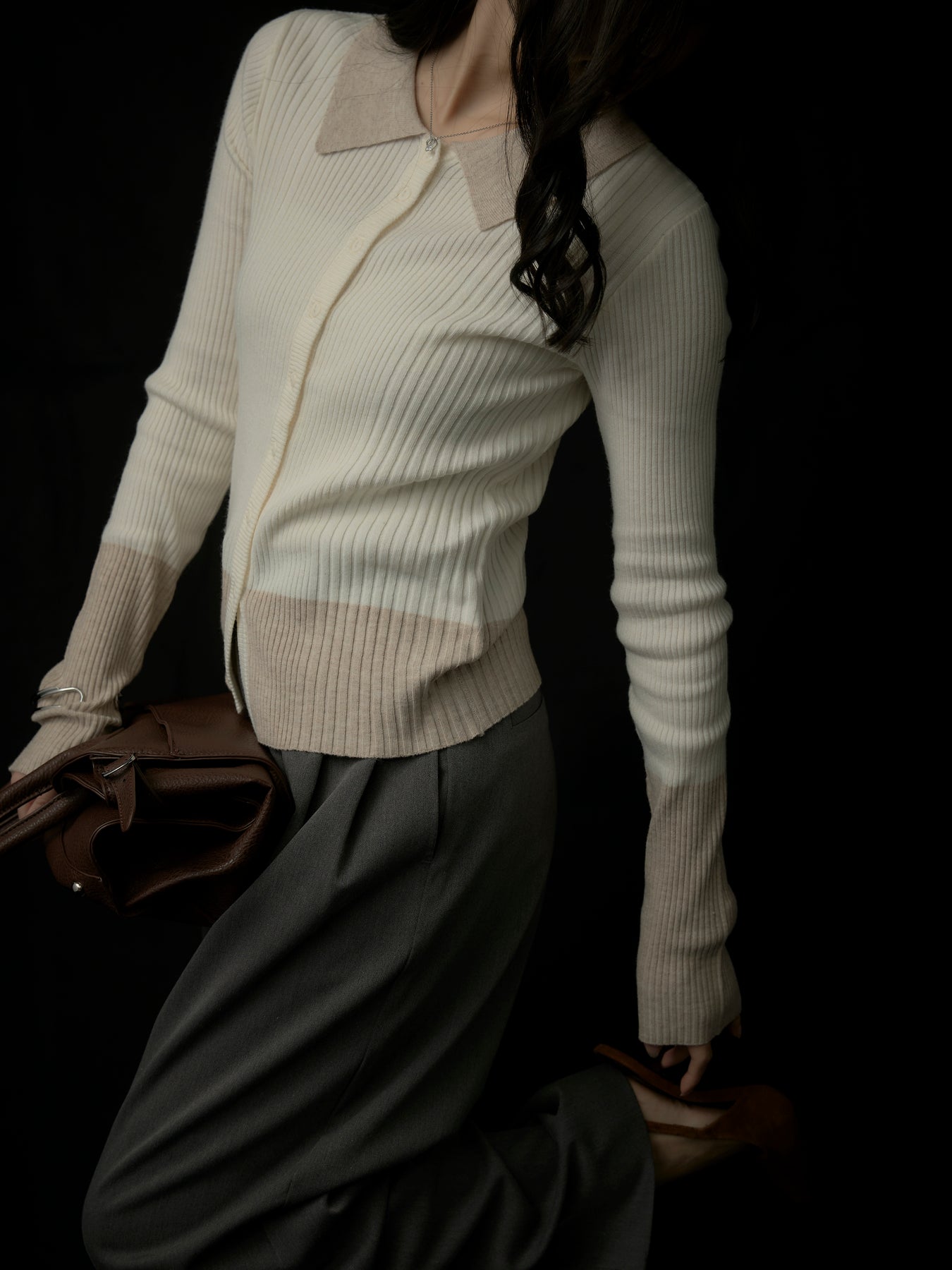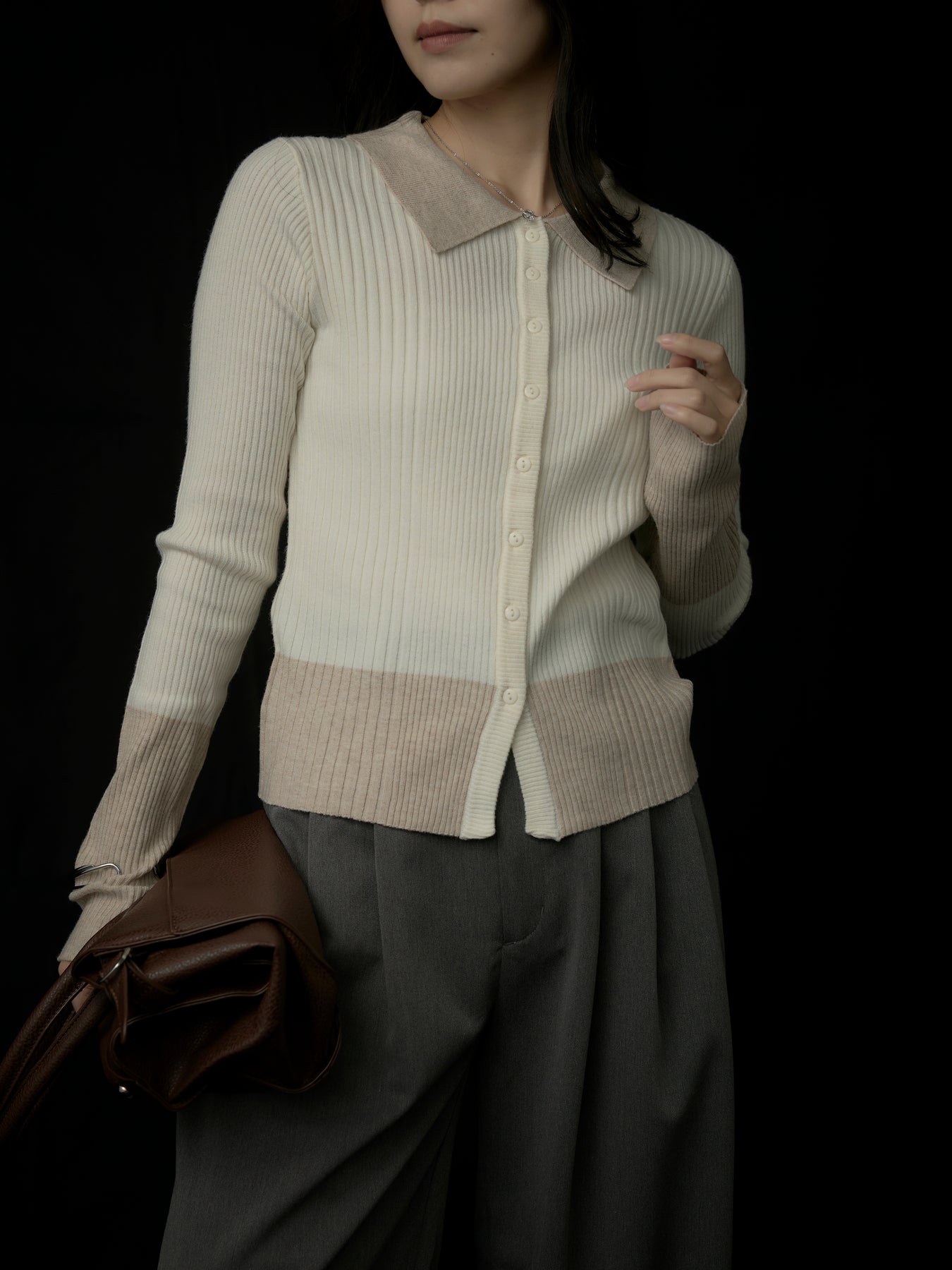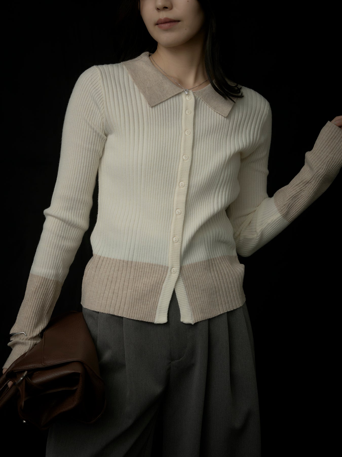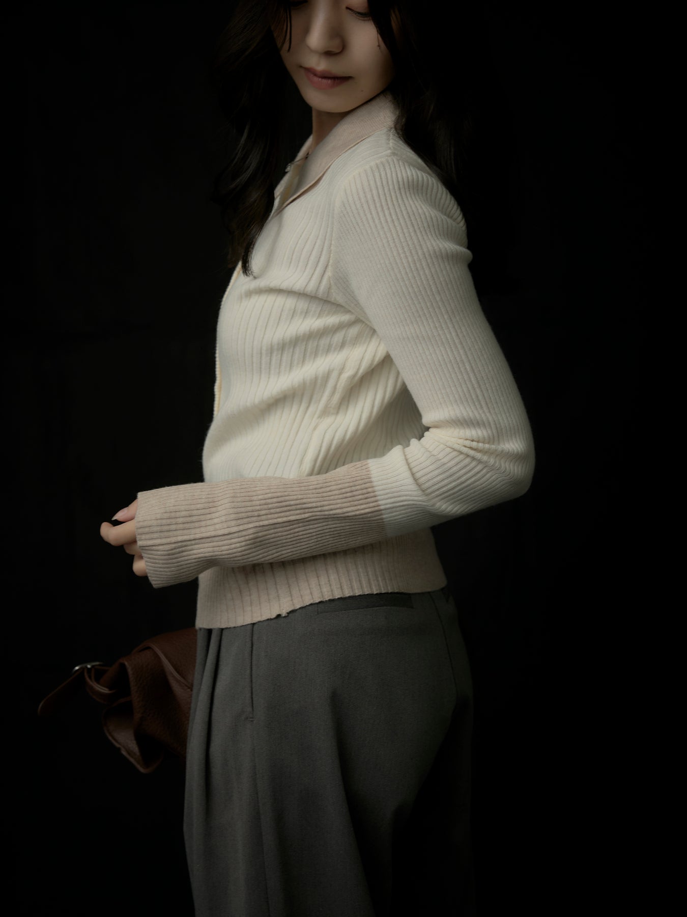 配色デザインが目を惹くバイカラーリブニットトップス。フィット感のあるシルエットがスタイルをすっきりと見せ、メリハリのある印象に。 襟付きのデザインで上品さを添えつつ、カジュアルにもきれいめにもマッチする一枚。