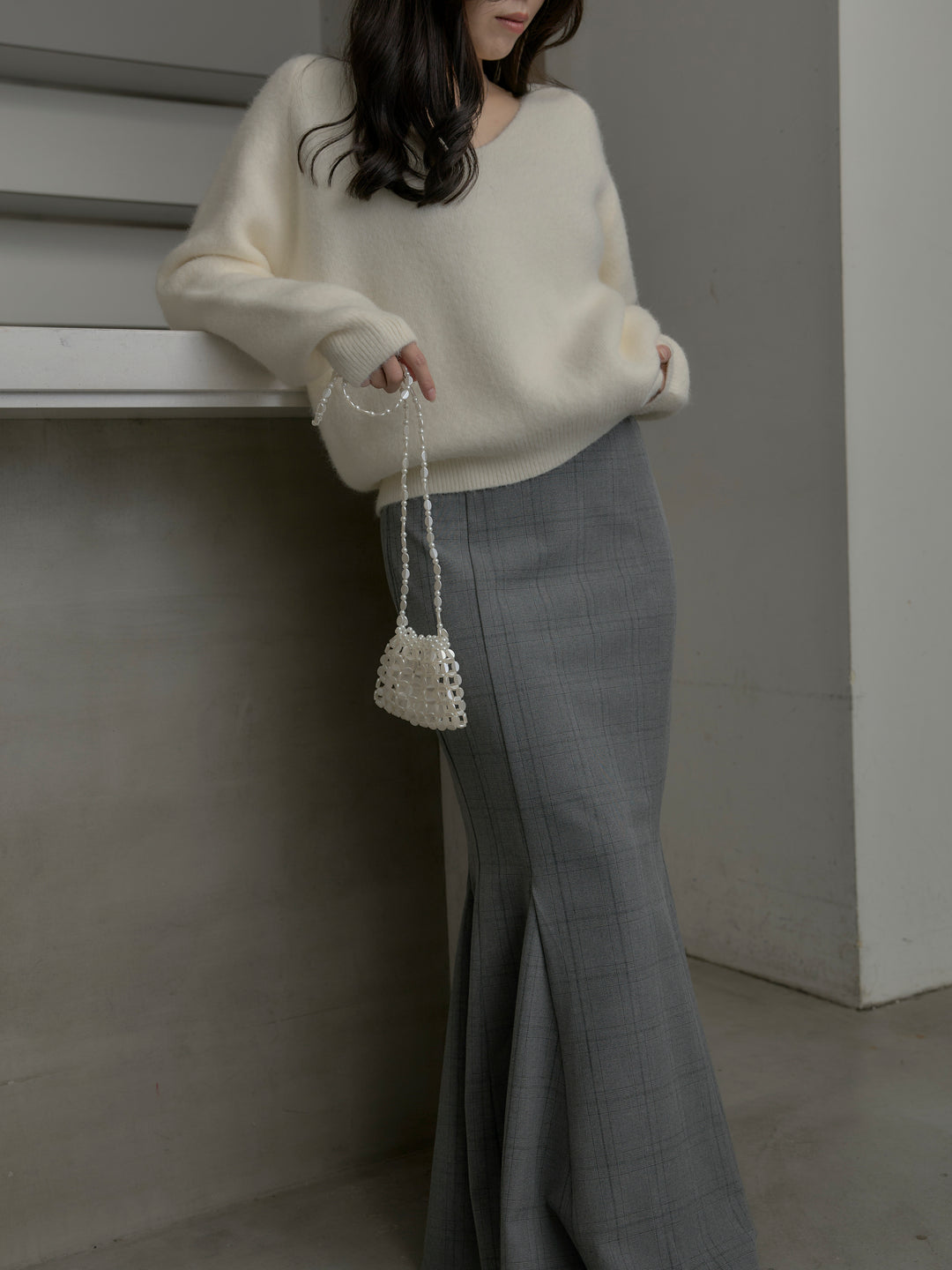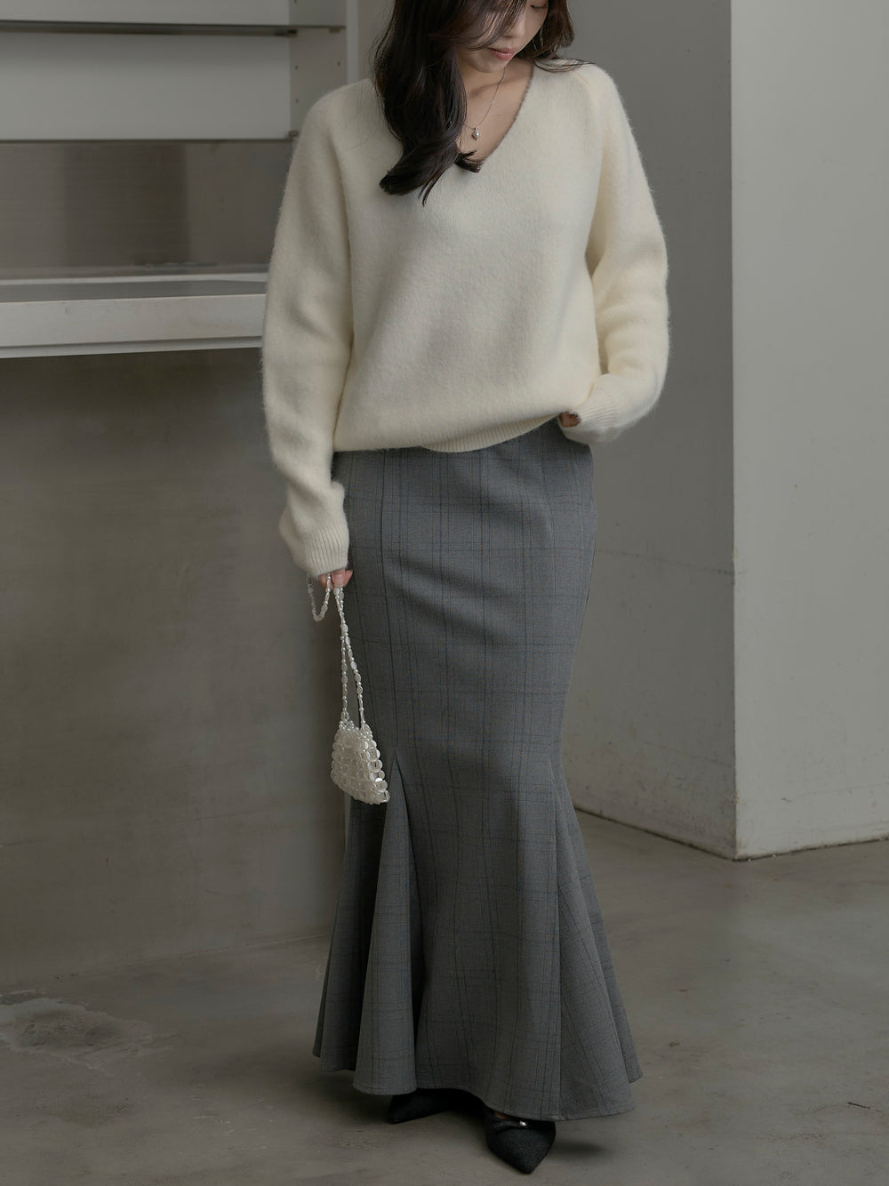 【SET】モヘアタッチVネックニットプルオーバー+【Essential】チェック柄マーメイドスカート(2set)