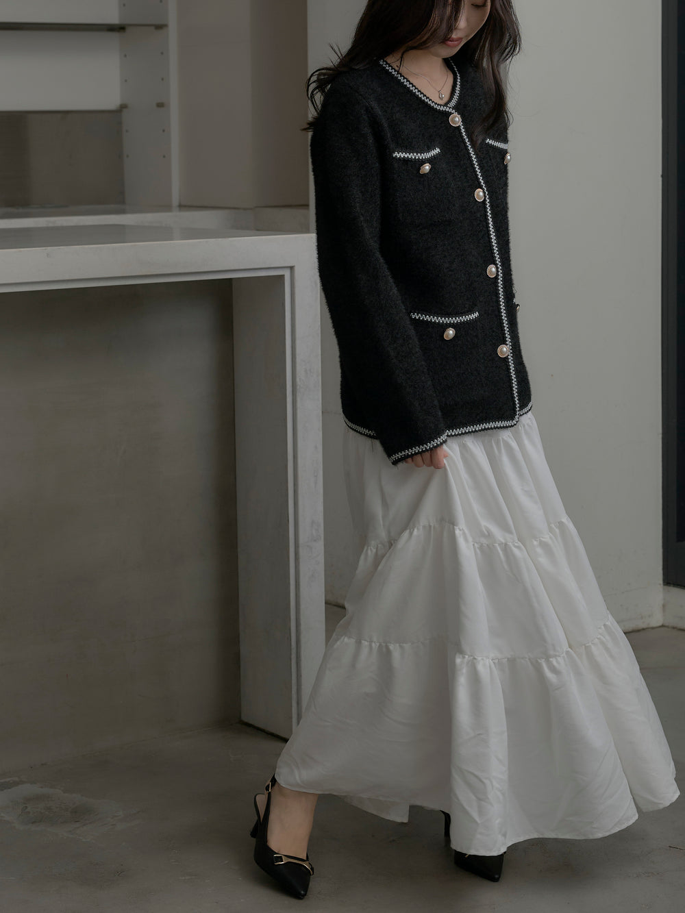 【SET】モヘアタッチパールボタンニットカーディガン+【Essential】ピーチスキンティアードスカート(2set)