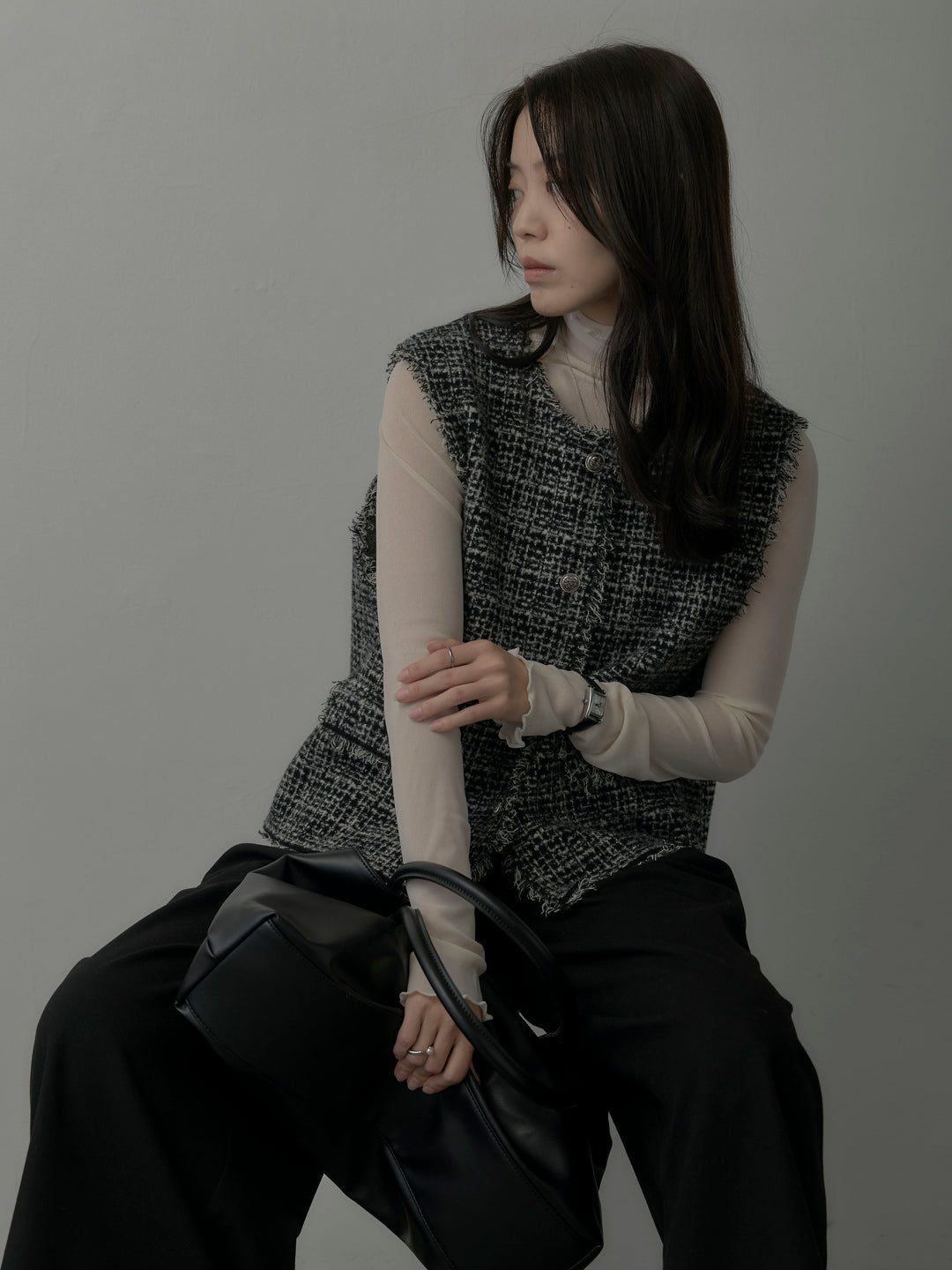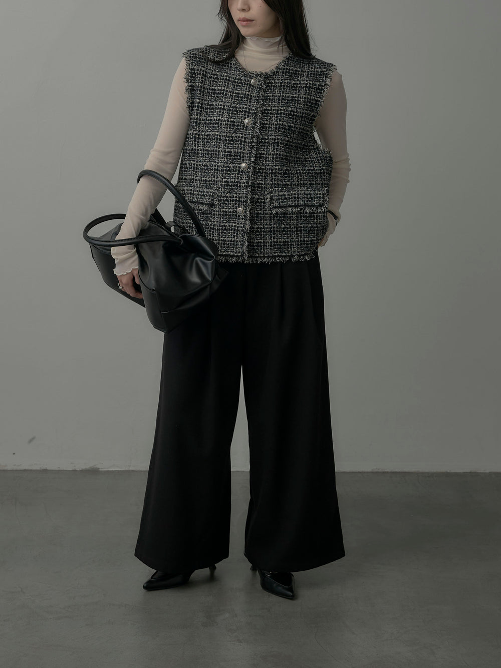 【SET】ツイードフリンジベスト+メロウフリルシアートップス+【ロープベルト付属】ウールタッチワイドパンツ(3set)