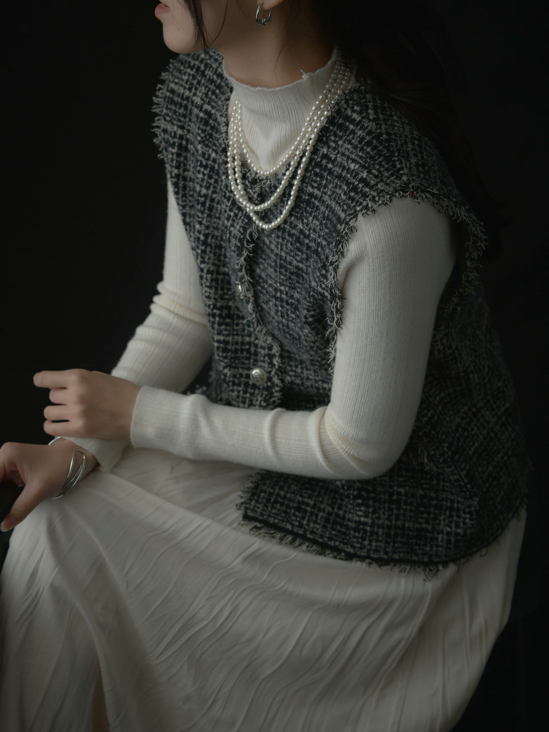 【SET】ツイードフリンジベスト+リブニットタートルネック+ベロアワッシャープリーツスカート(3set)