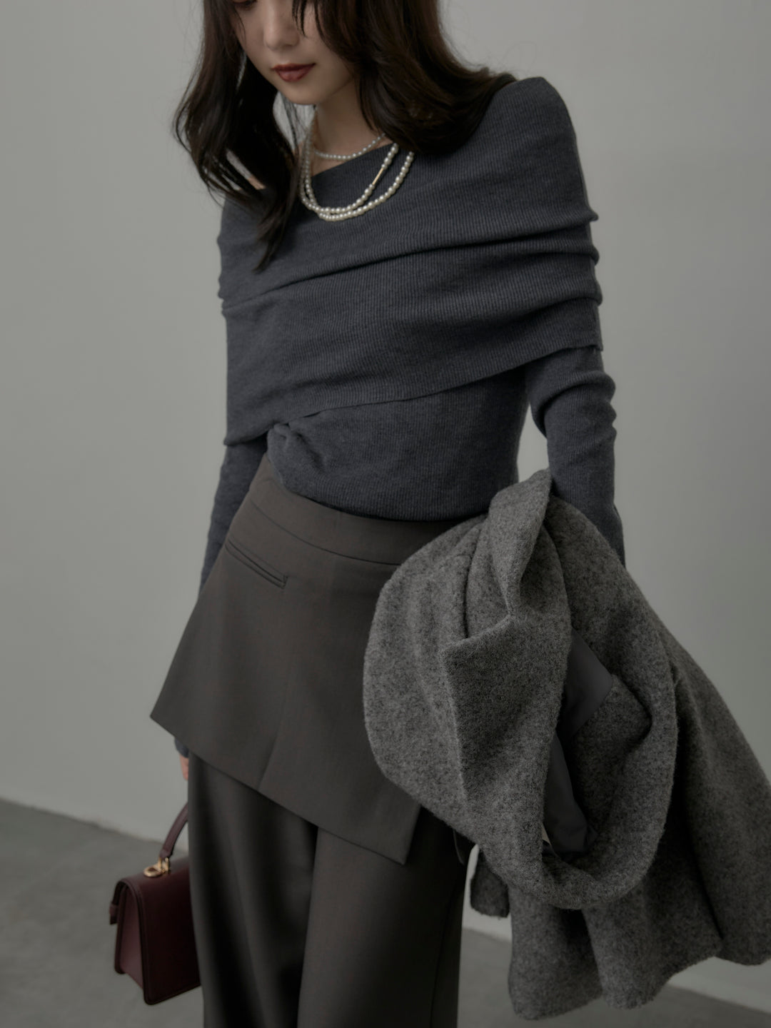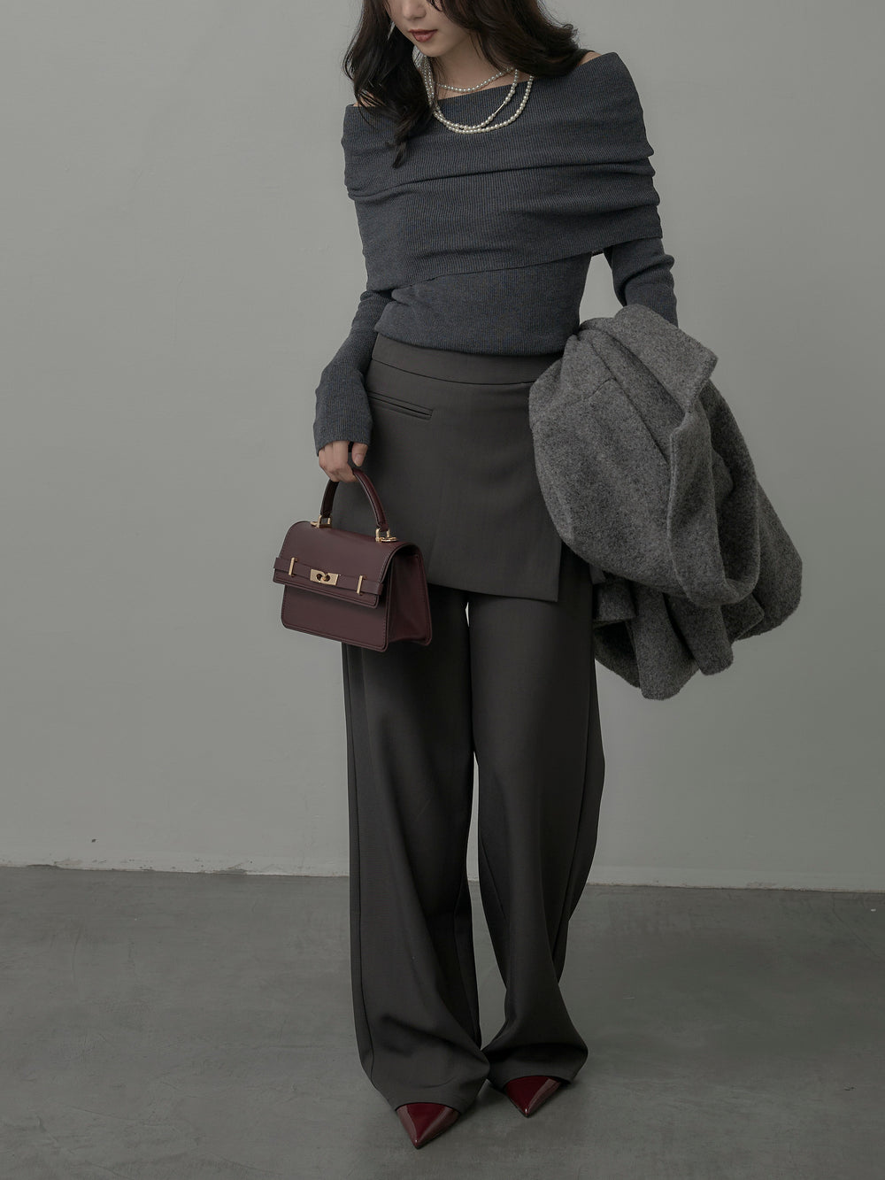 【SET】【Essential】オーバーサイズジャケットコート+オフショルリブニットトップス+ラップワイドパンツ(3set)