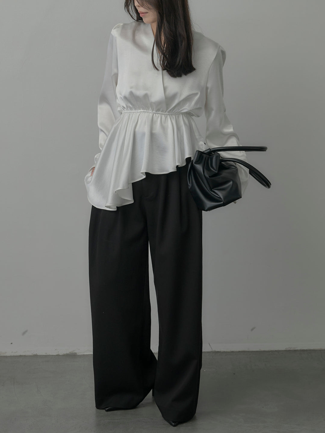 【SET】Vネックアシメサテンブラウス+【Essential】3タックスラックス(2set)