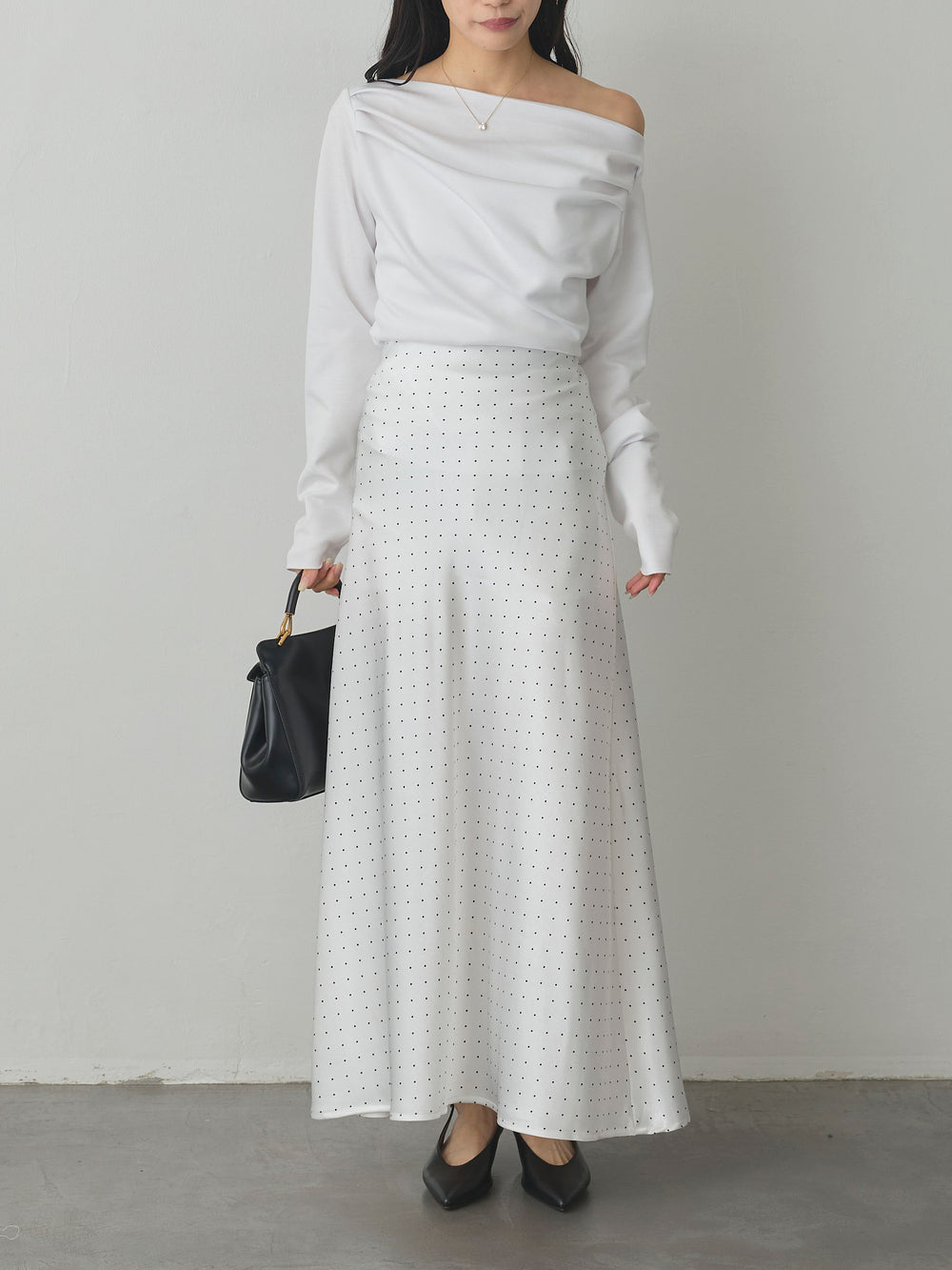 【SET】【Essential】2wayショルダードレープカットトップス+ドットサテンスカート(2set)