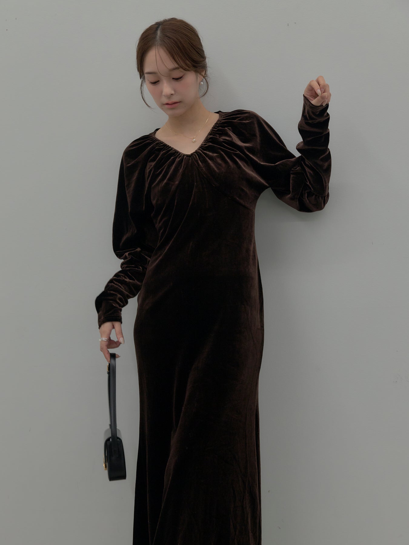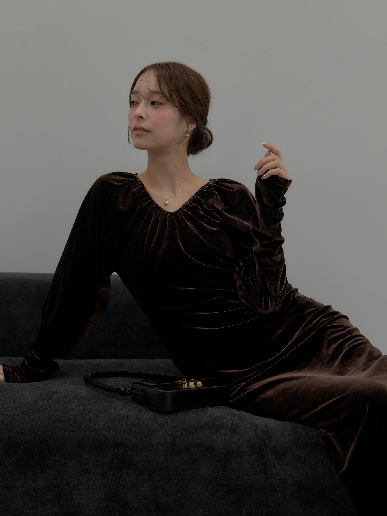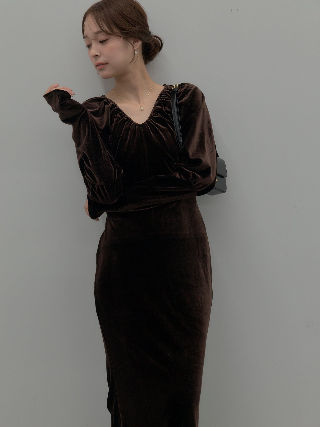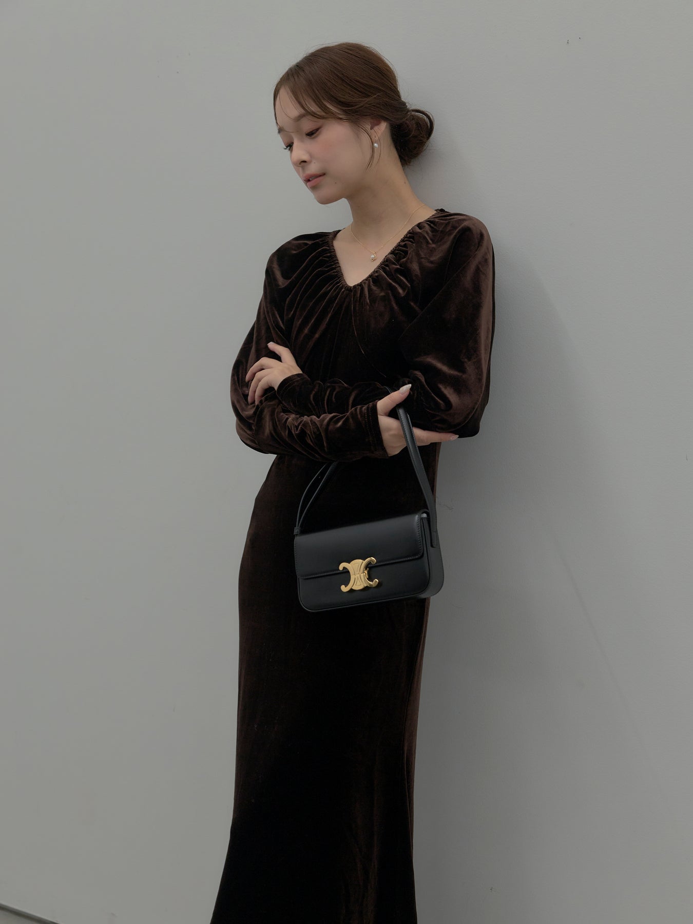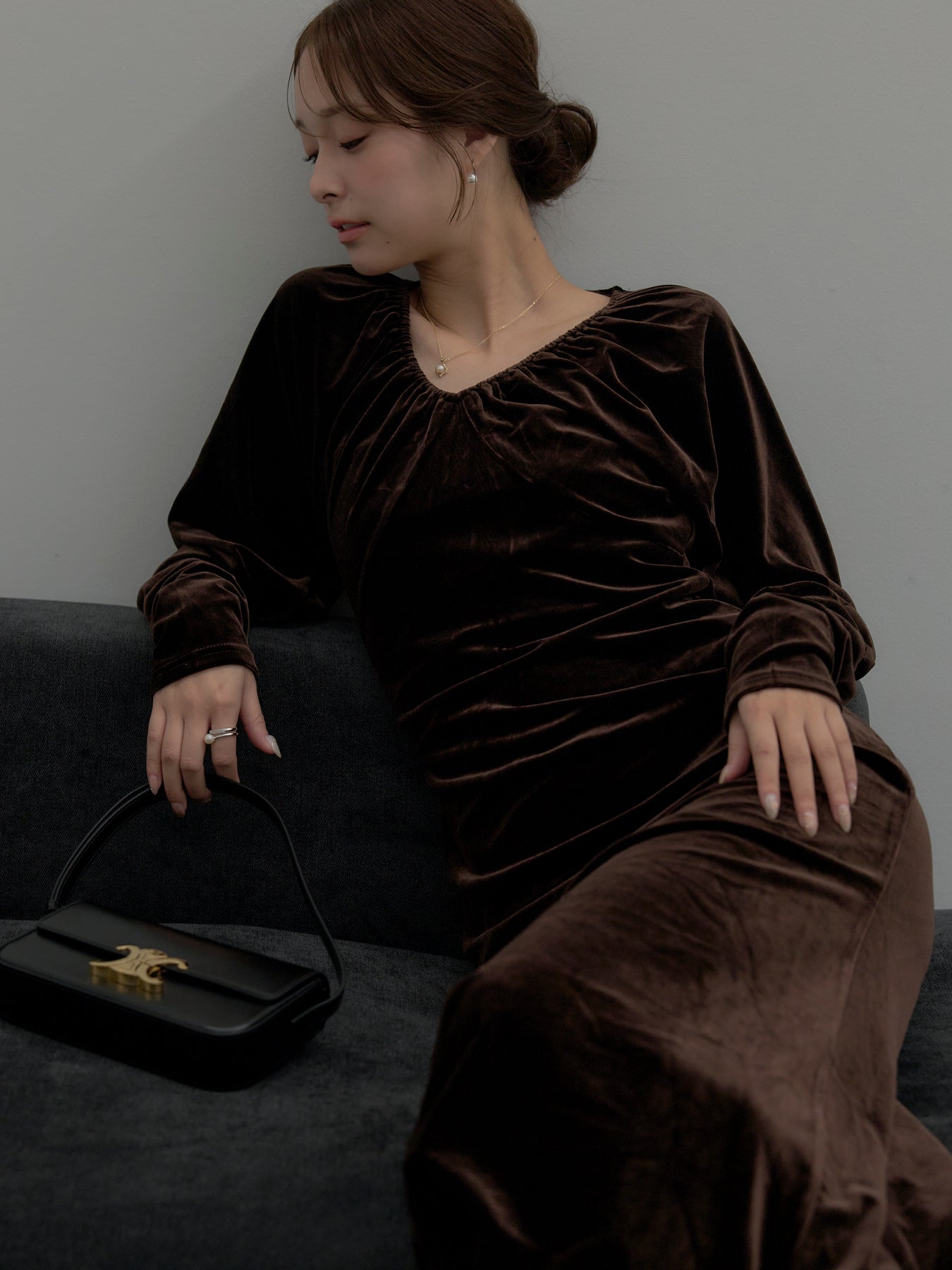 深みのある光沢が魅力のベロア素材を贅沢に使用したロングドレス。 ボディラインを美しく見せるギャザーデザインで、華やかさと上品さを両立。 特別な日にも映える、存在感たっぷりの一枚です。