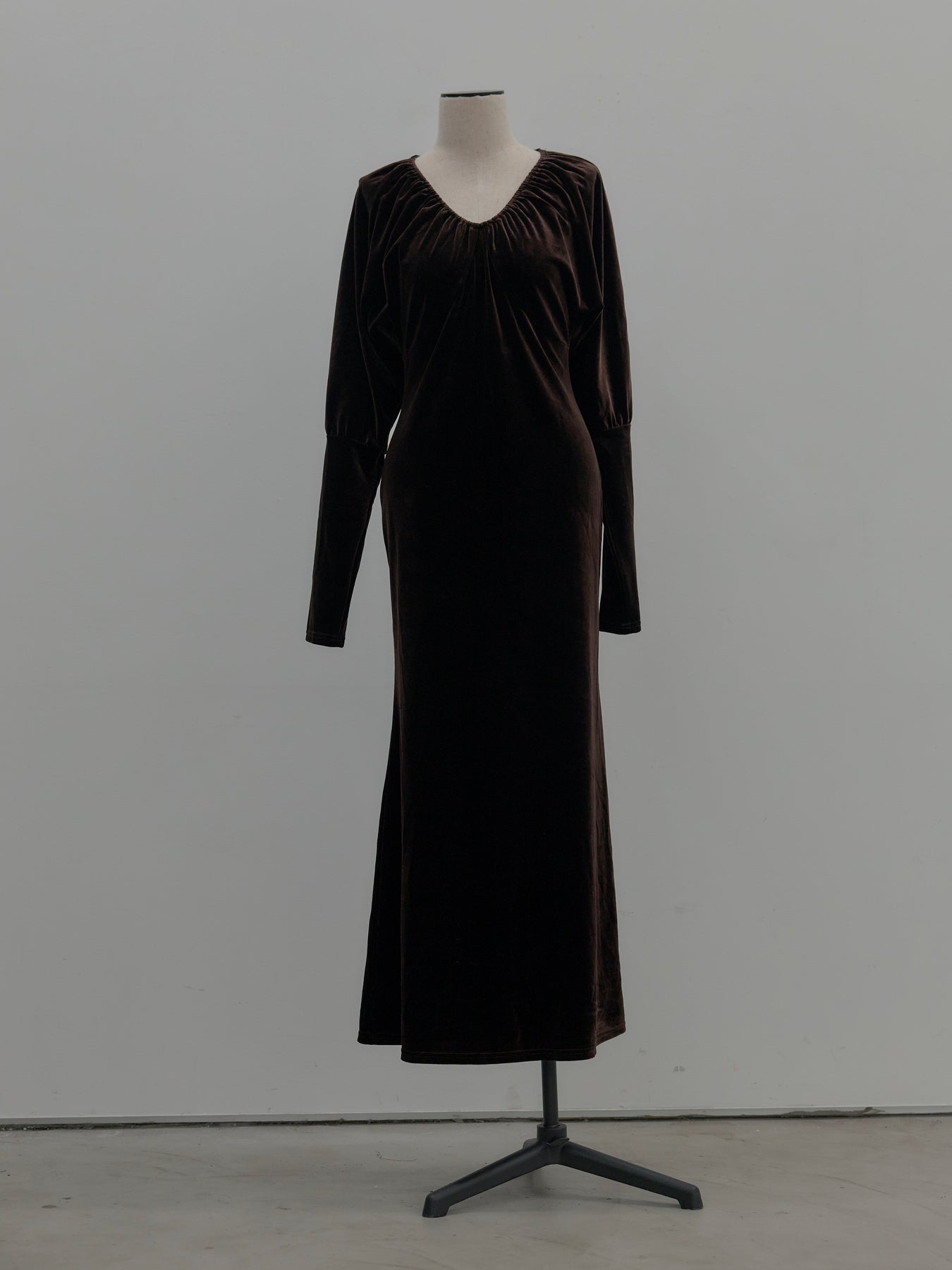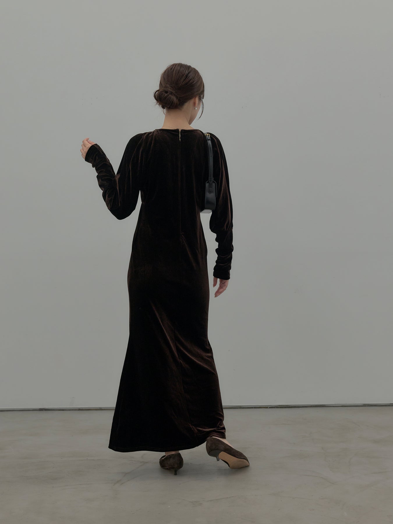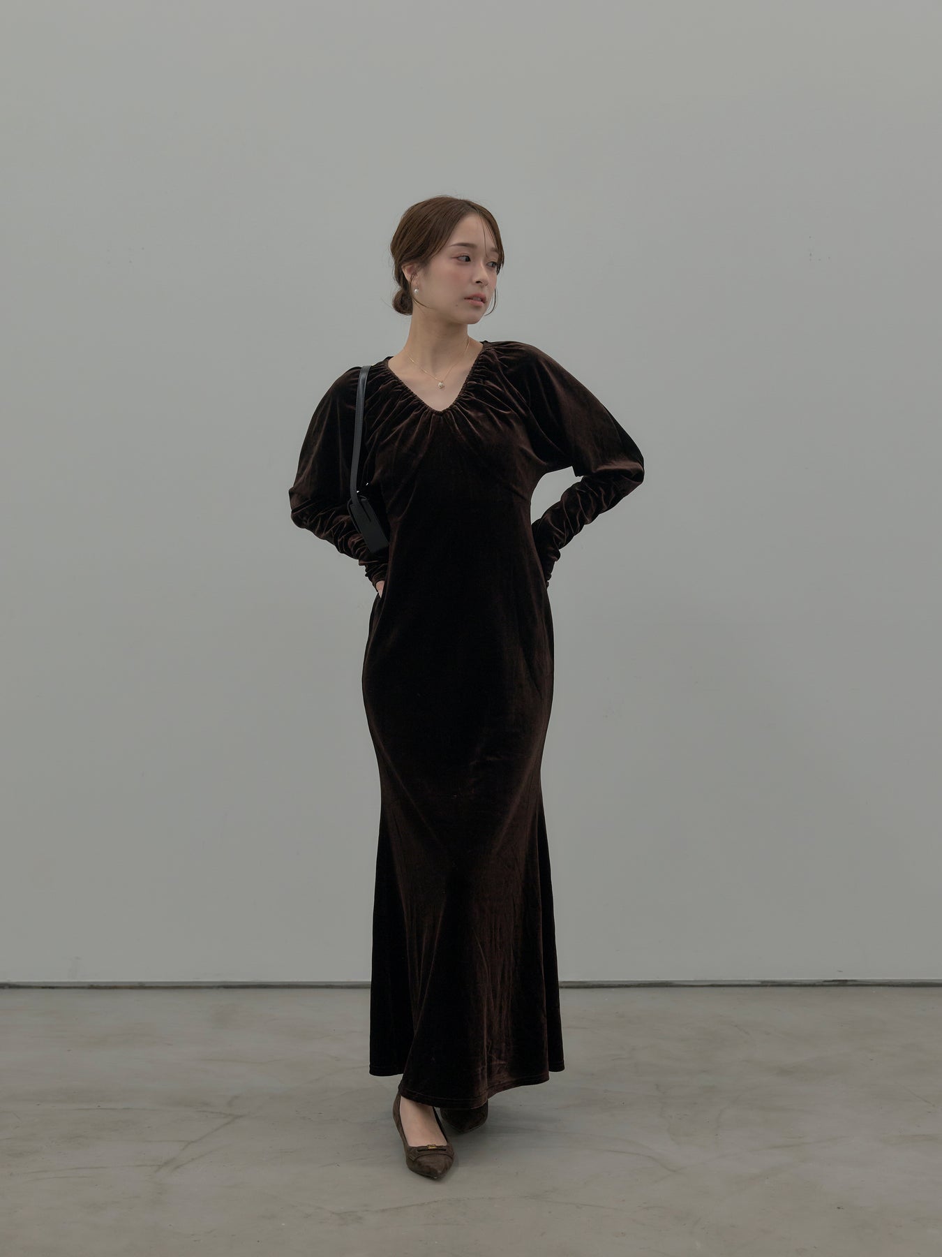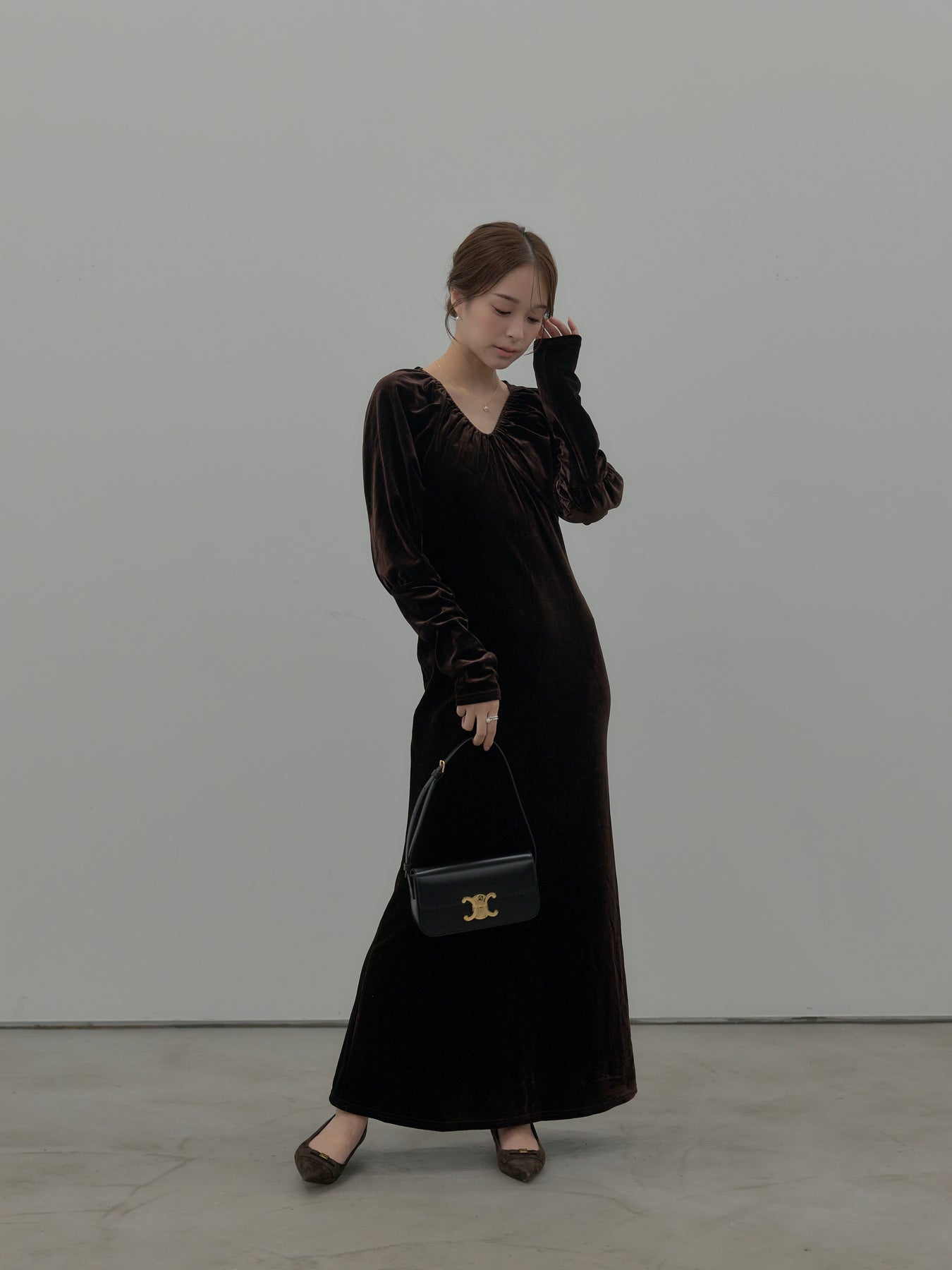 深みのある光沢が魅力のベロア素材を贅沢に使用したロングドレス。 ボディラインを美しく見せるギャザーデザインで、華やかさと上品さを両立。 特別な日にも映える、存在感たっぷりの一枚です。