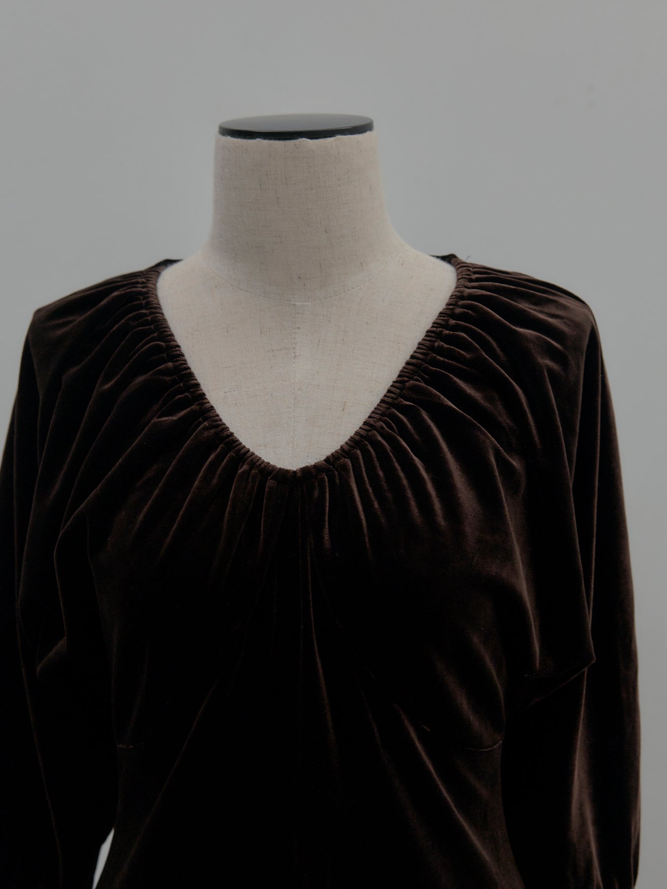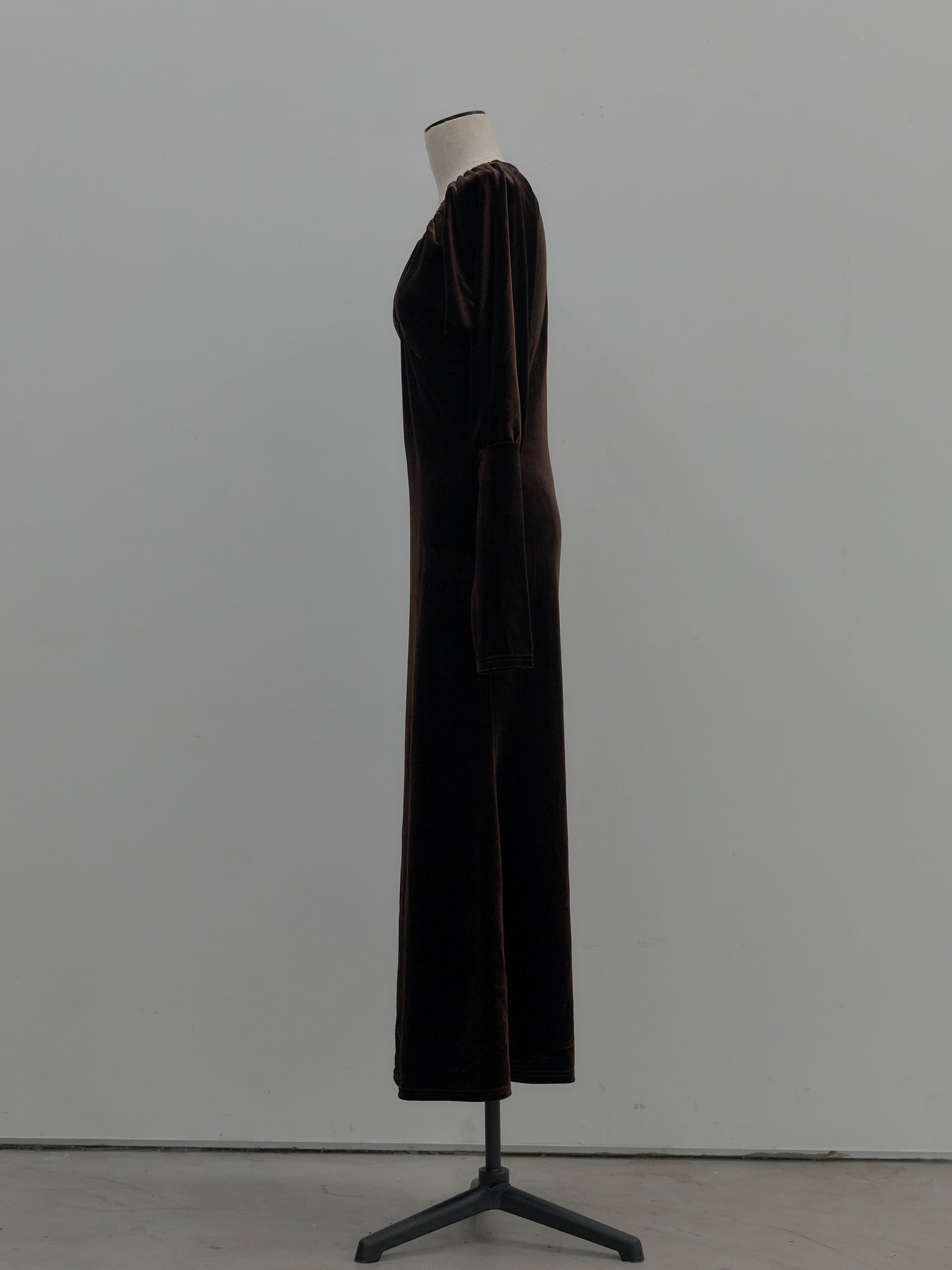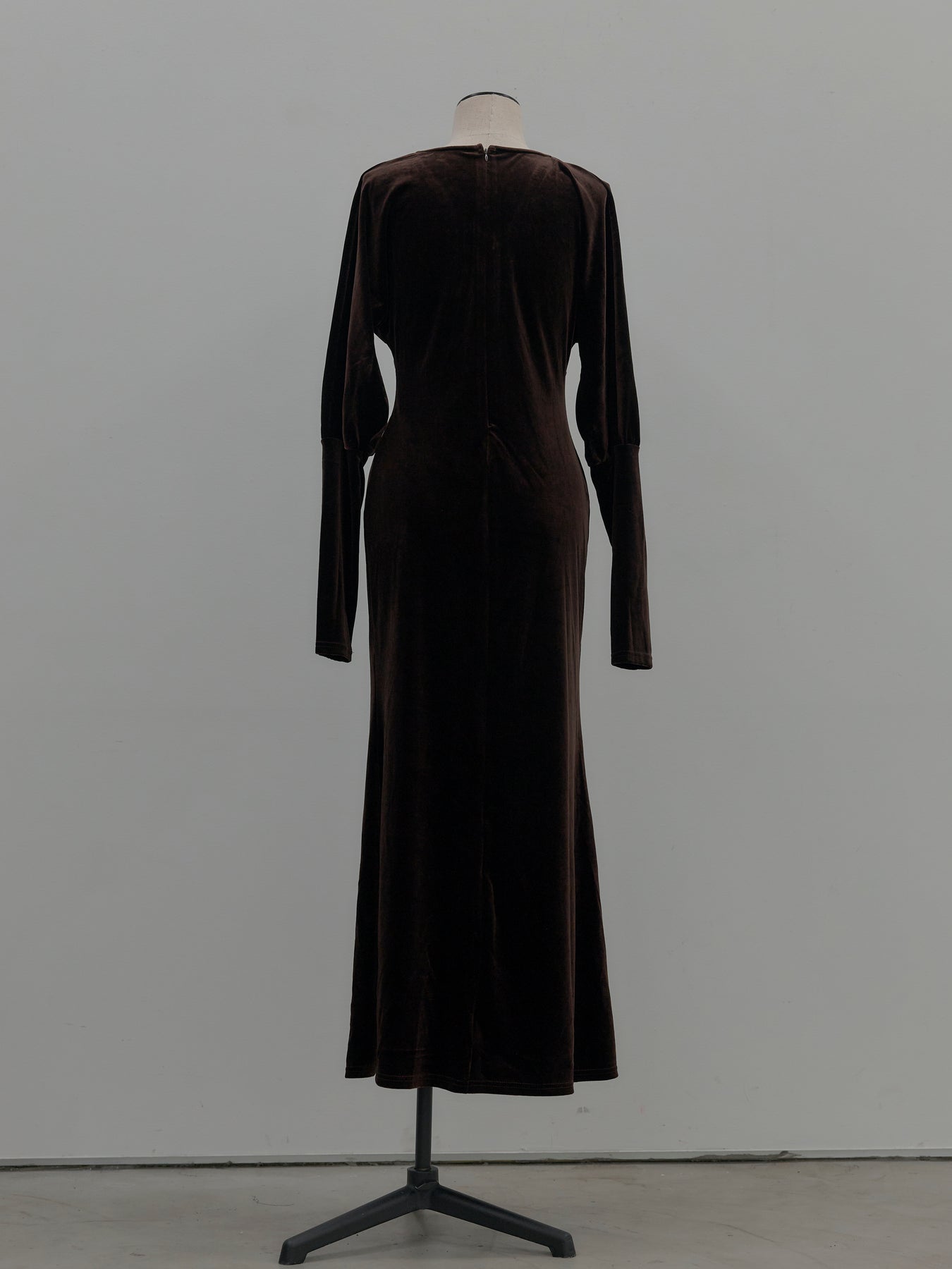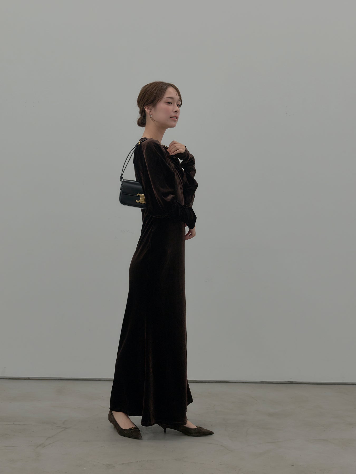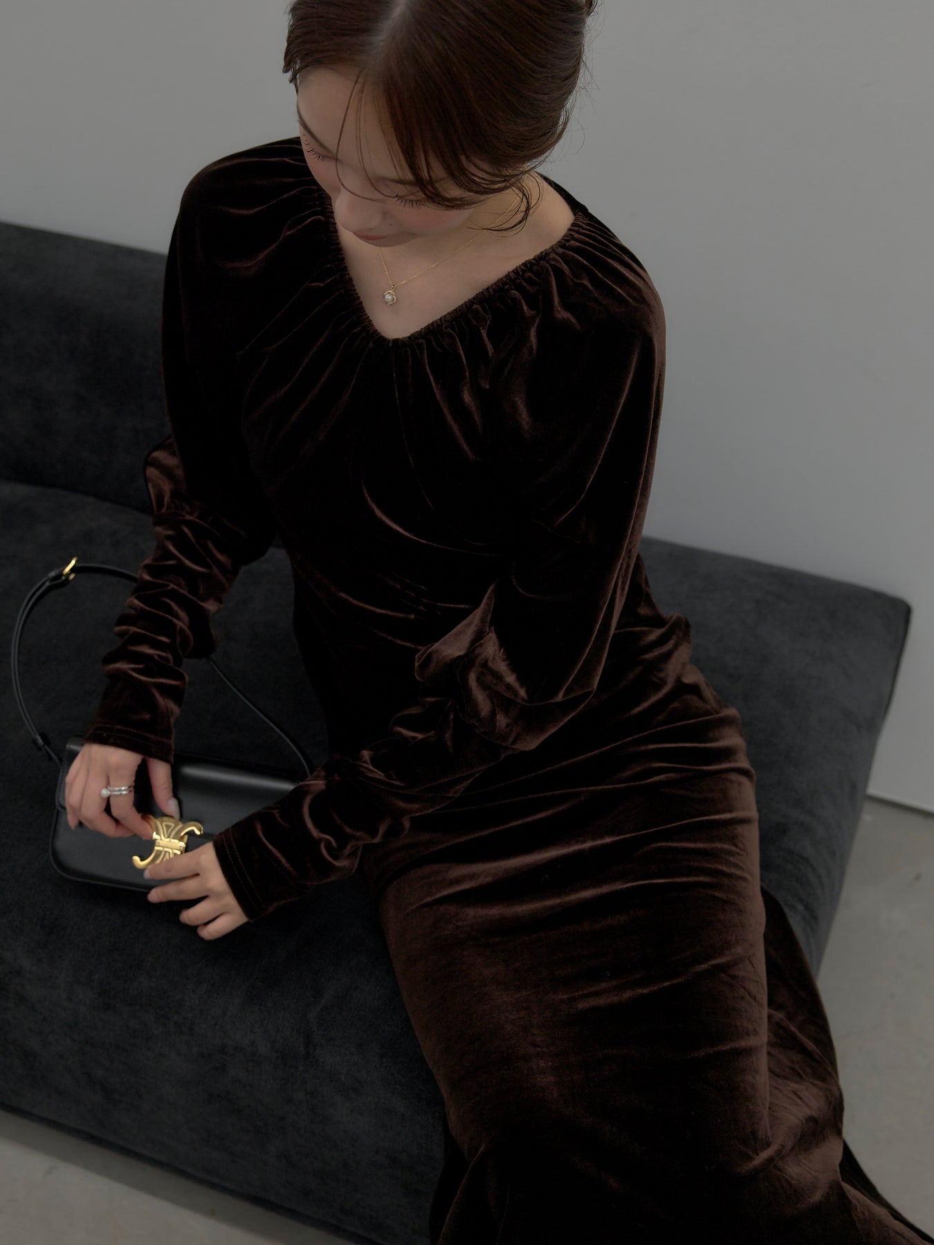 深みのある光沢が魅力のベロア素材を贅沢に使用したロングドレス。 ボディラインを美しく見せるギャザーデザインで、華やかさと上品さを両立。 特別な日にも映える、存在感たっぷりの一枚です。