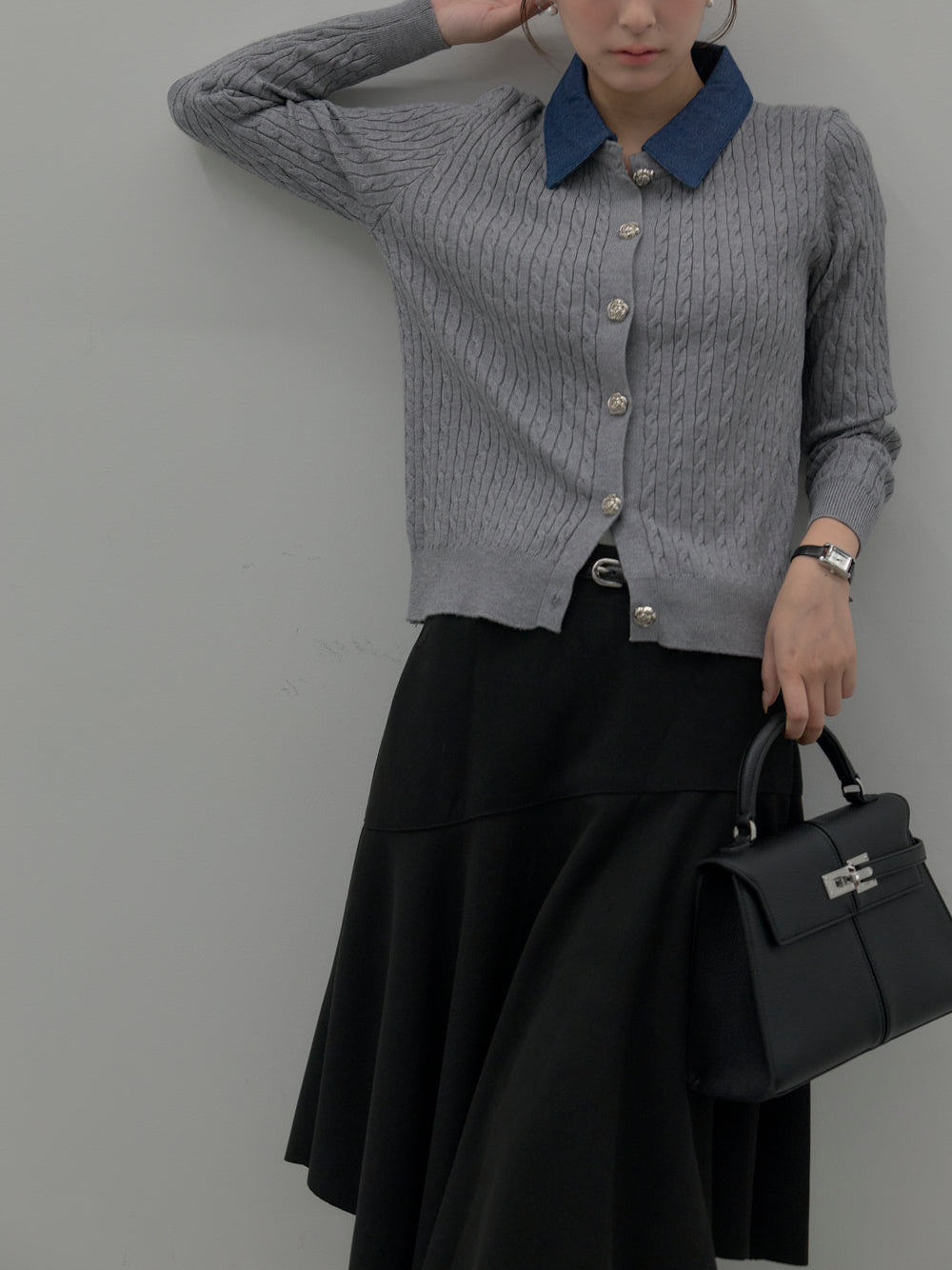 デニム襟アンティークボタンニットトップス