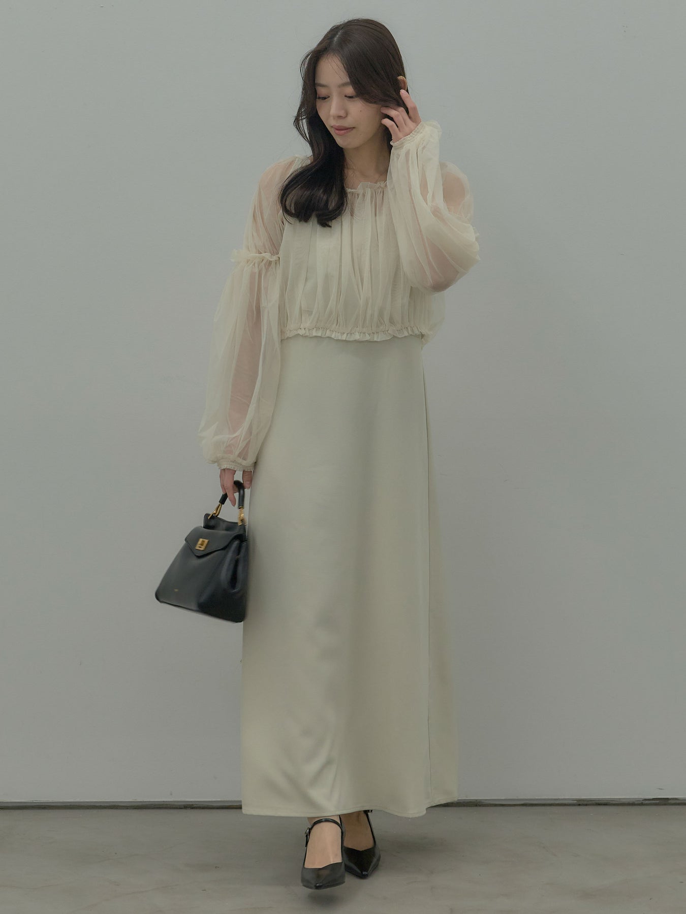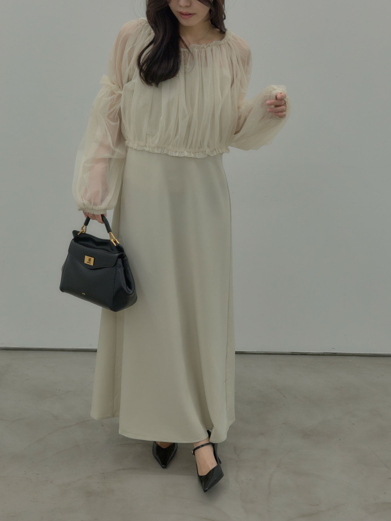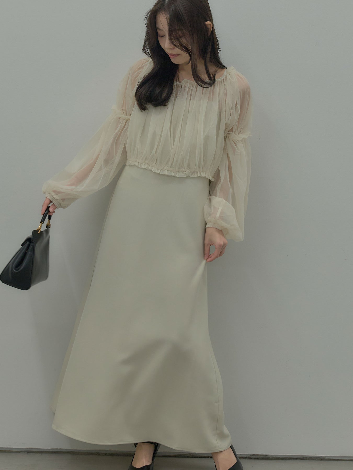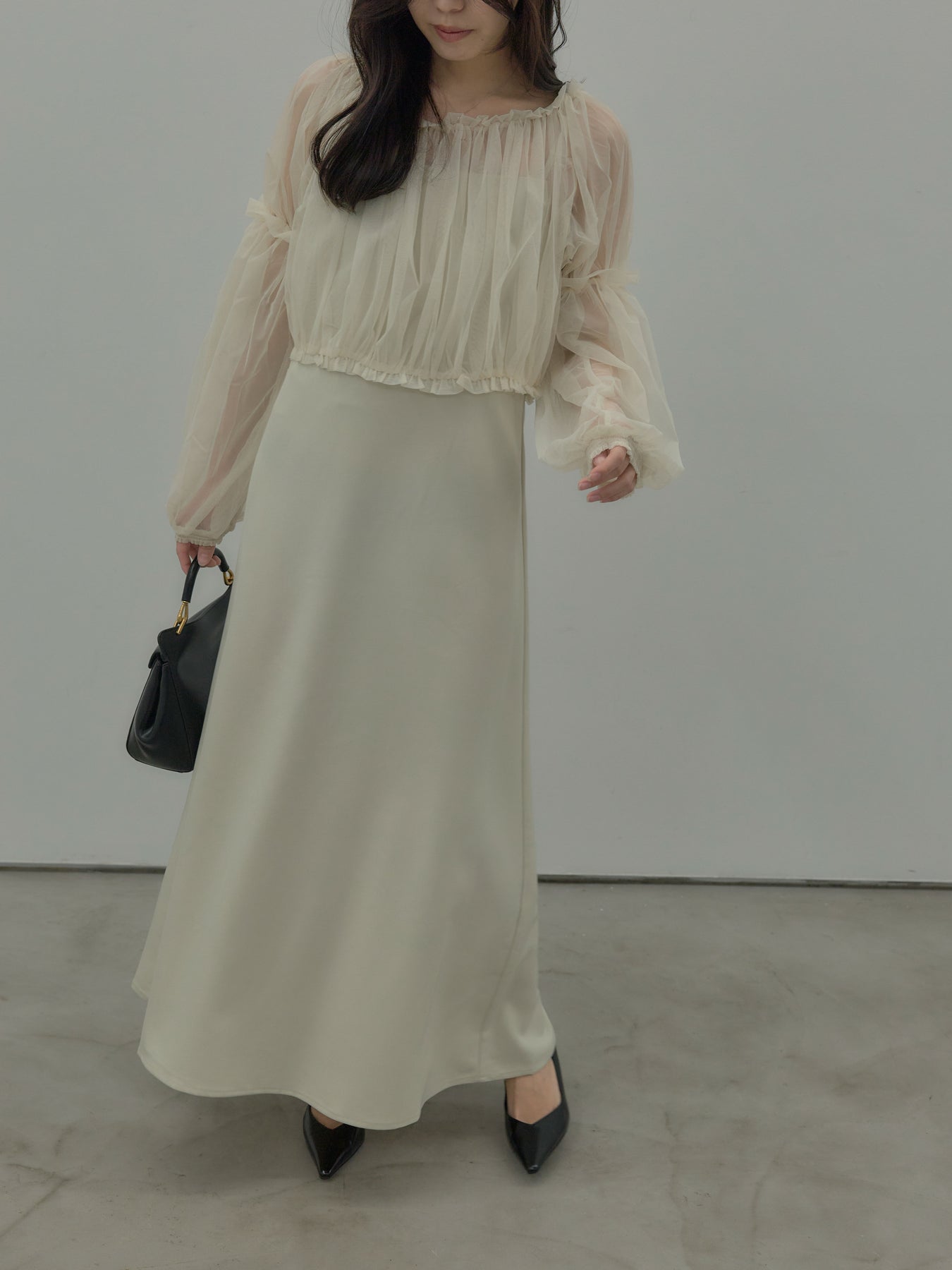 チュールブラウス付きで着こなしの幅が広がる2wayワンピース。ブラウススタイルとオフショルダースタイルの2wayです。 繊細な透け感が華やかさをプラスし、シーンに合わせて印象チェンジが可能。 一枚で完成度の高いスタイルが叶う、特別感のあるアイテムです。
