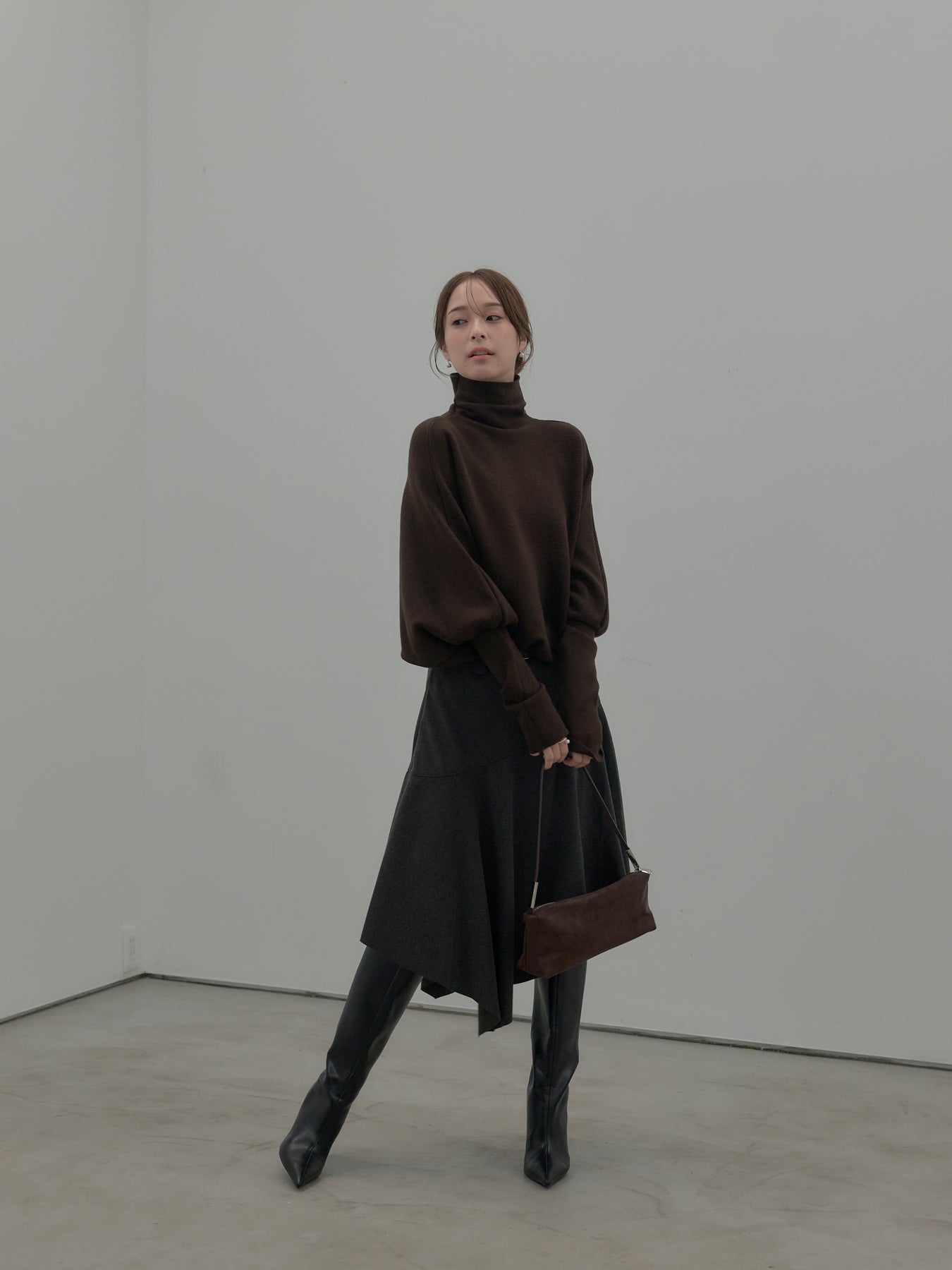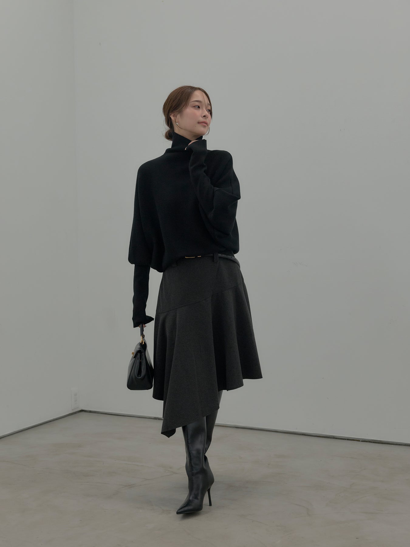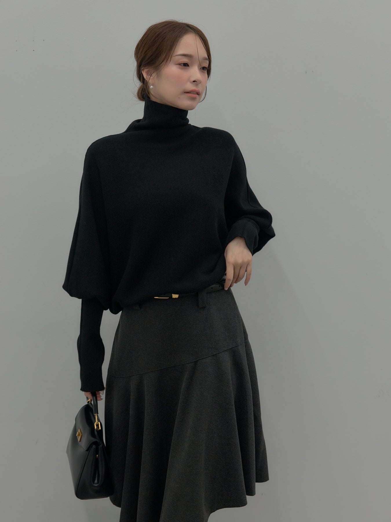 【SET】ドルマンハイネックニットトップス+ミディ丈アシンメトリーフレアスカート(2set)