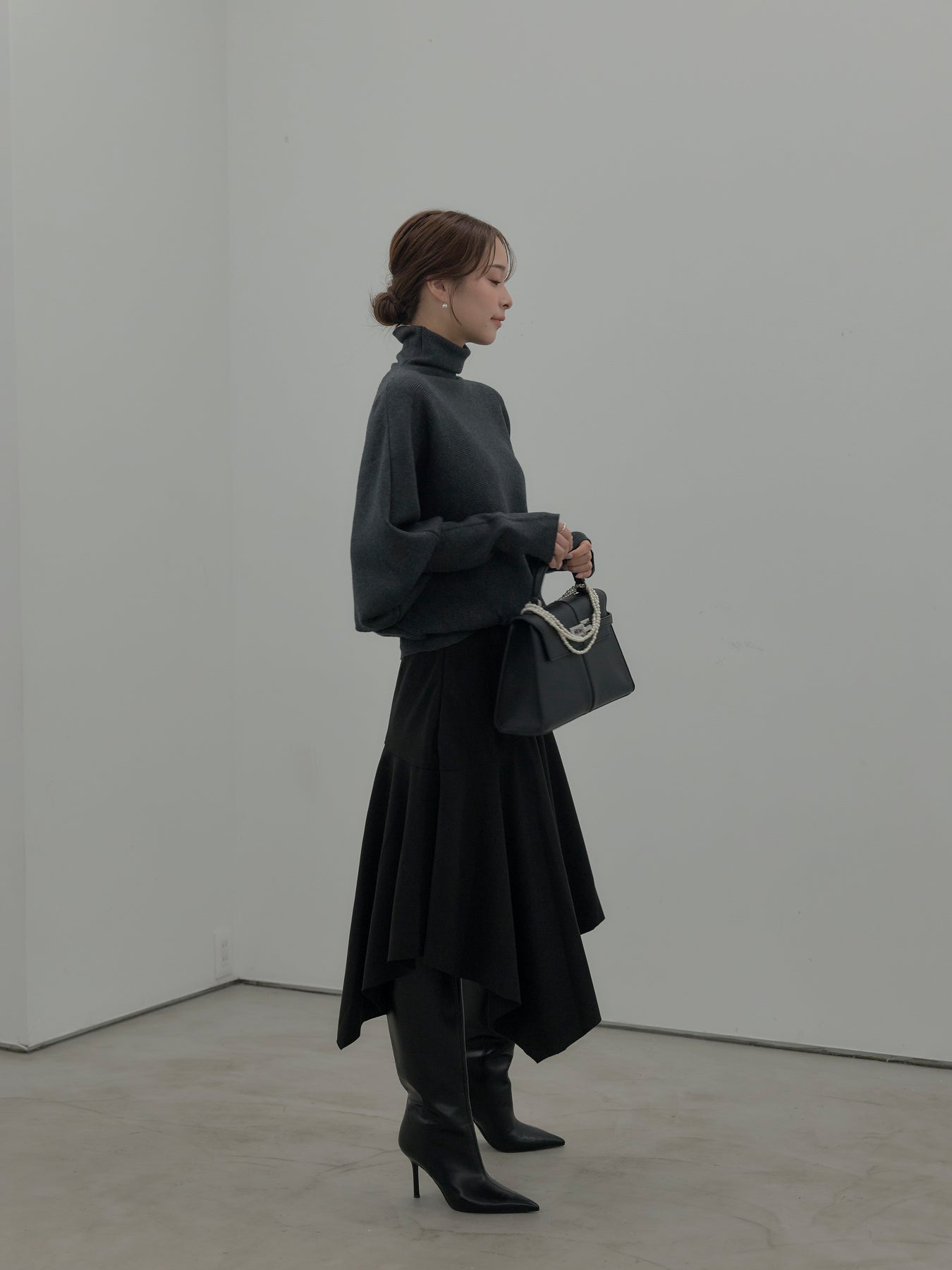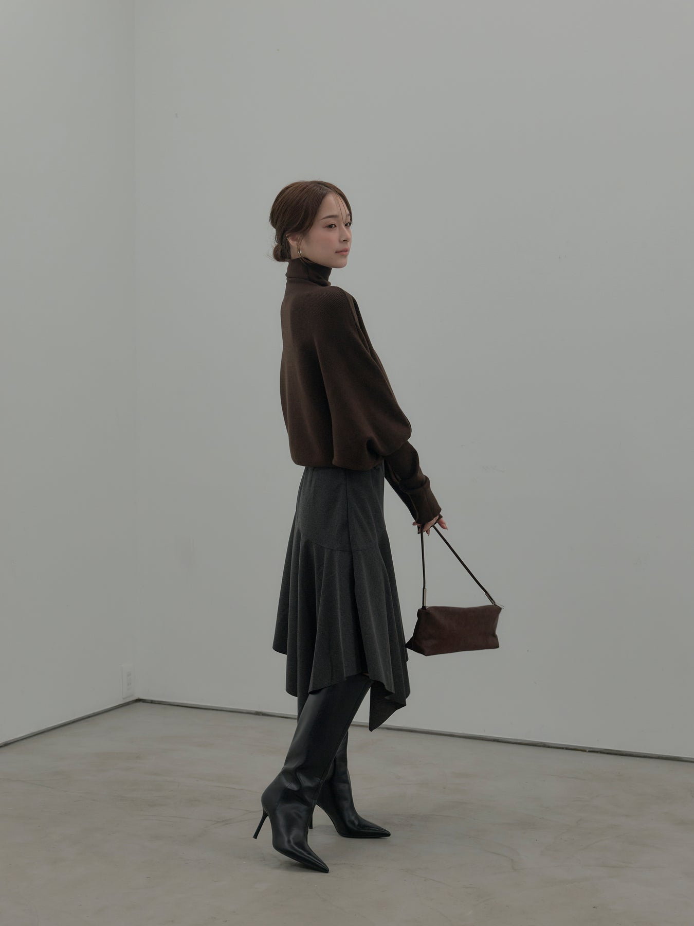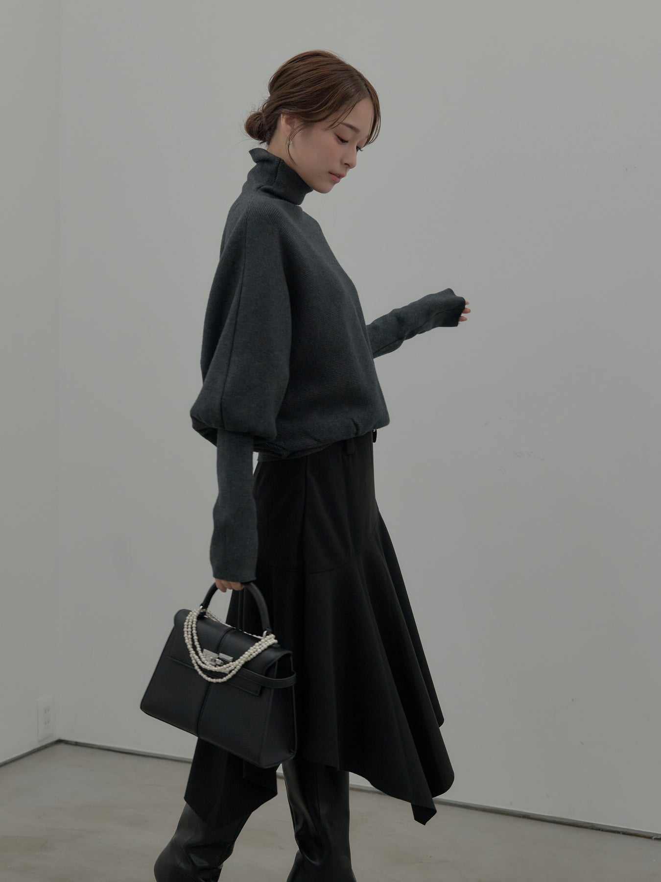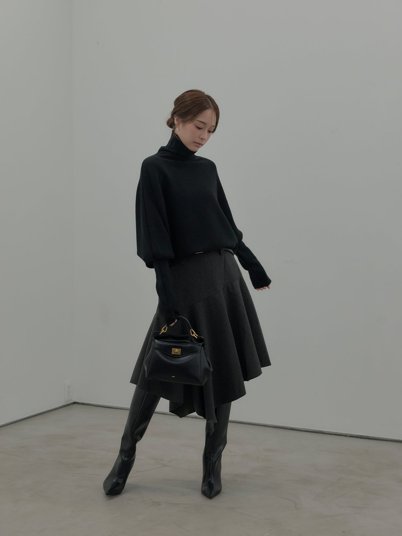 【SET】ドルマンハイネックニットトップス+ミディ丈アシンメトリーフレアスカート(2set)