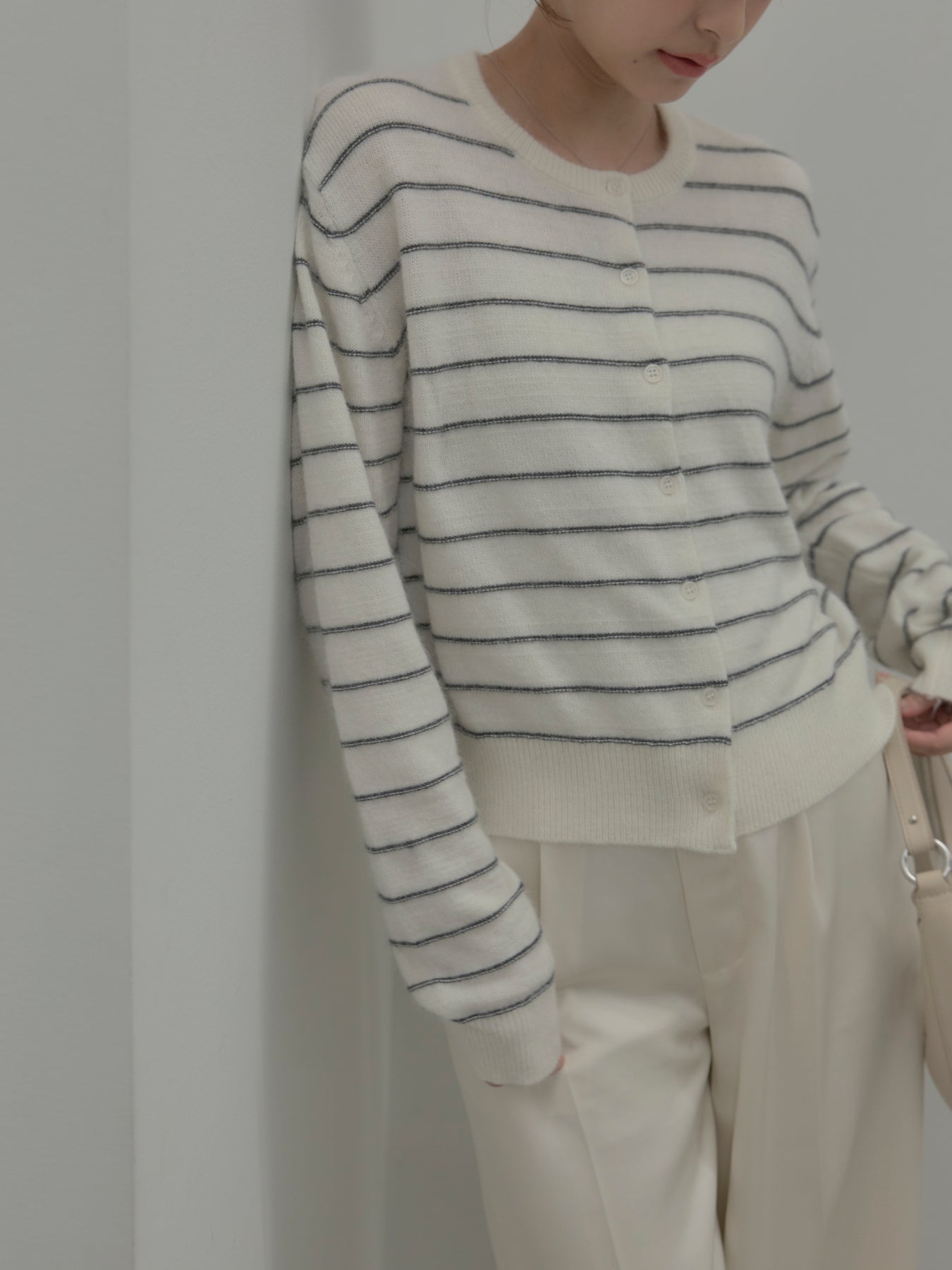 アルパカタッチのふんわり起毛感がリッチな印象を高めてくれるカーディガン。柔らかく包み込まれるような肌触りです。カジュアルなイメージの強いボーダーですが、素材感とピッチ細めのボーダーでnairoらしく上品に仕上がります。短めの丈でスタイリングしやすいのも嬉しいポイント。春先まで活躍してくれるカーディガンです。