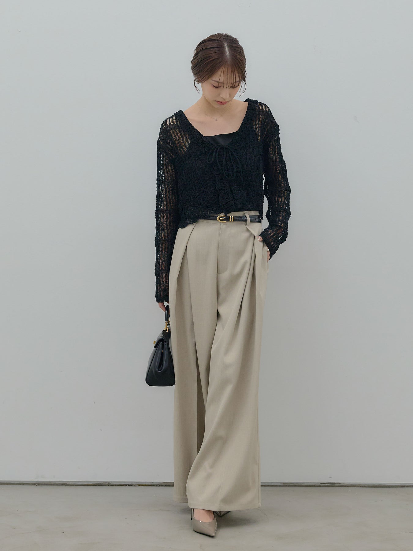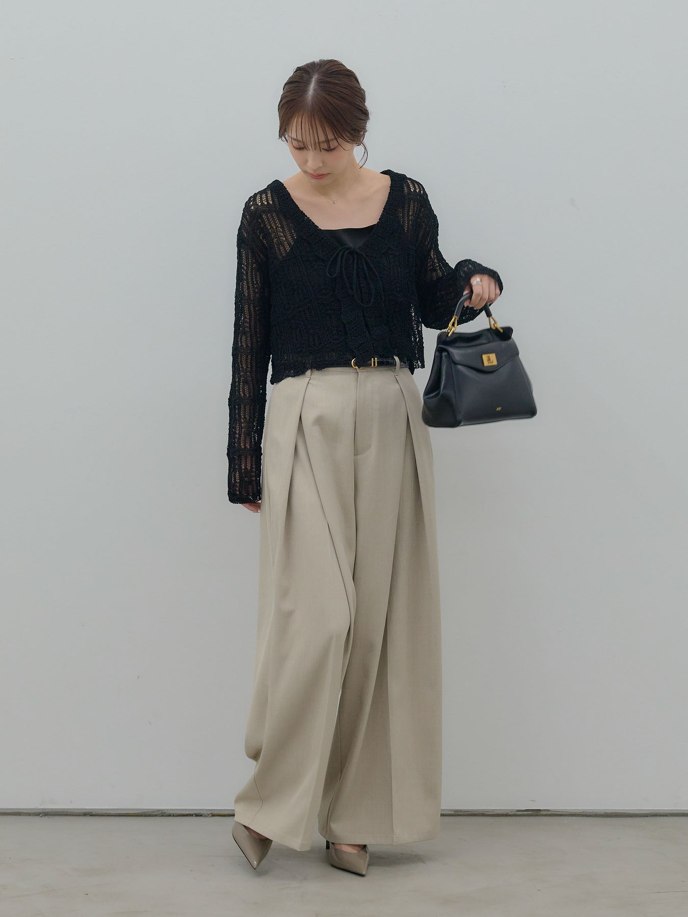 落ち感のある素材を使用した、ワイドシルエットのタックパンツ。