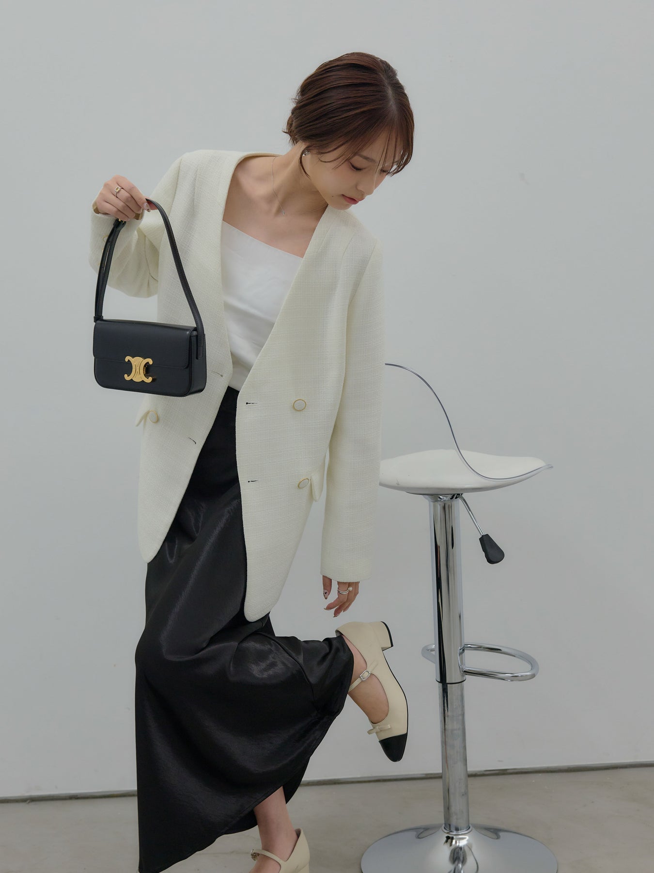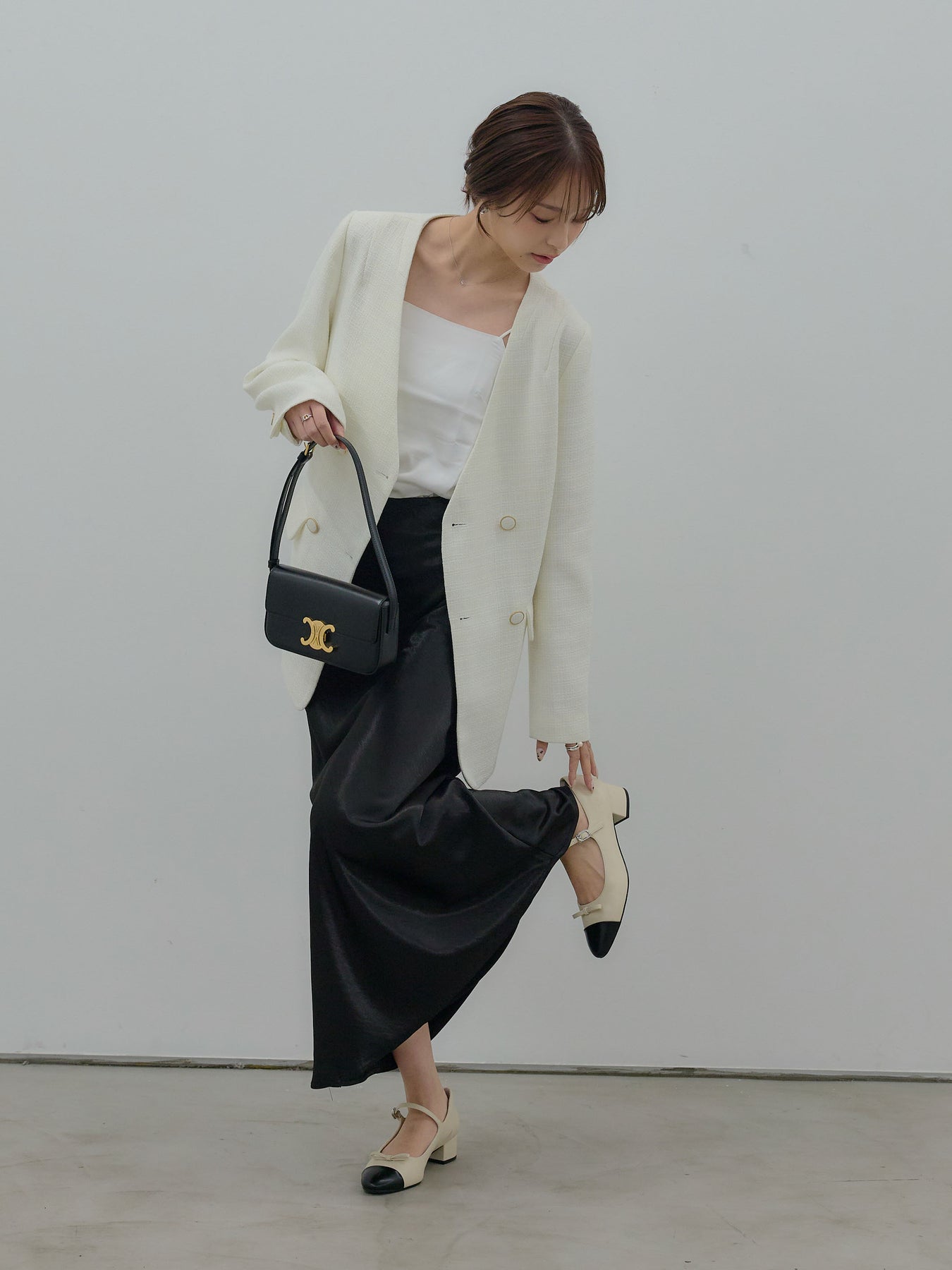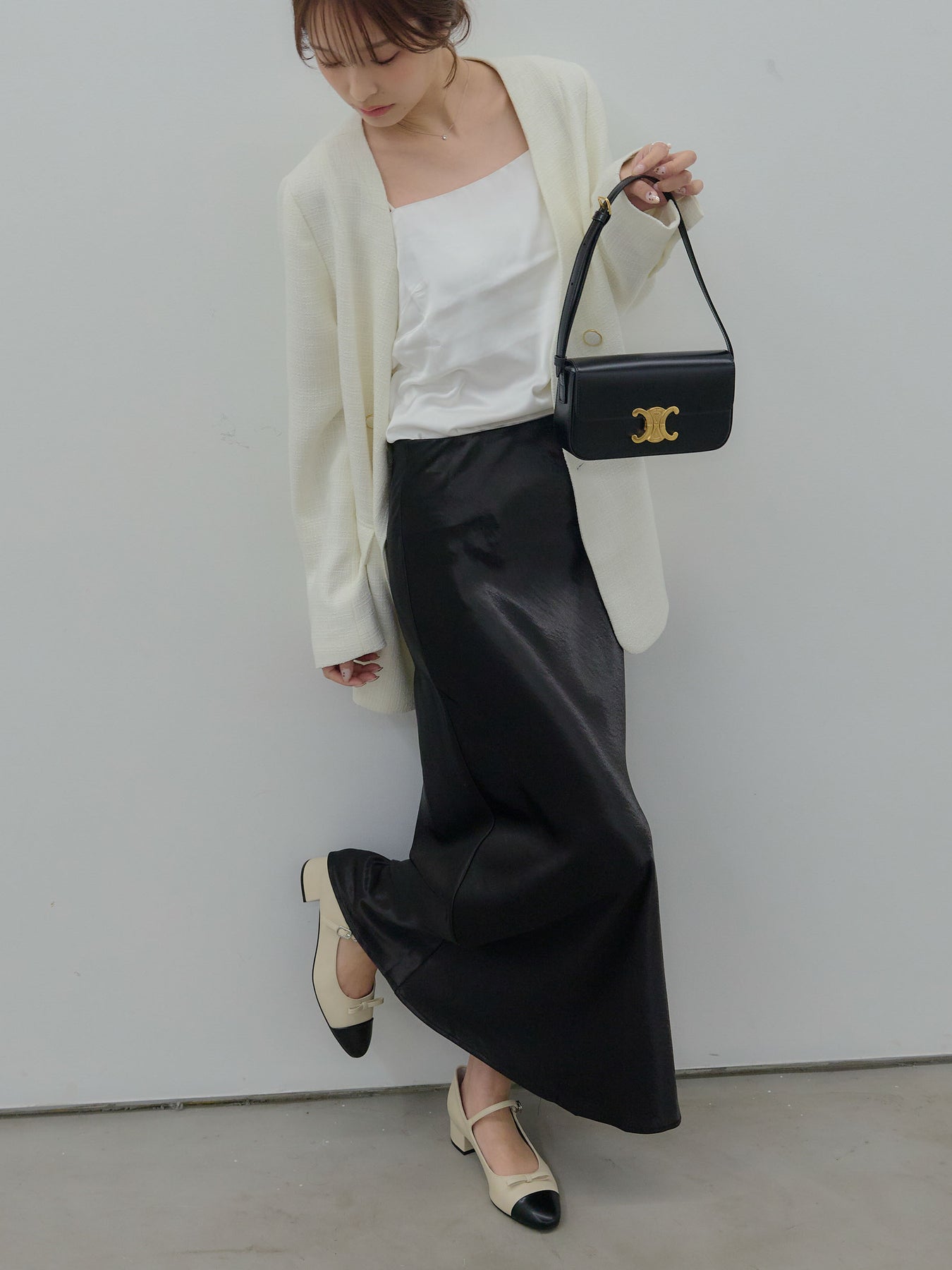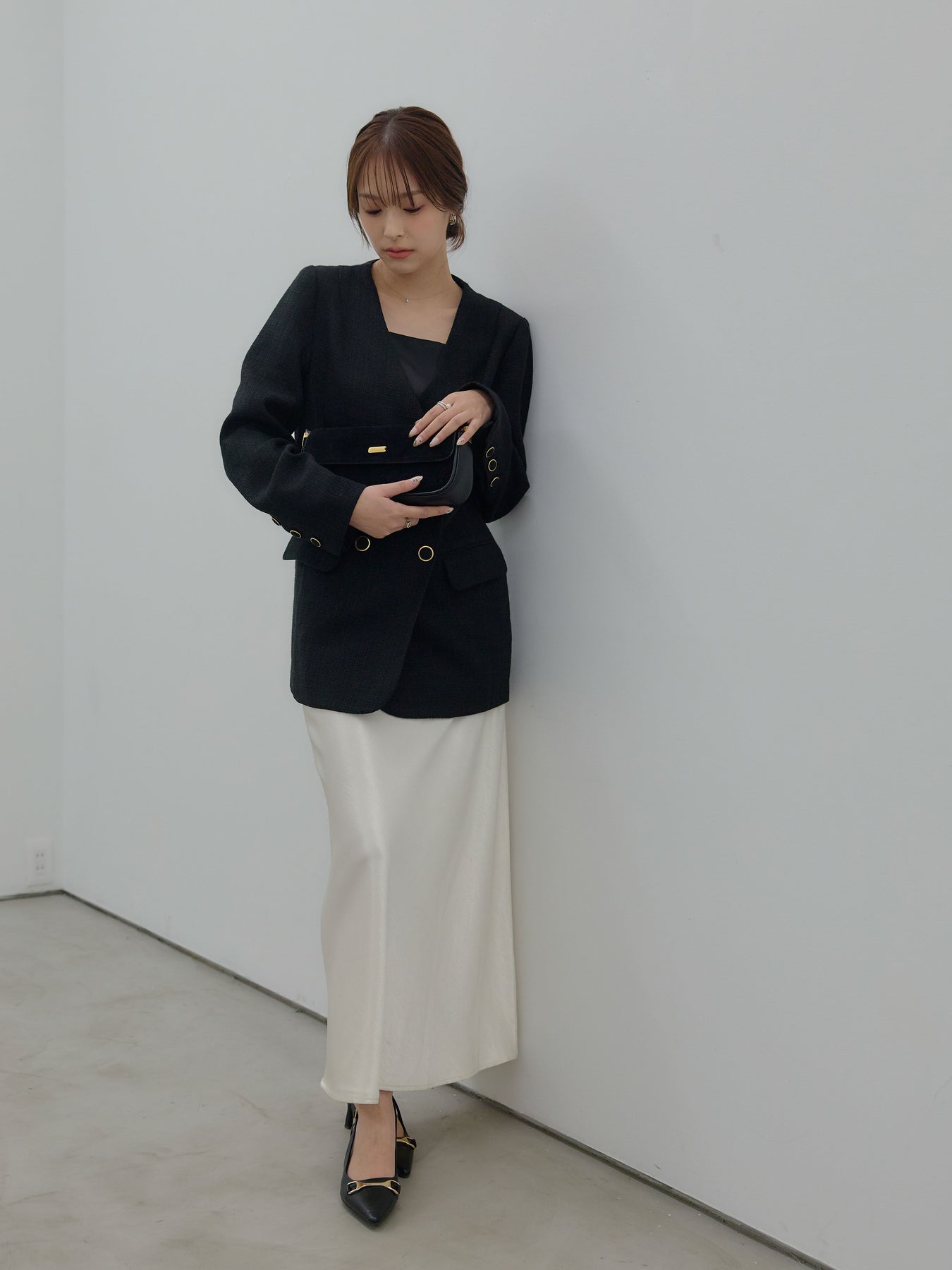 同素材のミニスカートと合わせたセットアップスタイルはもちろん、