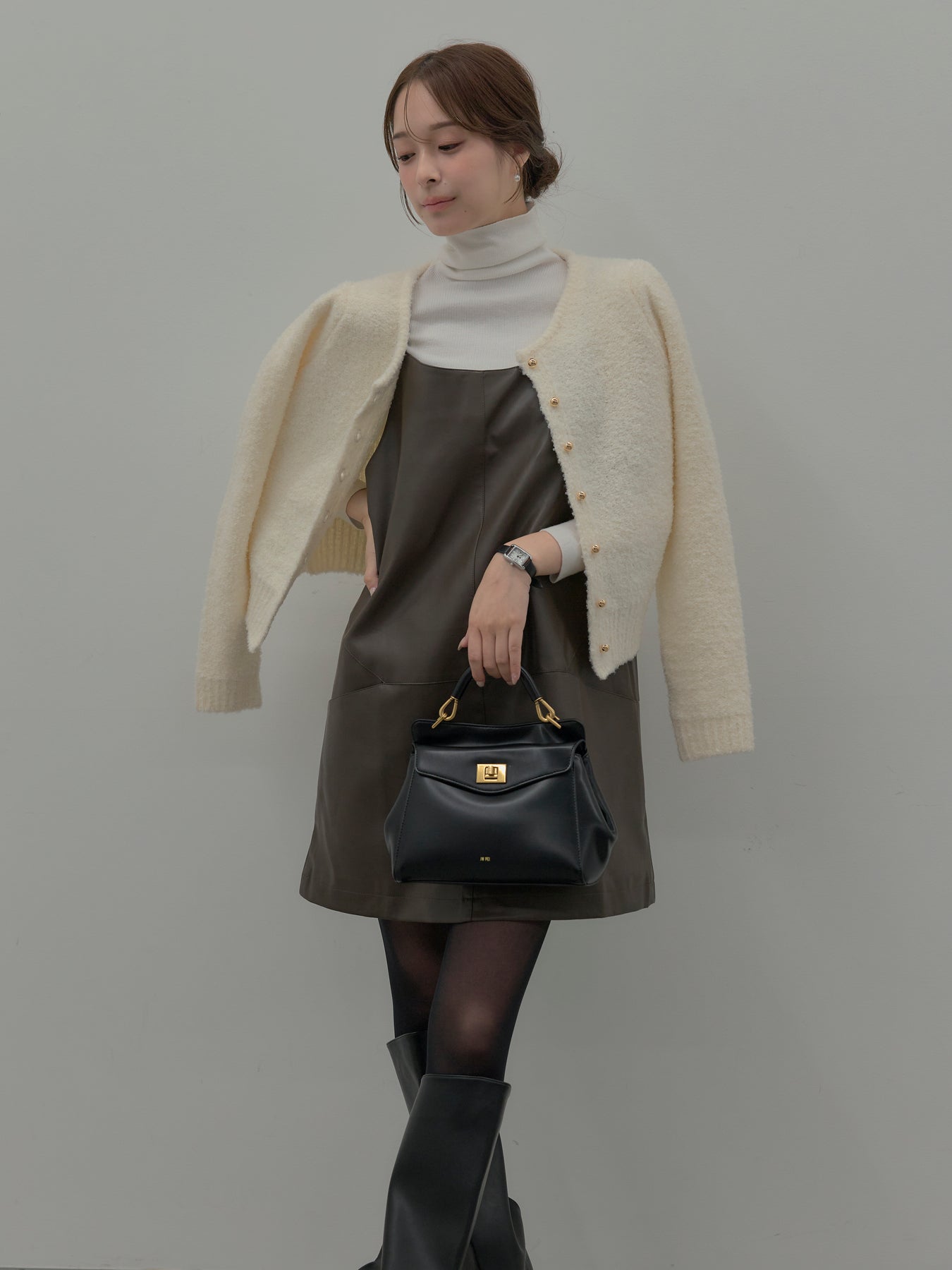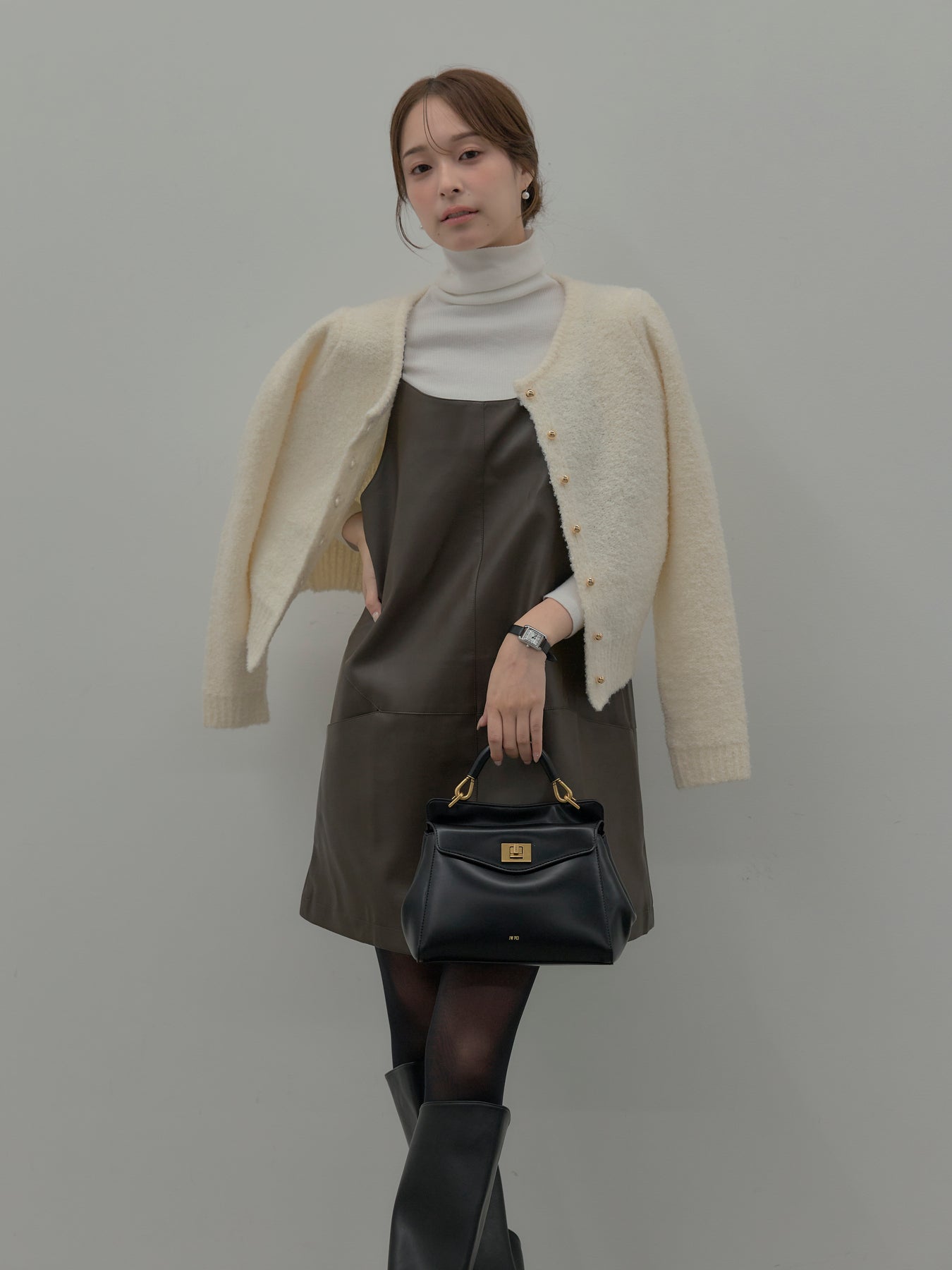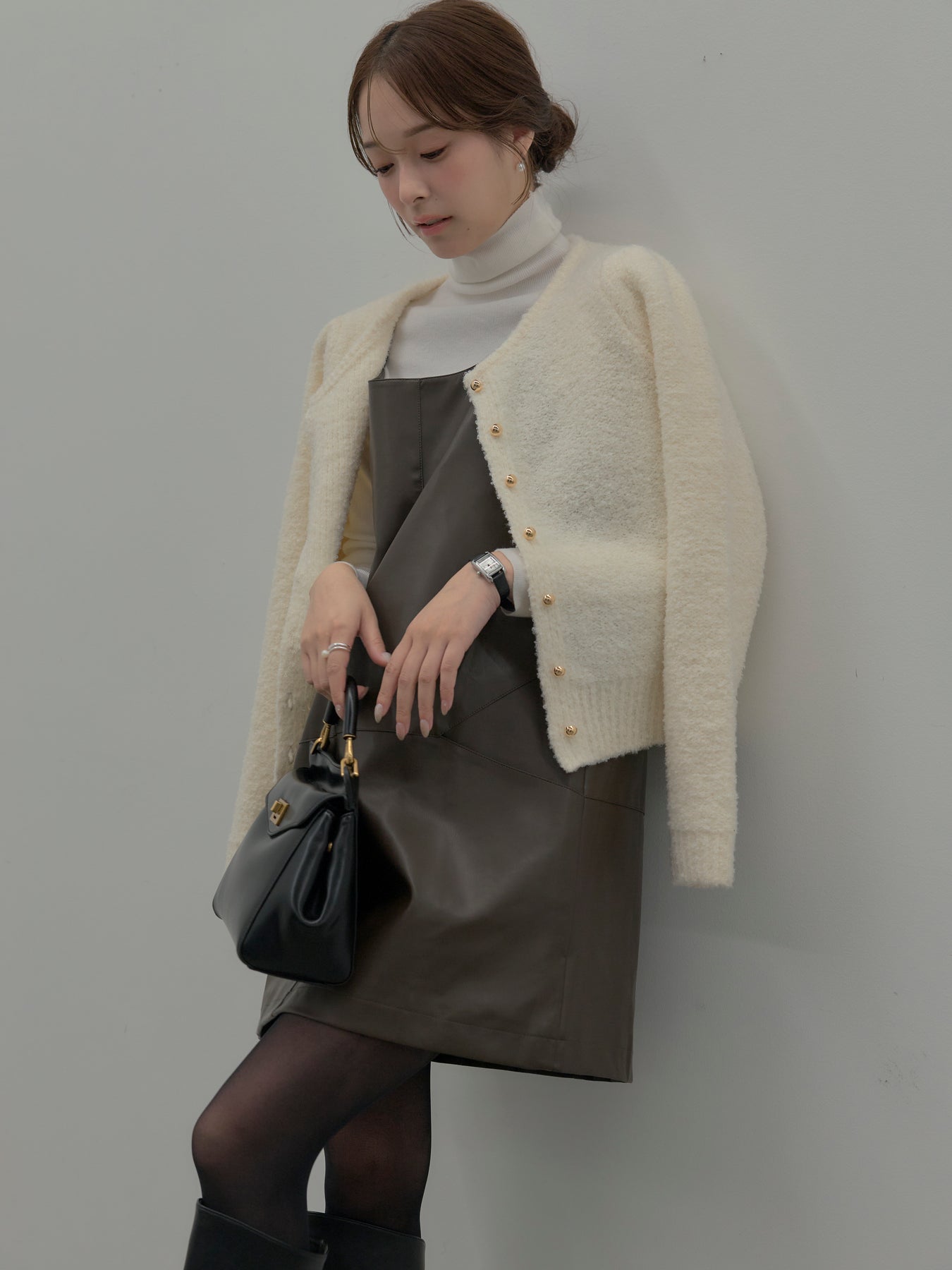 【SET】プードルニットパフスリーブカーディガン+レザーキャミソールワンピース(2set)