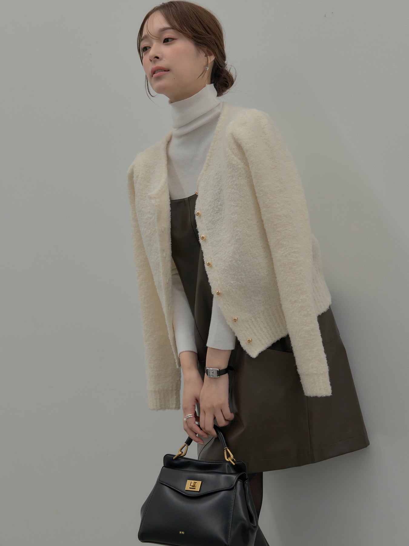 ふんわりとしたプードルタッチの素材が可愛らしい表情をつくるカーディガン。 程よいボリュームのパフスリーブで女性らしいシルエットに仕上げました。 羽織るだけで温もりと華やかさが加わる、主役級アイテムです。