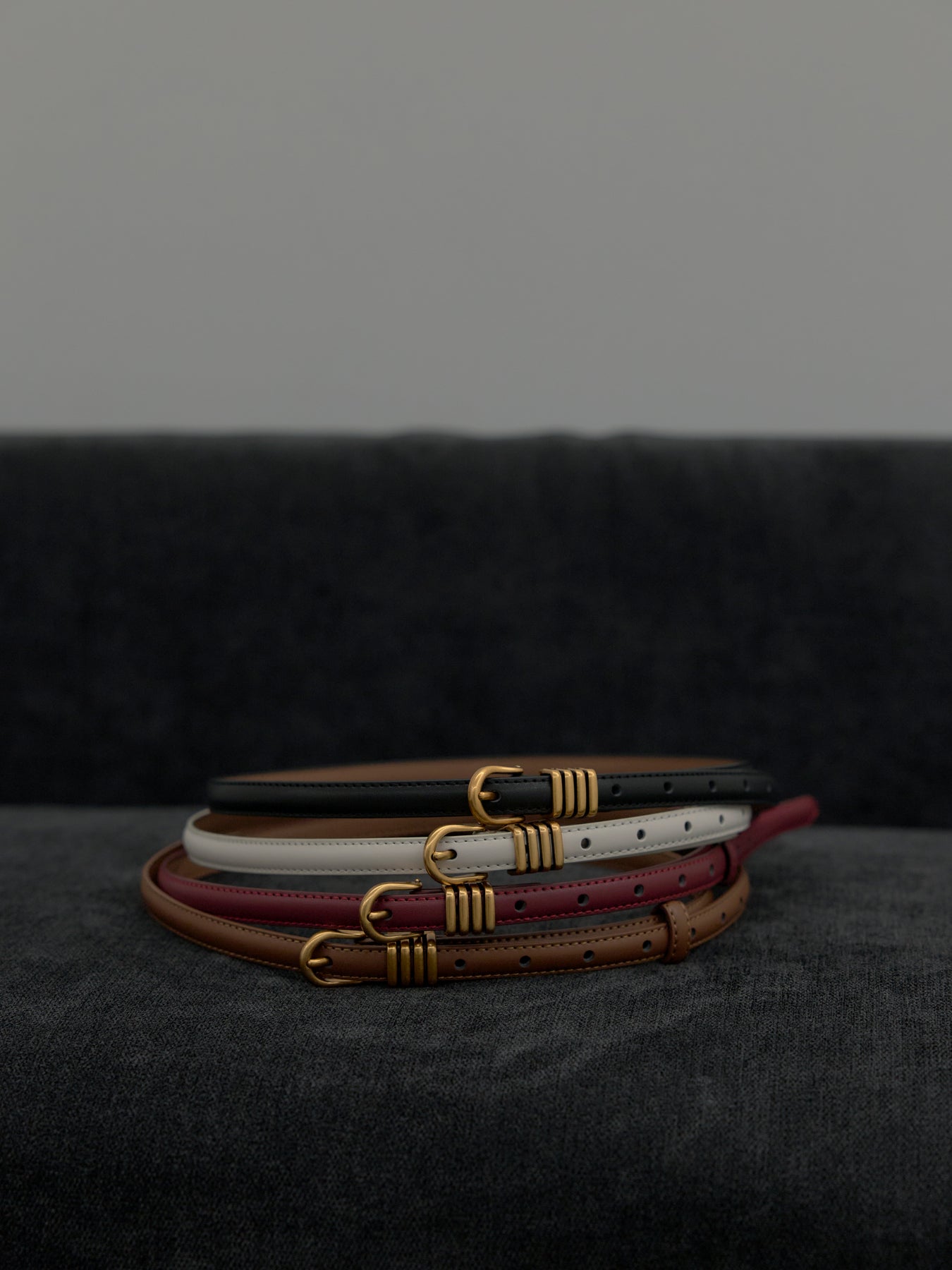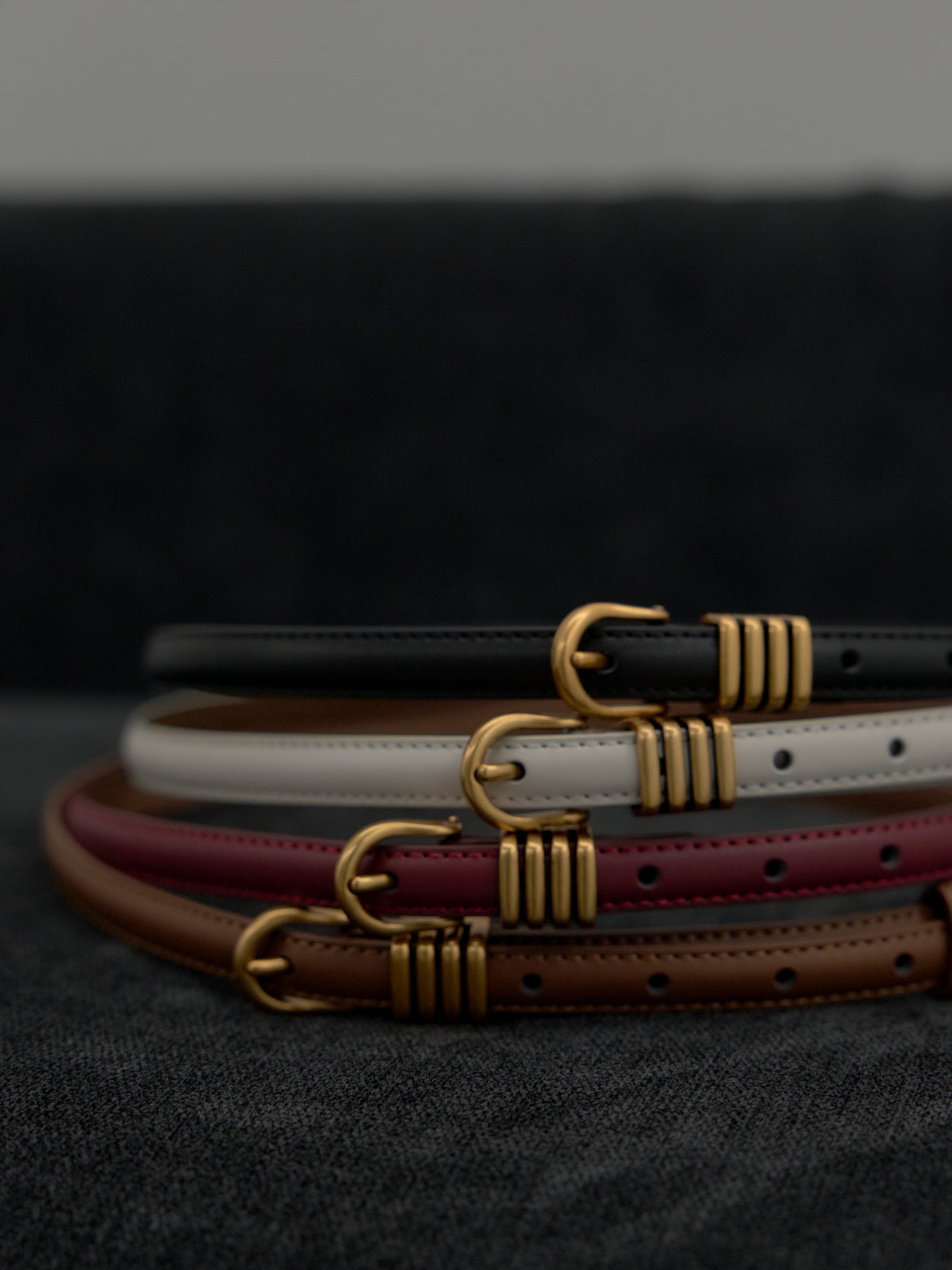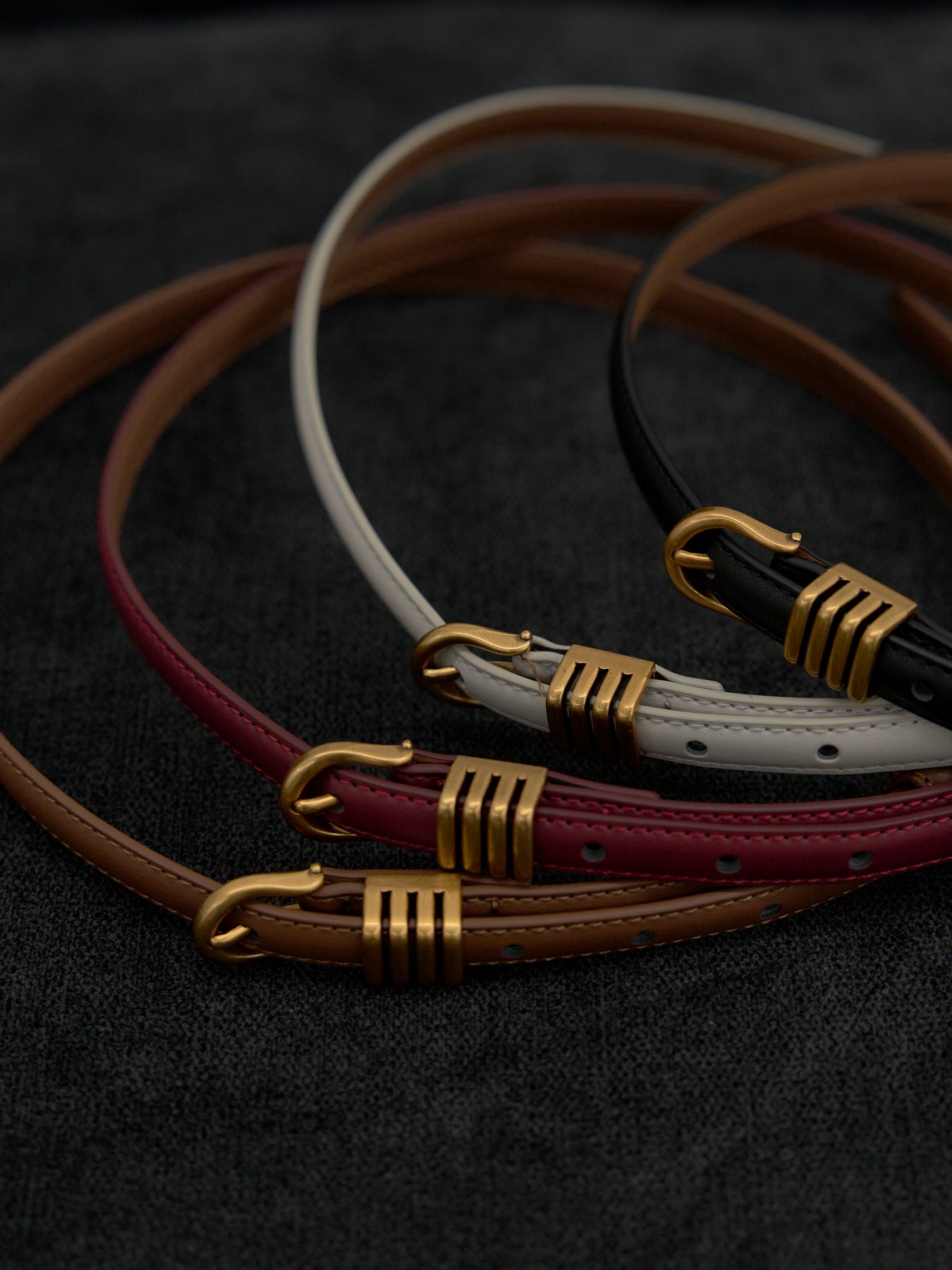 上品なゴールドのミニバックルがさりげなくアクセントになるベーシックベルト。 細身のデザインで合わせるアイテムを選ばず、ウエストマークに取り入れるだけでコーデをすっきりと引き締めます。 デイリーに活躍する万能小物です。
