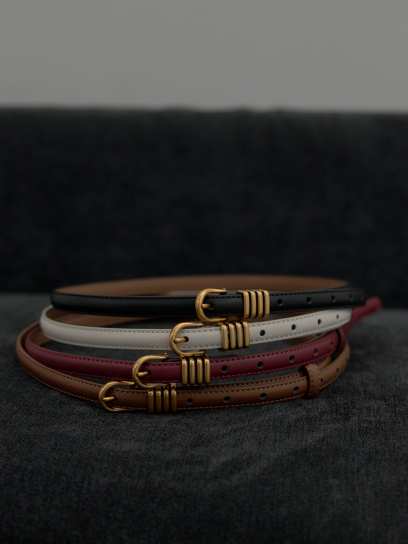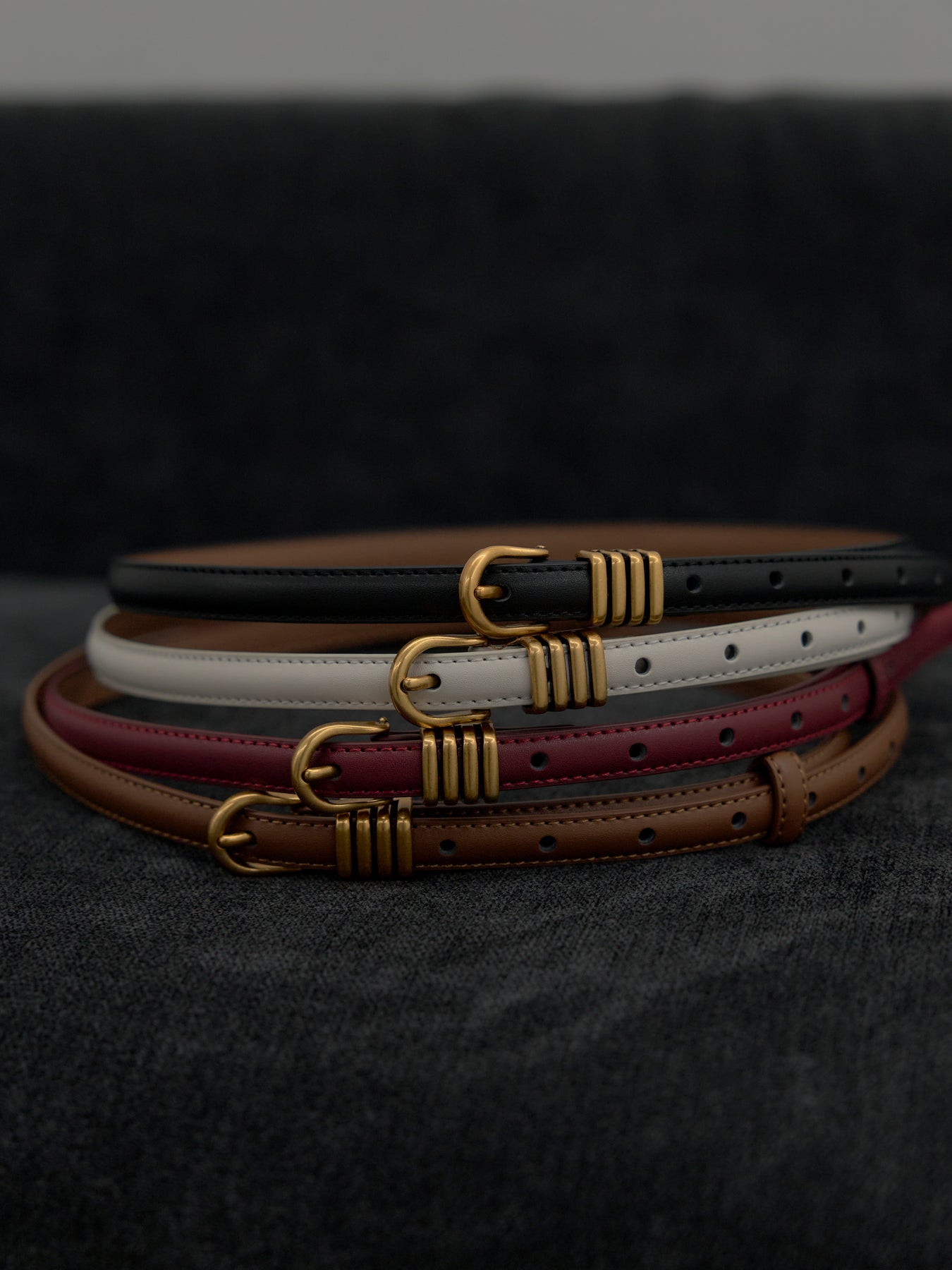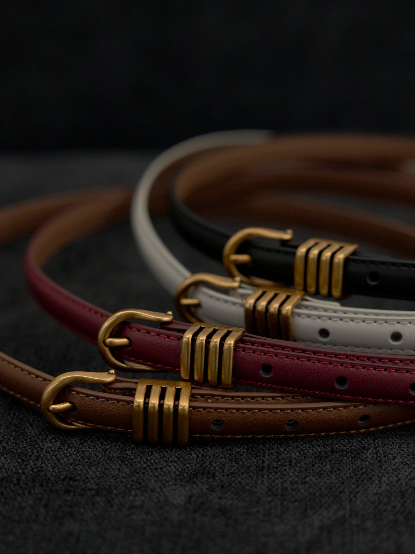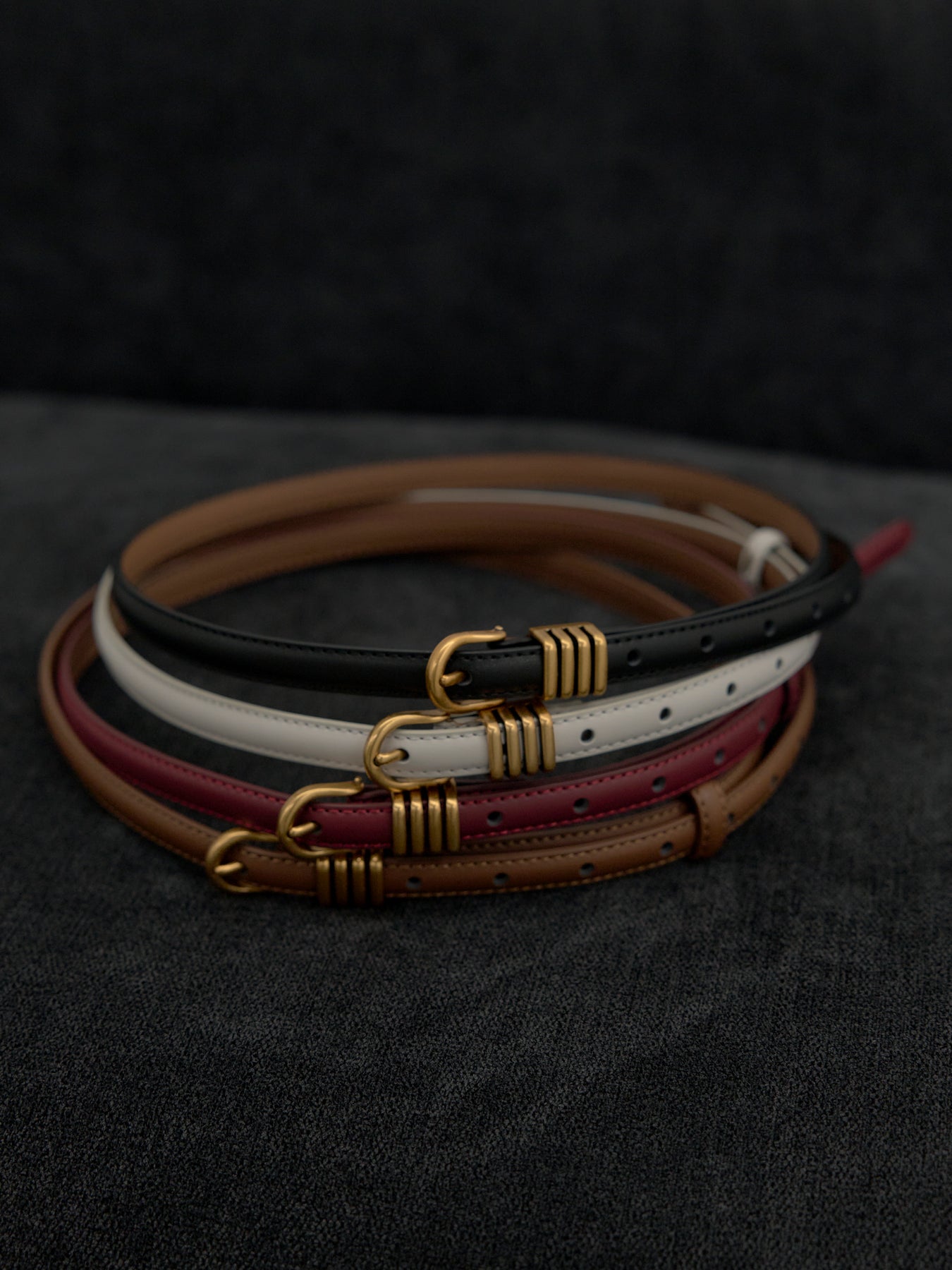上品なゴールドのミニバックルがさりげなくアクセントになるベーシックベルト。 細身のデザインで合わせるアイテムを選ばず、ウエストマークに取り入れるだけでコーデをすっきりと引き締めます。 デイリーに活躍する万能小物です。