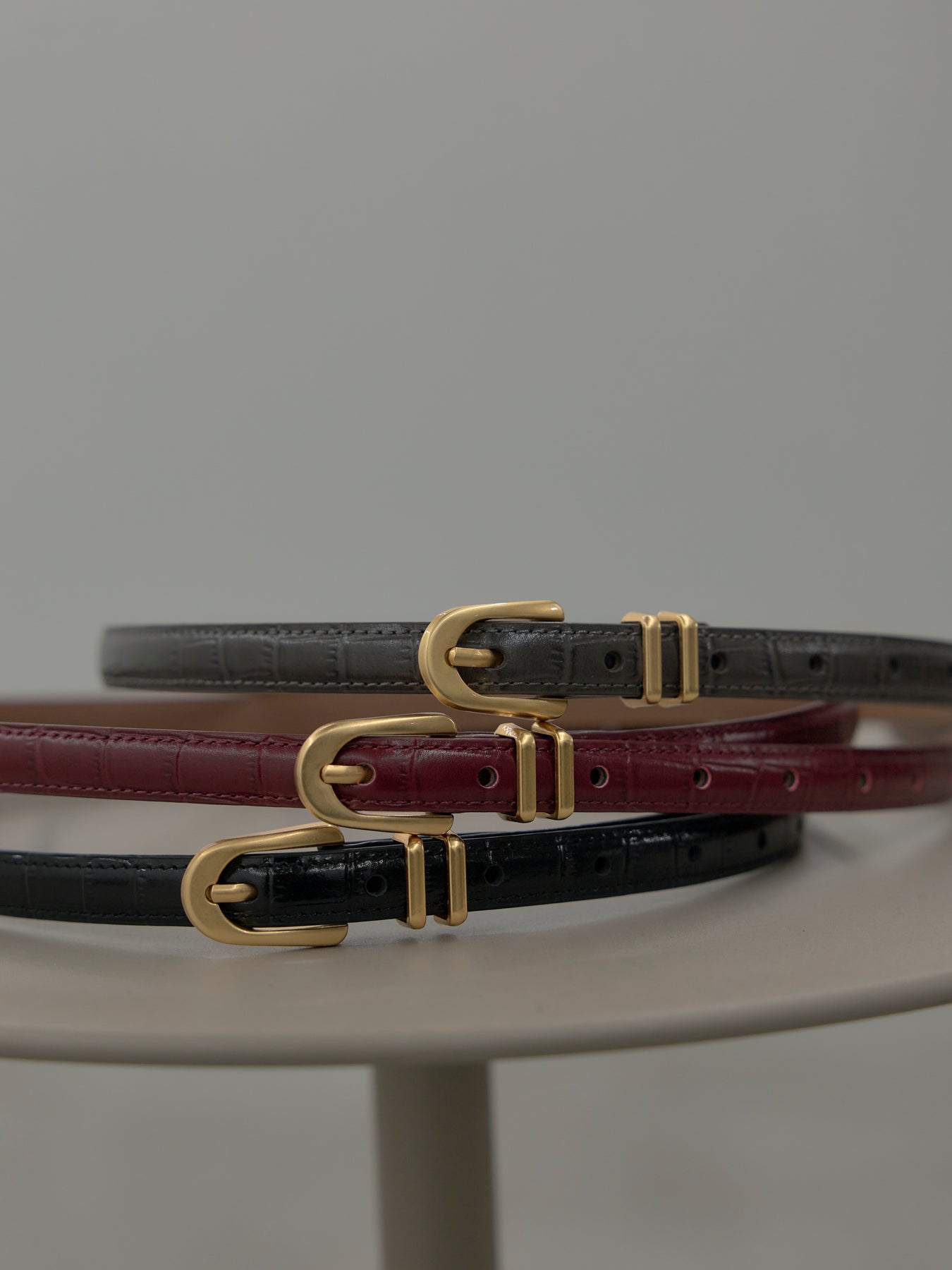 クロコ調のエンボス加工が上品な存在感を添えるミニバックルベルト。 細身シルエットで取り入れやすく、ウエストマークするだけでコーデにメリハリをプラス。 さりげないアクセントとしてデイリーに活躍する一本です。